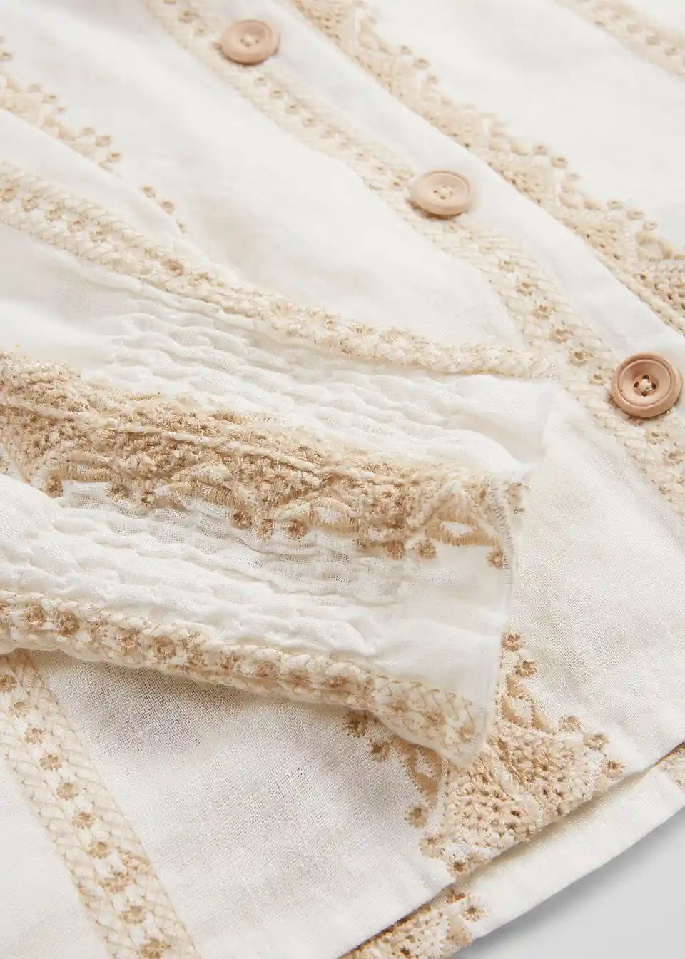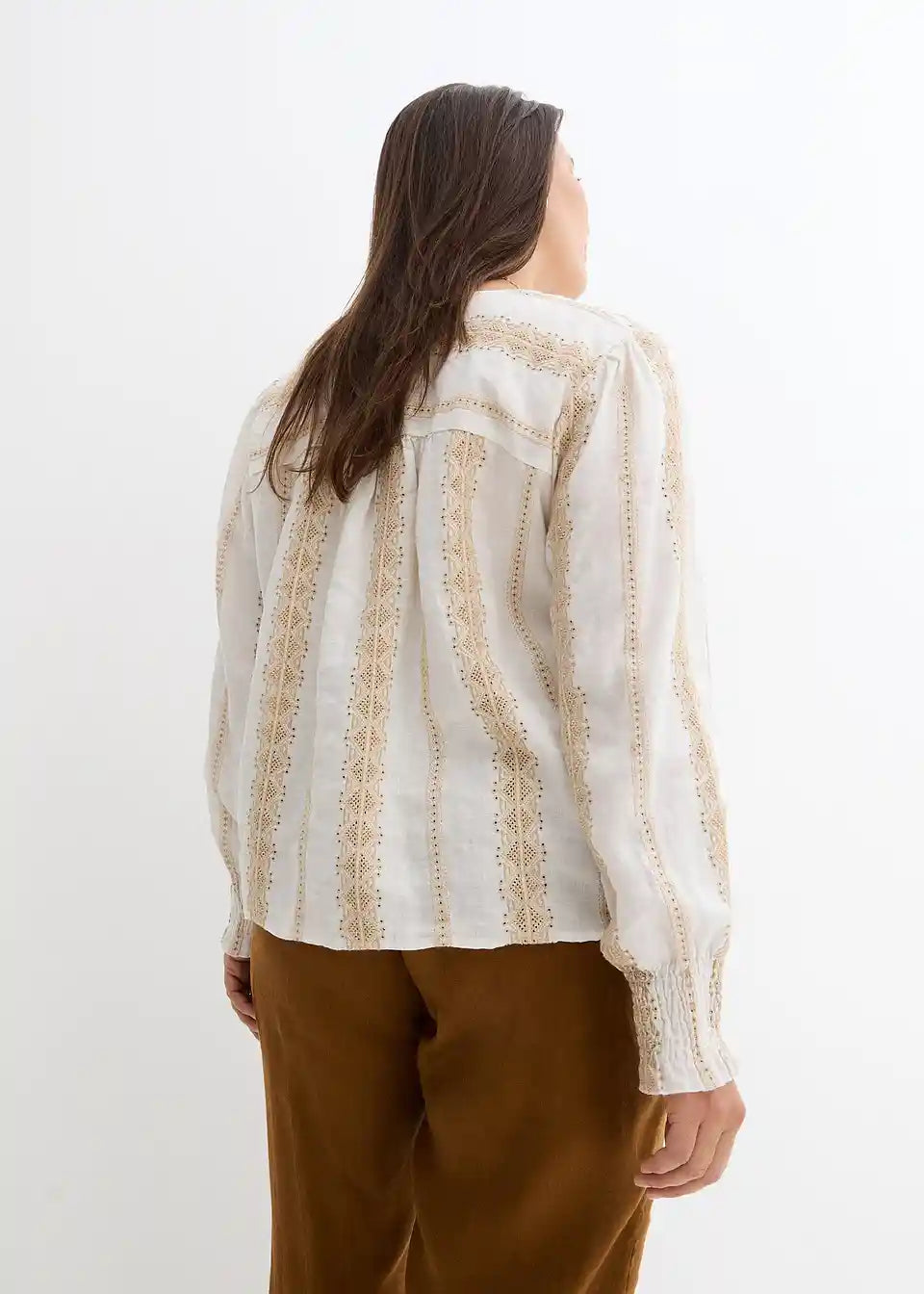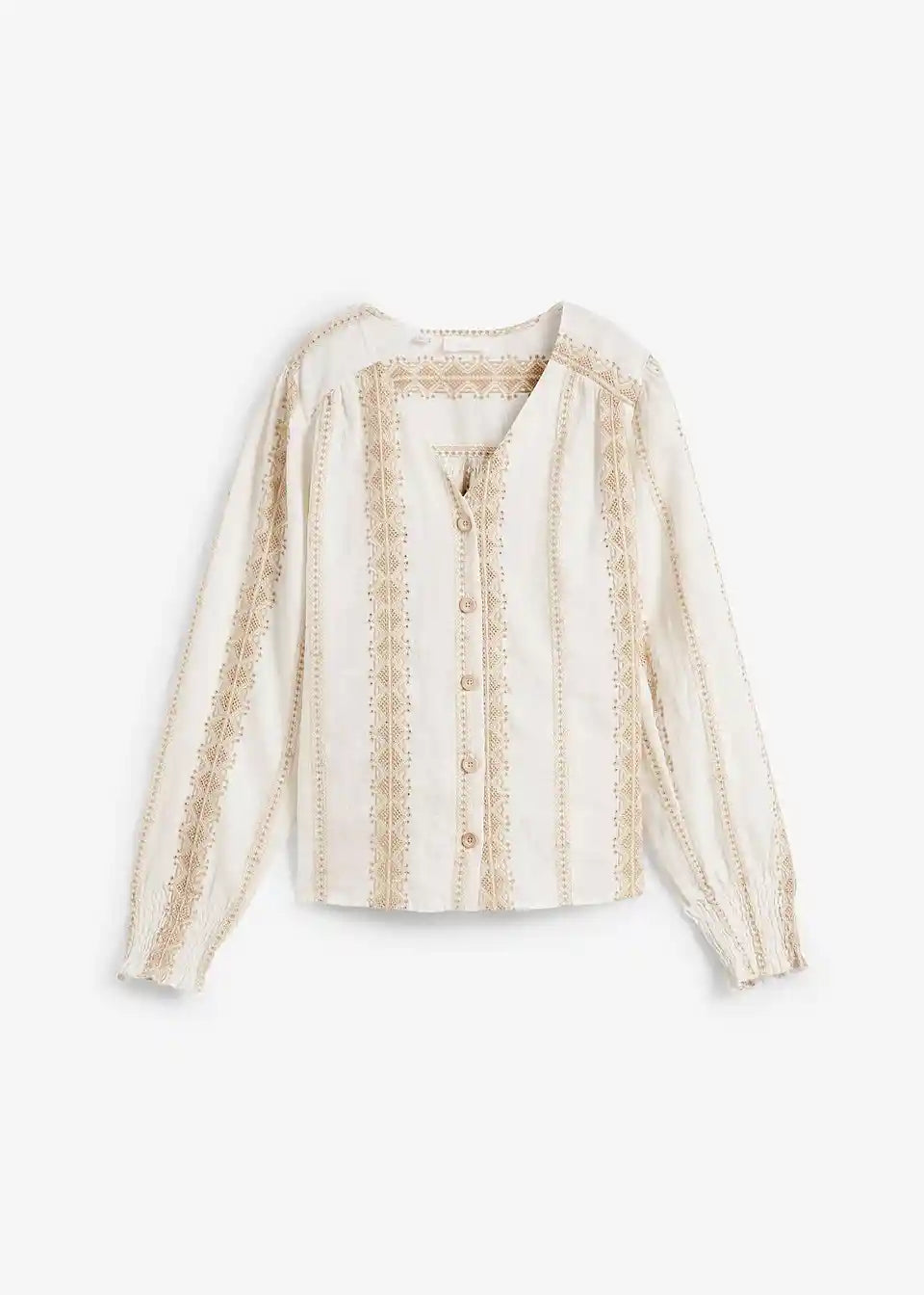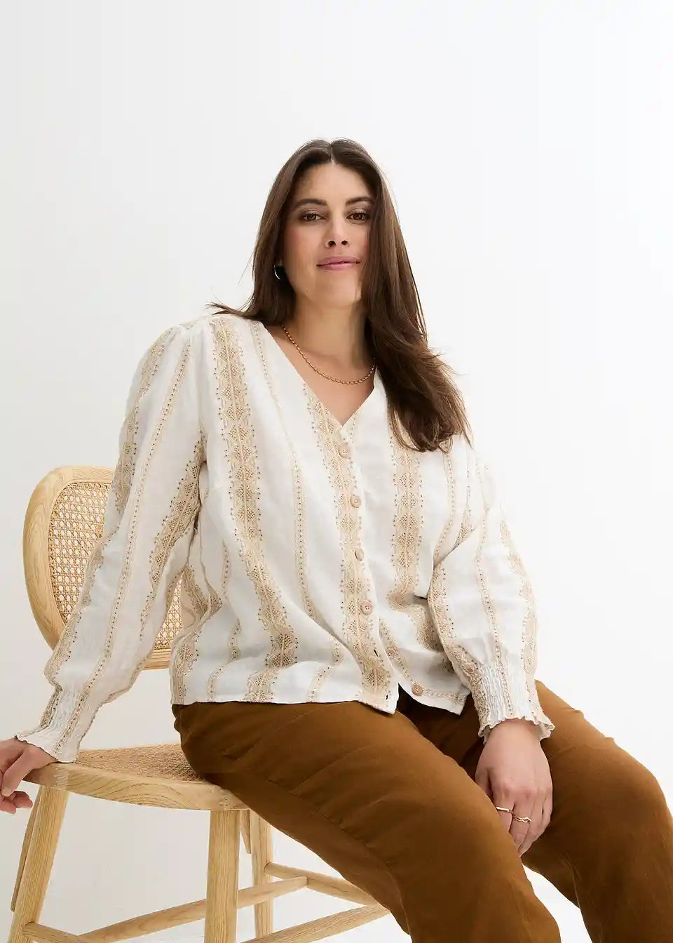 aparte Leinenbluse mit dekorativer Stickerei und Knöpfen in Holzoptik