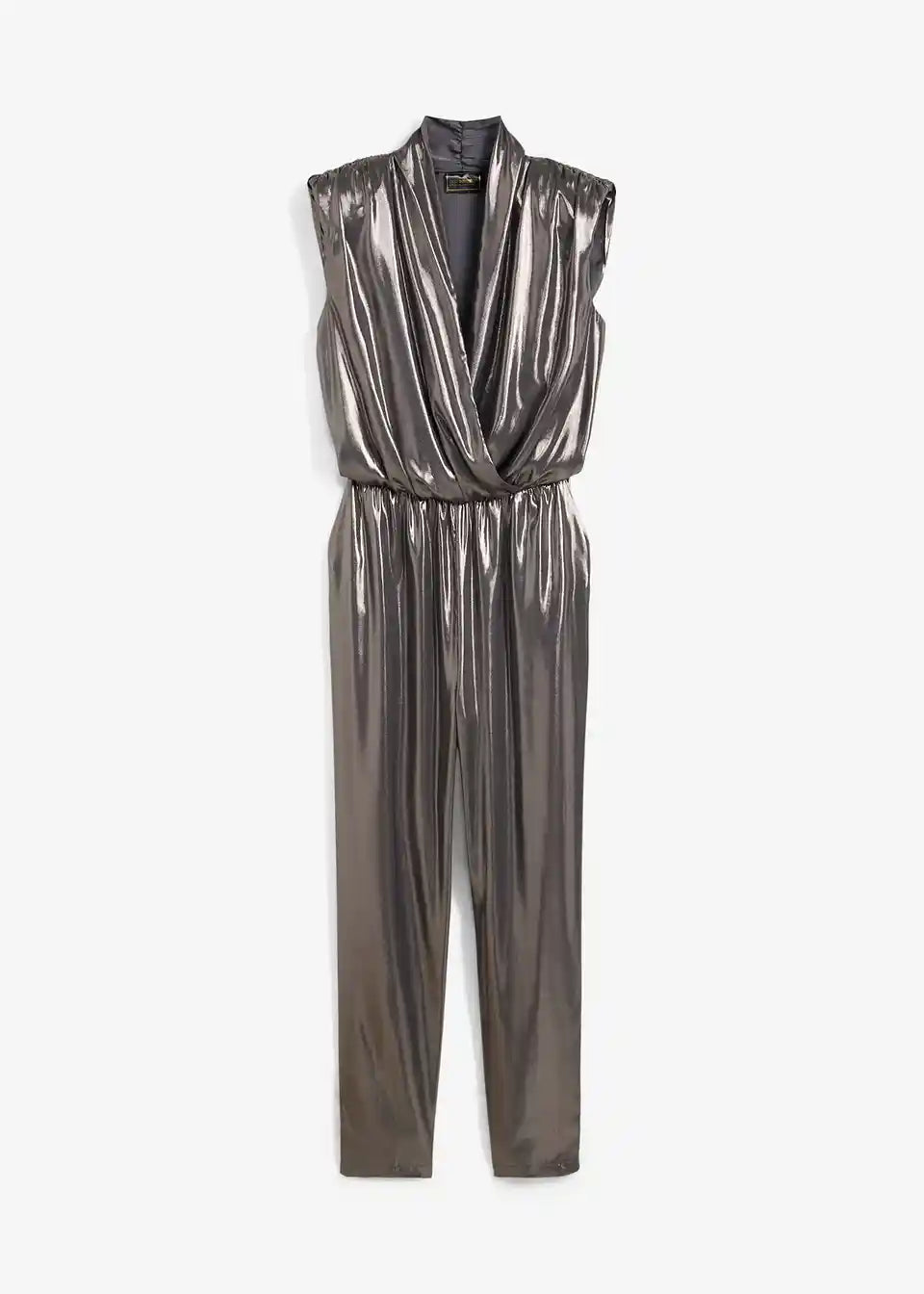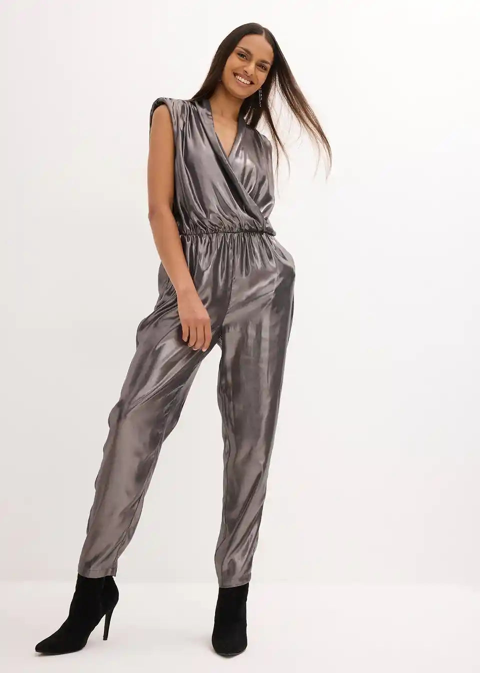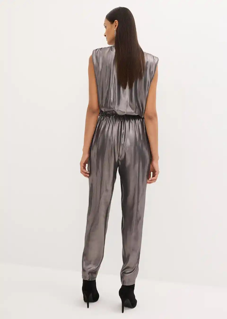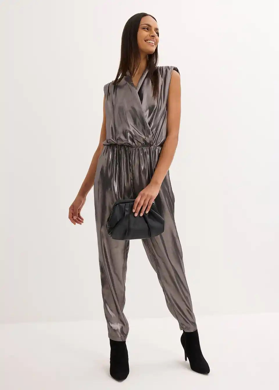 festliches Highlight: ärmelloser Overall mit elegantem Glanzdruck und moderner Schulterbetonung