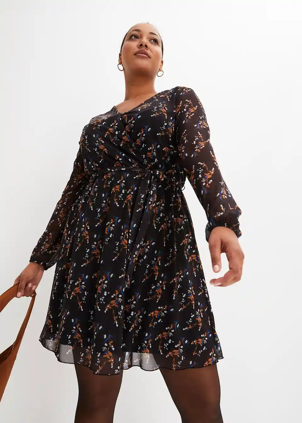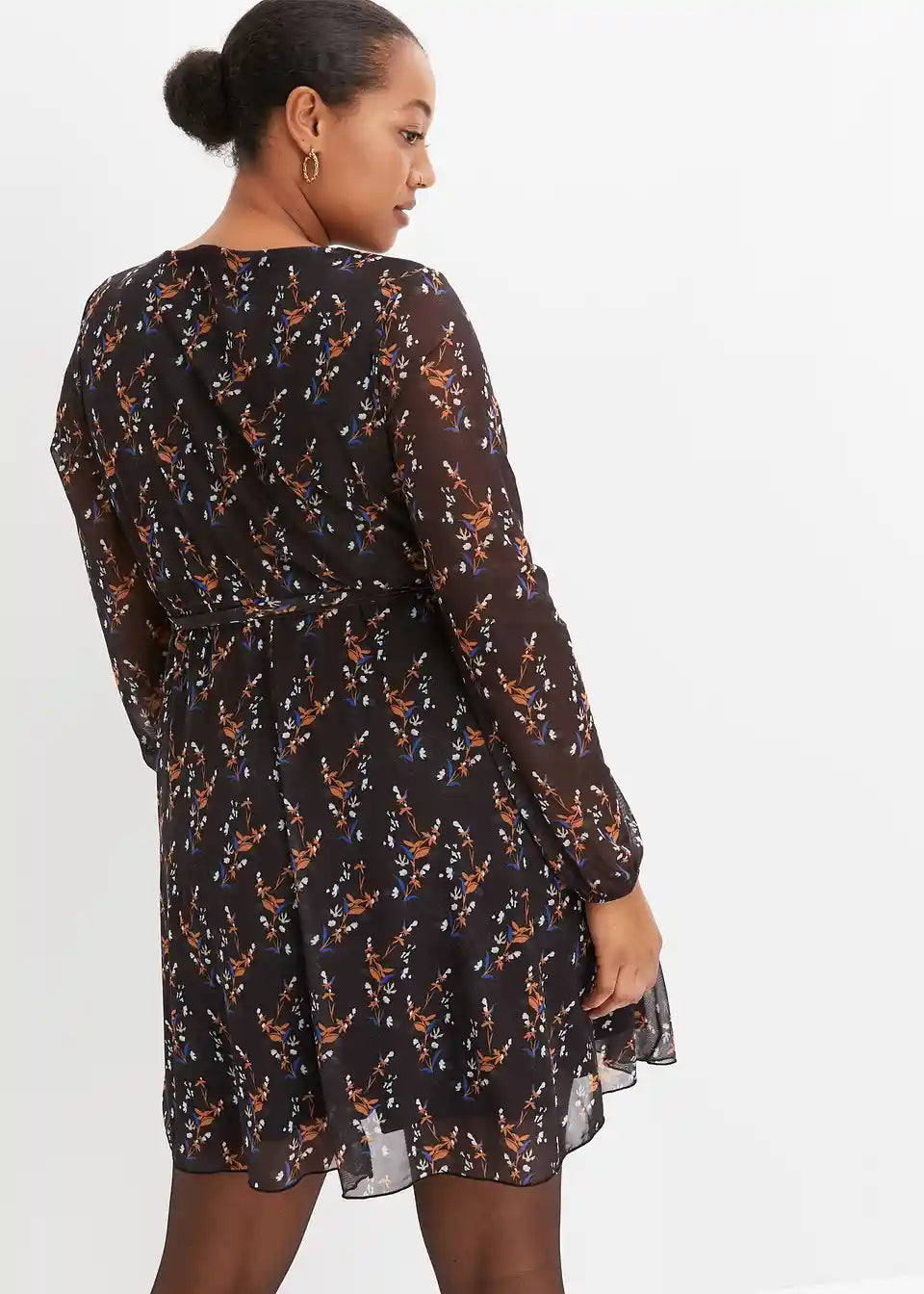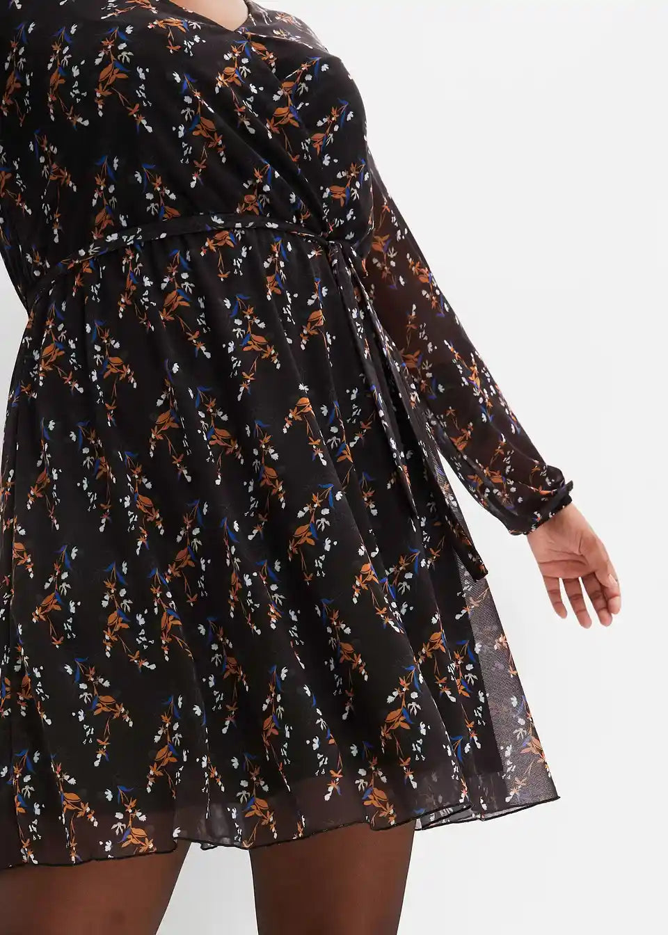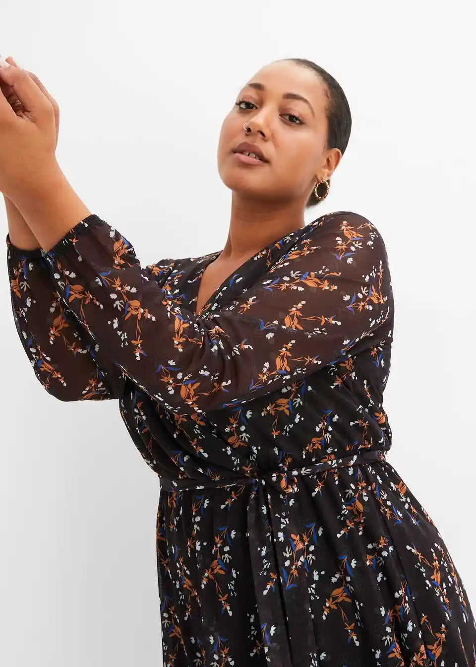 Modisches Jersey-Mesh-Kleid mit transparenten Ärmeln.