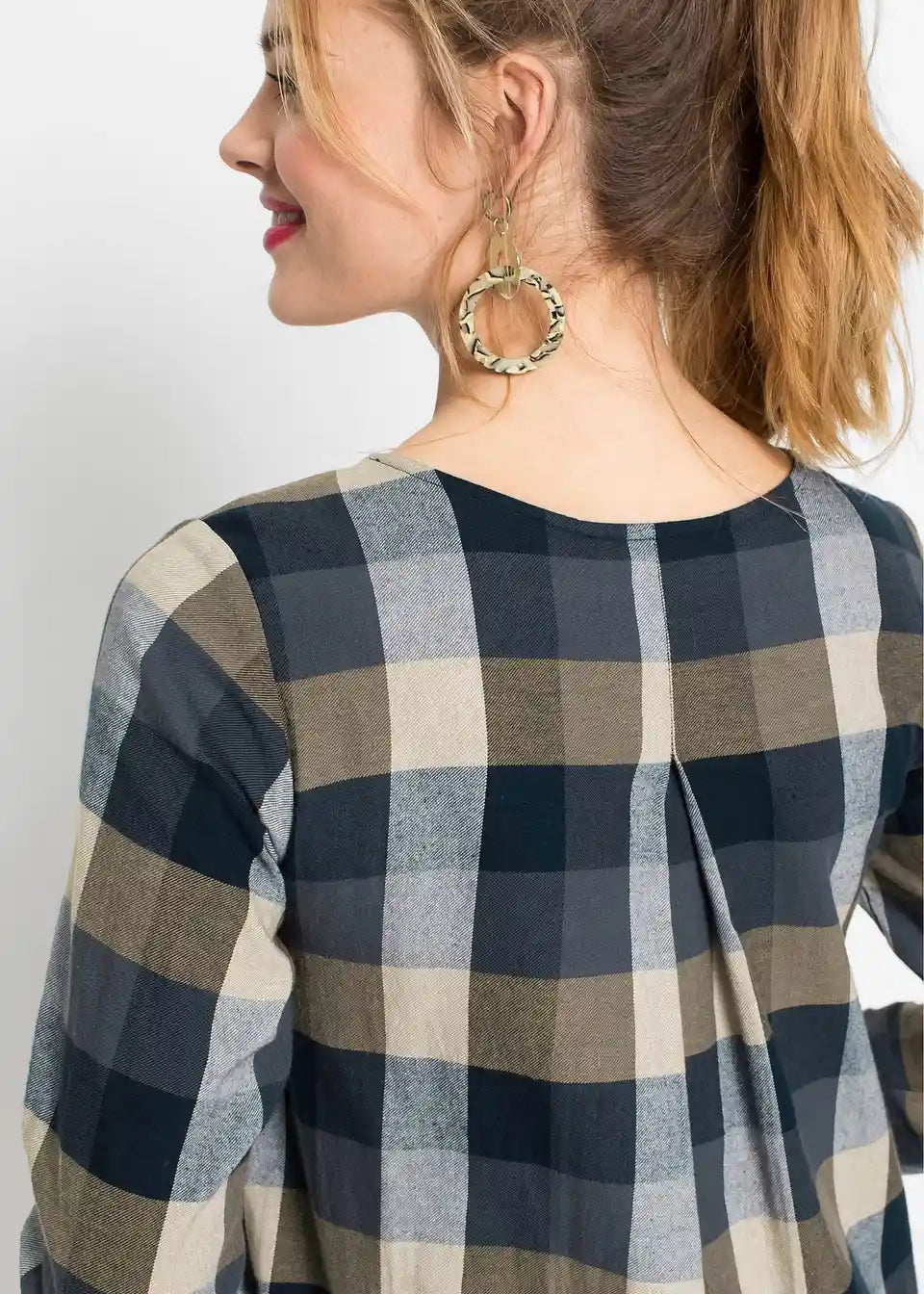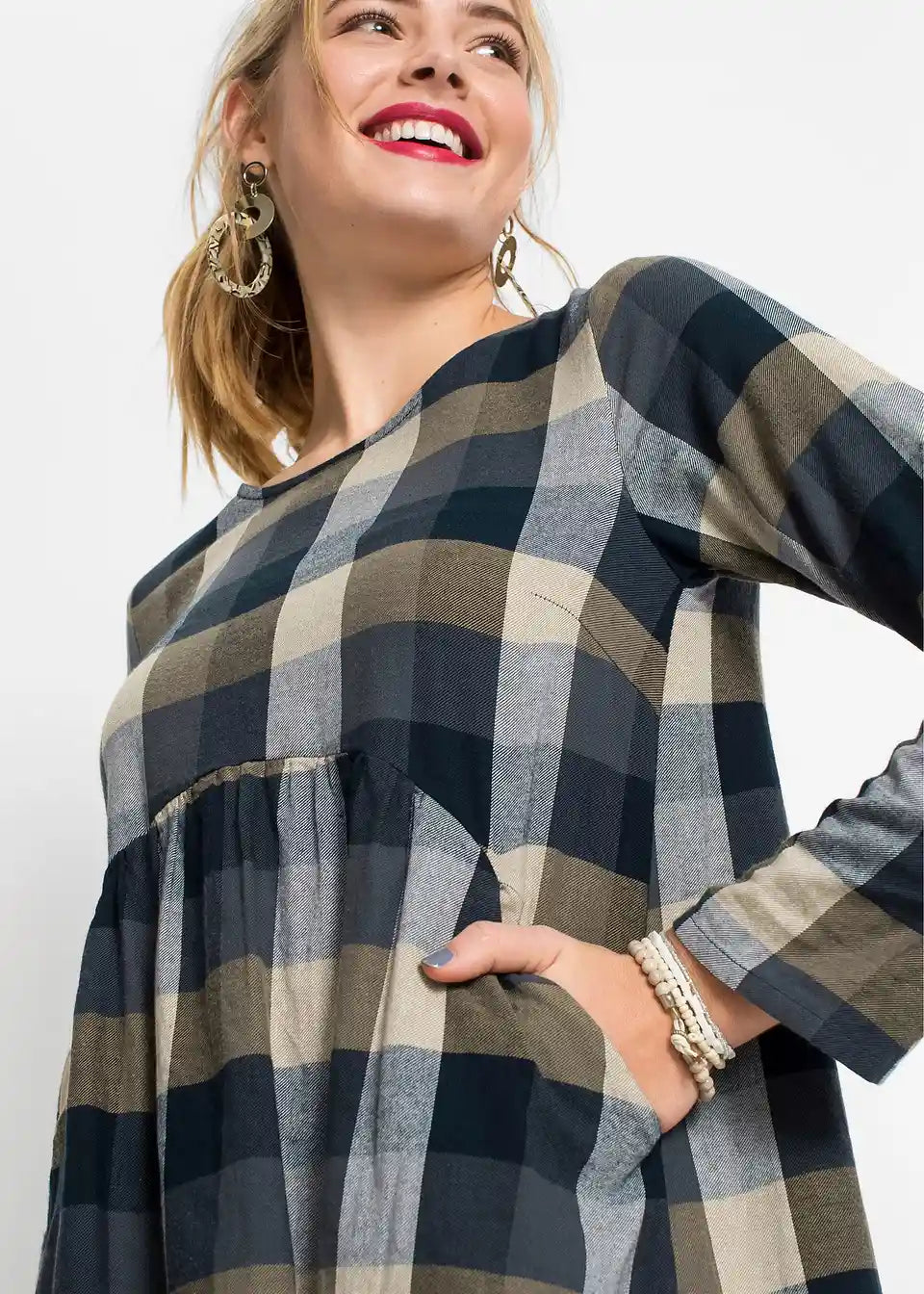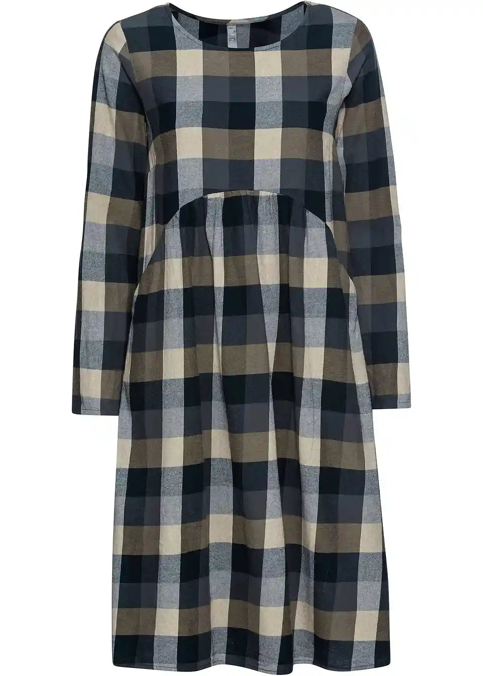 Modernes, knielanges Kleid mit langen Ärmeln und Taschen.