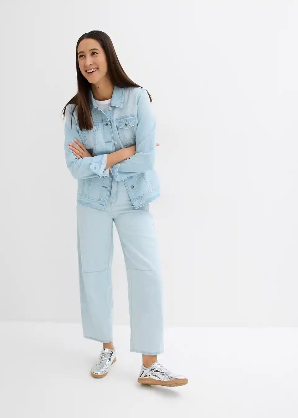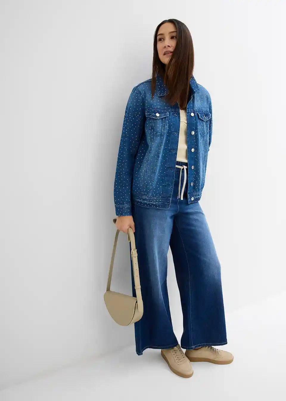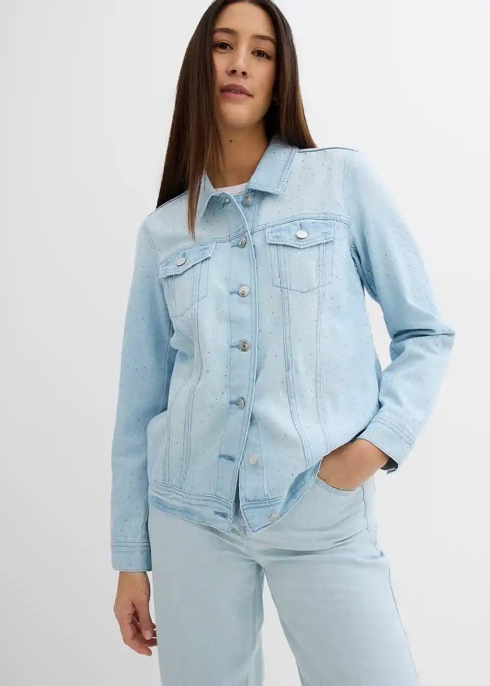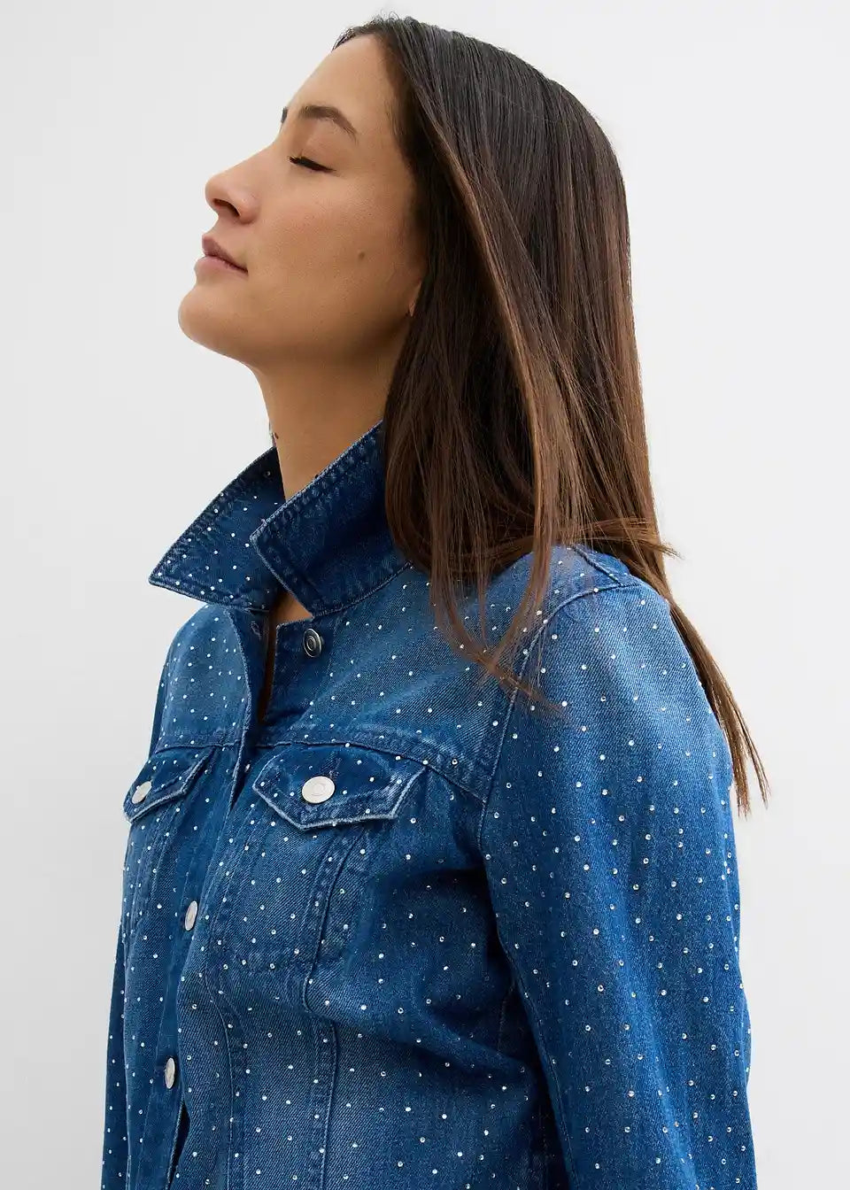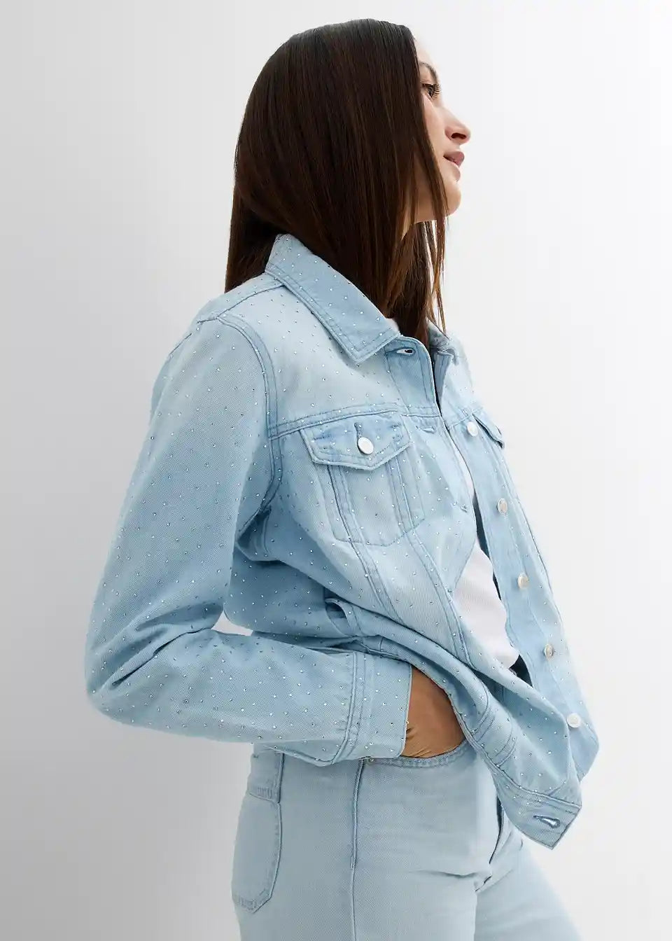 Modische Jeansjacke mit Waschung und verziert mit Strasssteinen