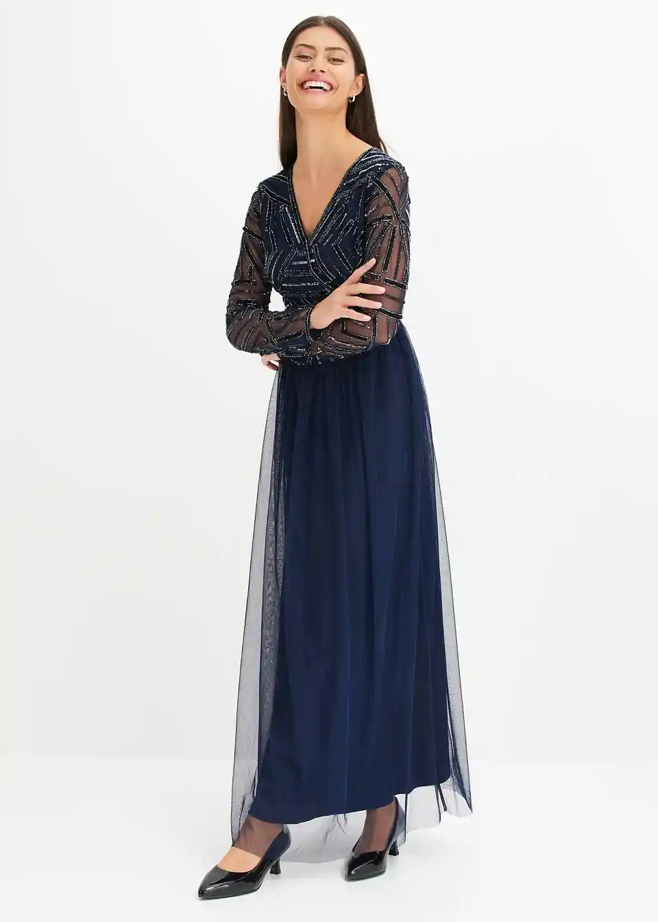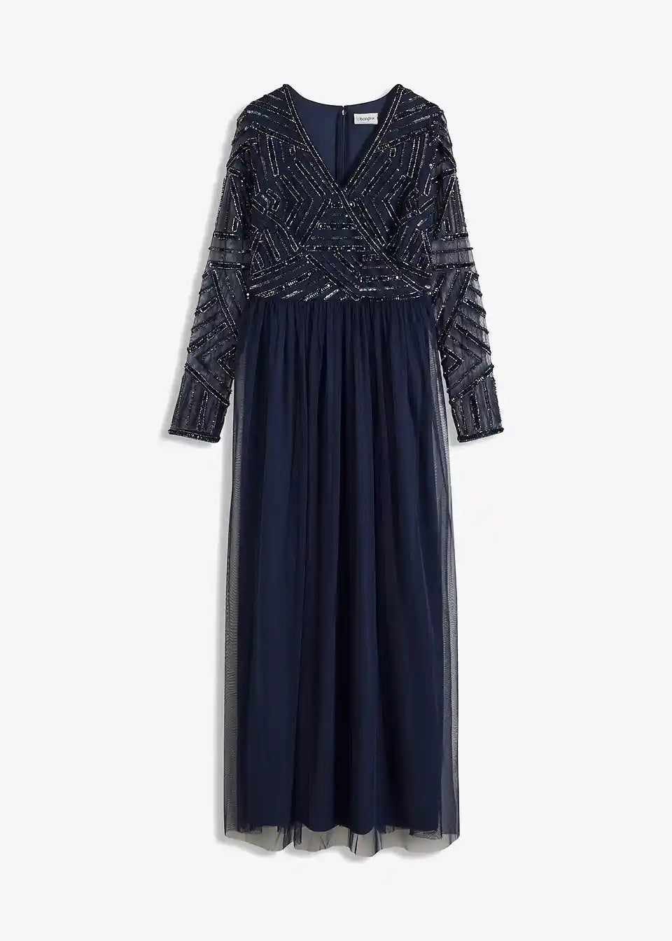 Bezauberndes Abendkleid mit gemusterter Paillettenstickerei im Oberteil und einem Mesh-Rock