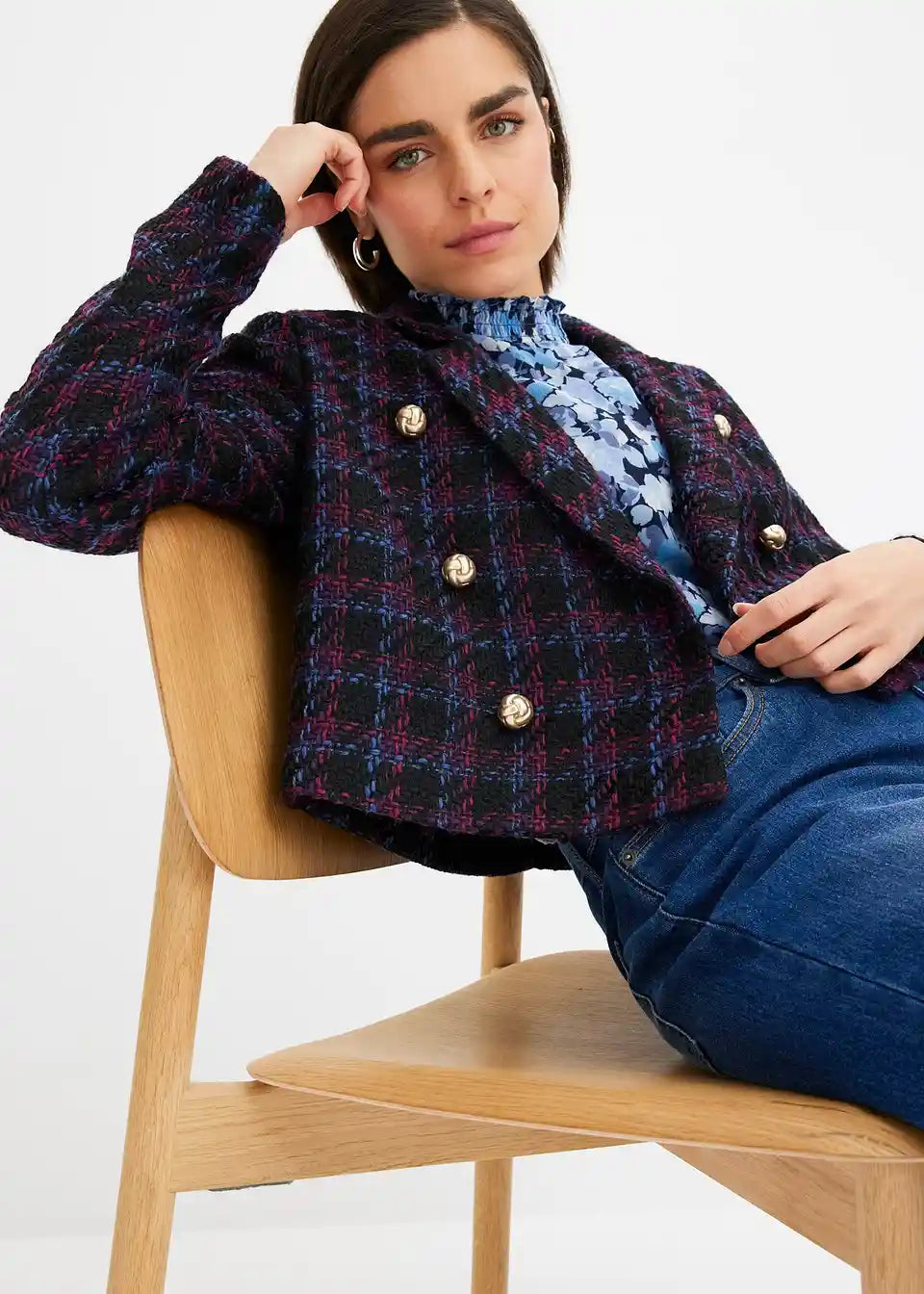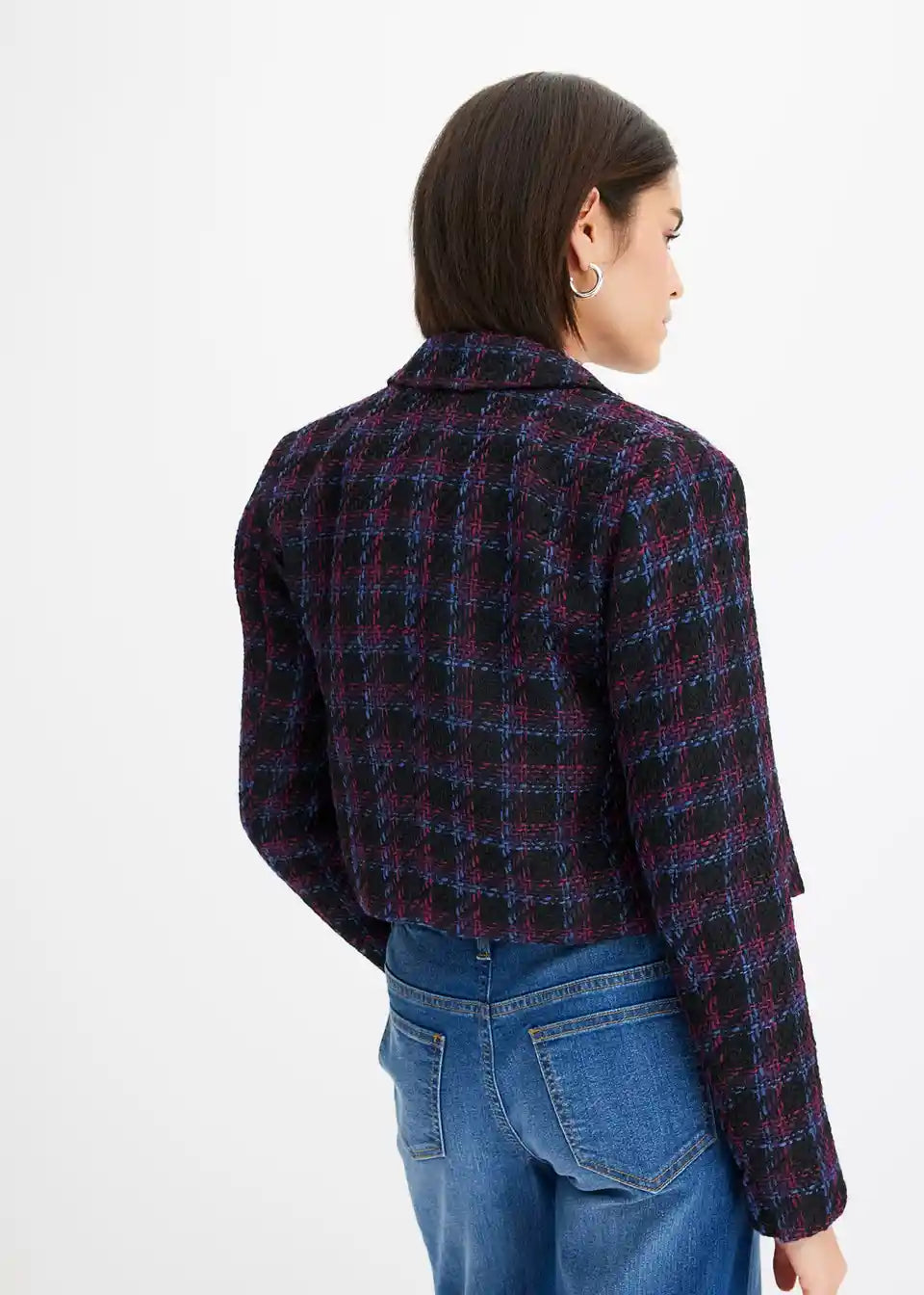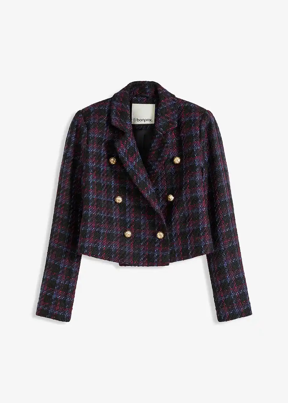 verkürzter Bouclé-Blazer mit Karo-Muster und dekorativen Knöpfen