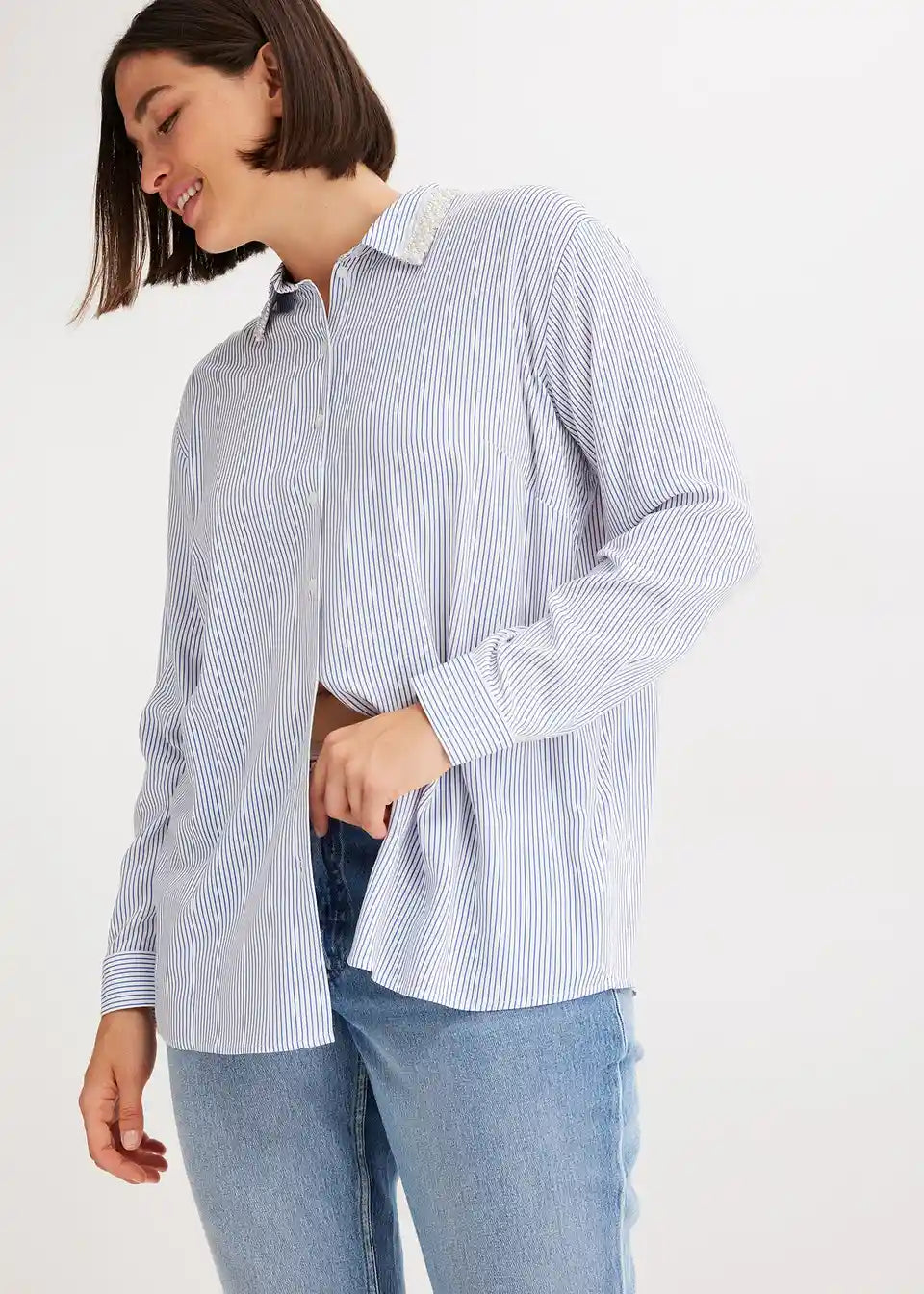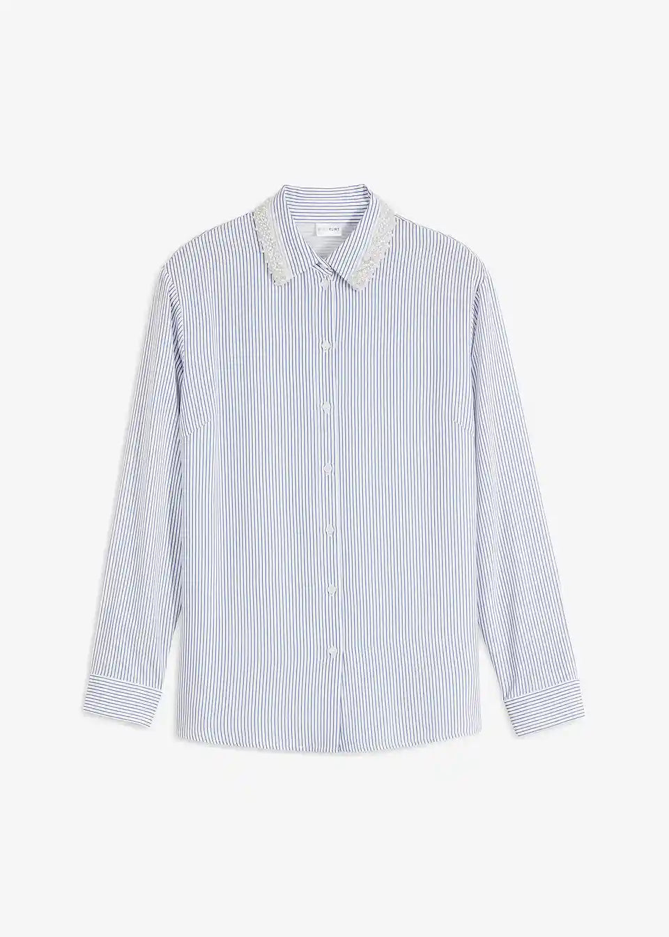 feminine Bluse mit dekorativer Perlen-Applikation am Kragen