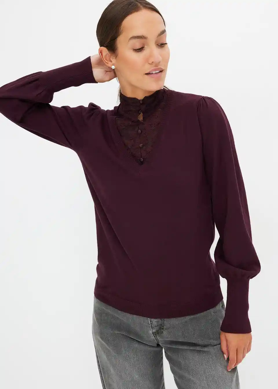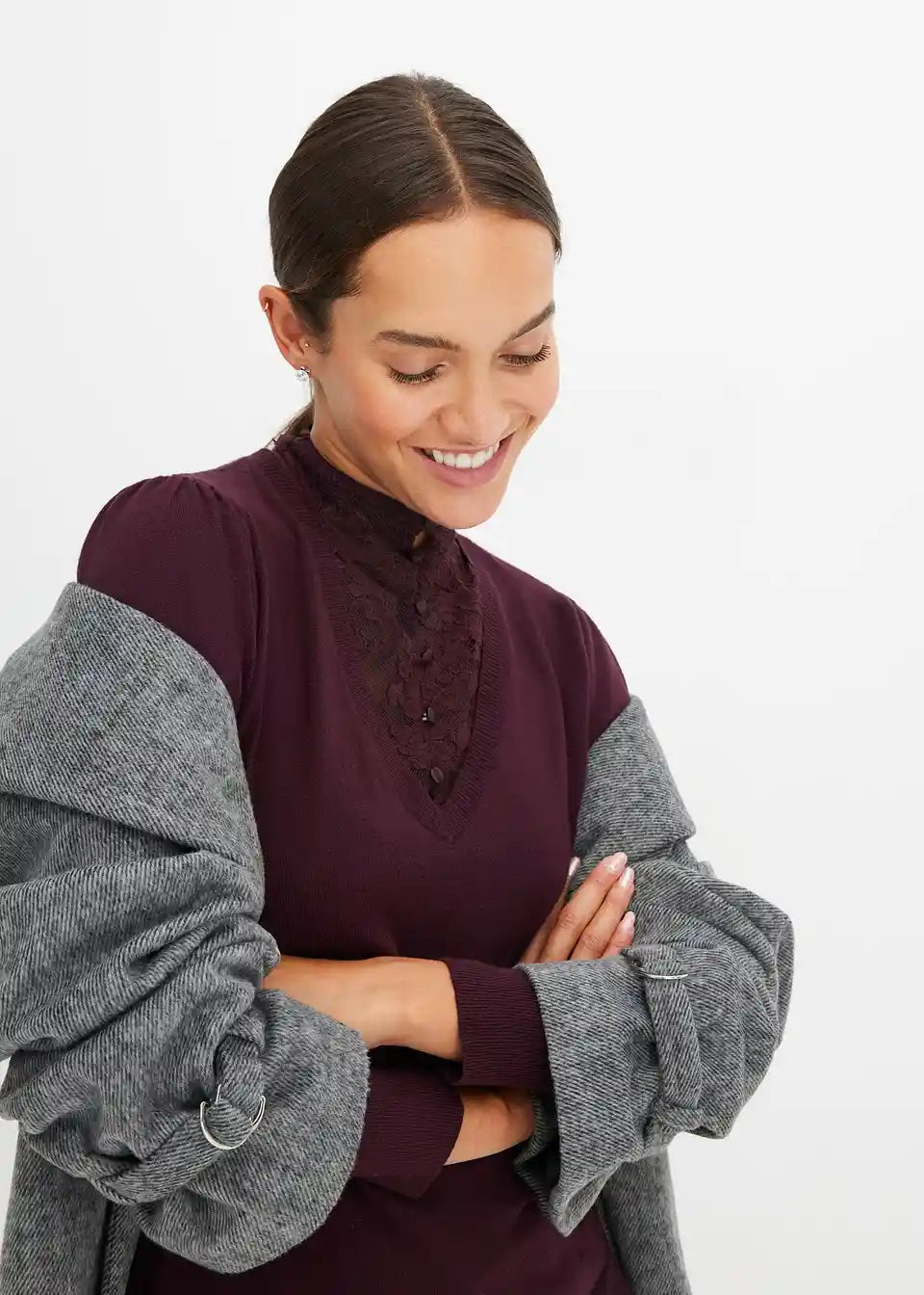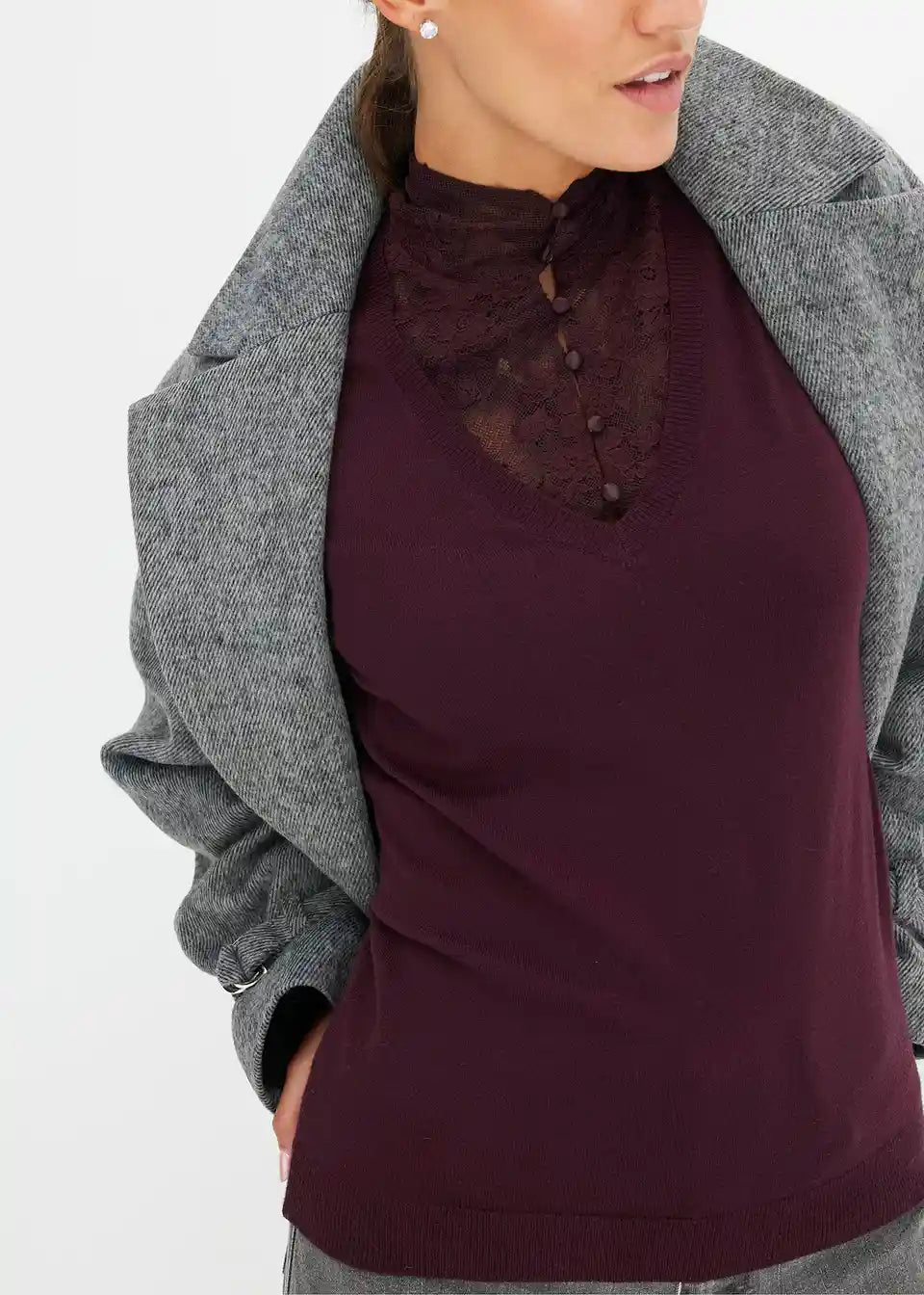 femininer Pullover mit Spitze am Kragen und Ausschnitt