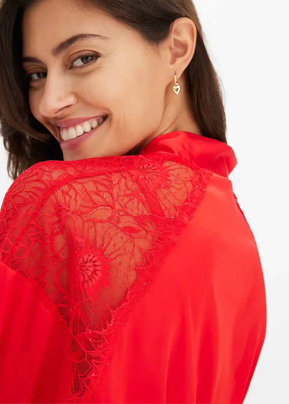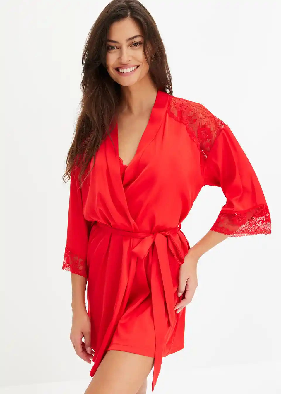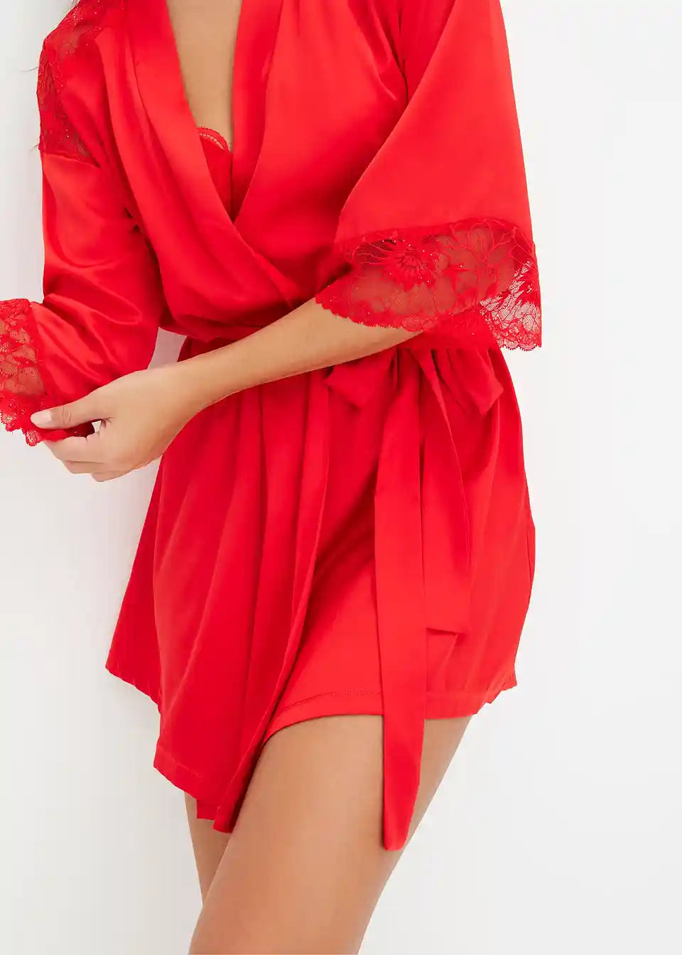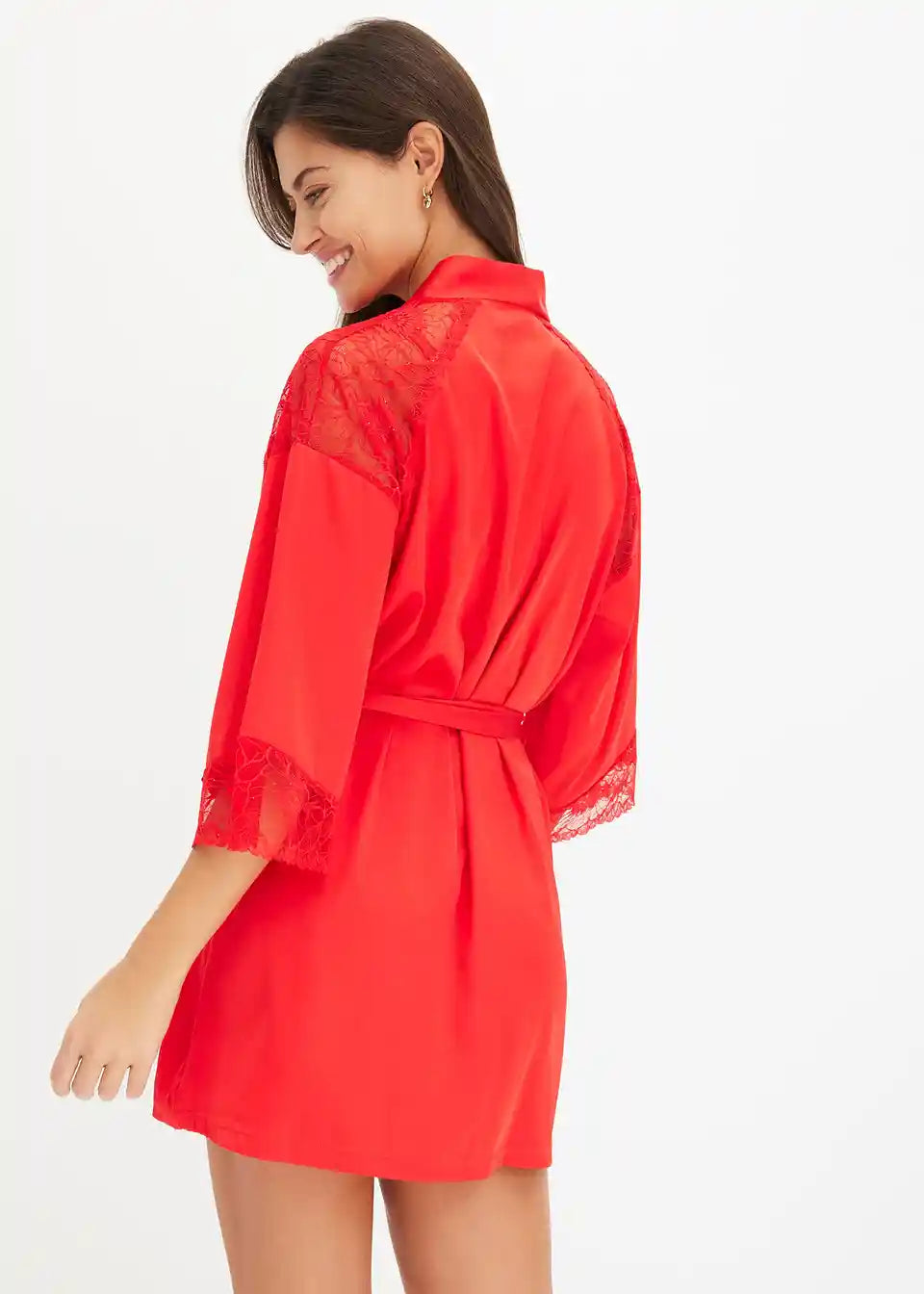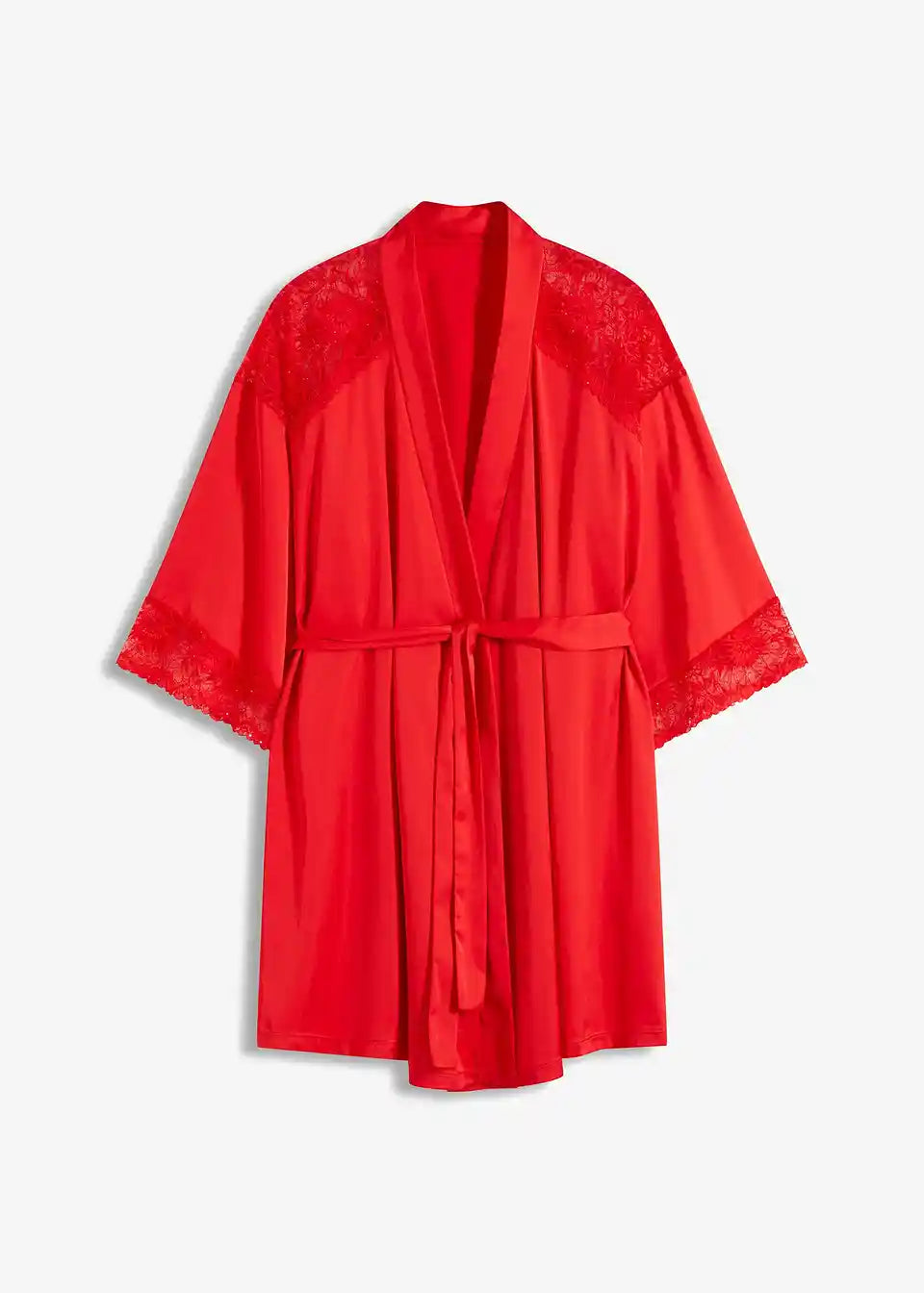 Edler, figurumspielender Kimono in atemberaubendem Rot und Spitze mit dezenten Pailletten
