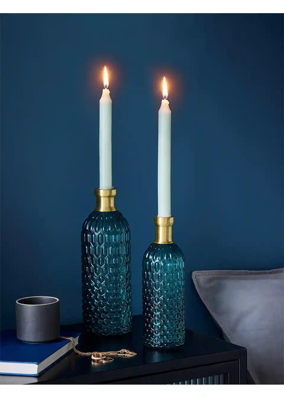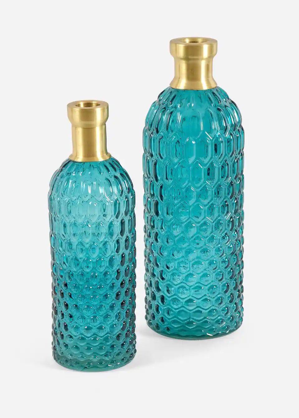 Entdecke unsere 2 Kerzenhalter in Flaschenformen in verschiedenen Höhen. Mit goldfarbenem Flaschenhals und schönem Relief im Glas sorgen sie für eine stimmungsvolle und gemütliche Atmosphäre. Perfekt, um Deinem Zuhause einen Hauch von Eleganz zu verleihen. Auch als Vase zu verwenden.