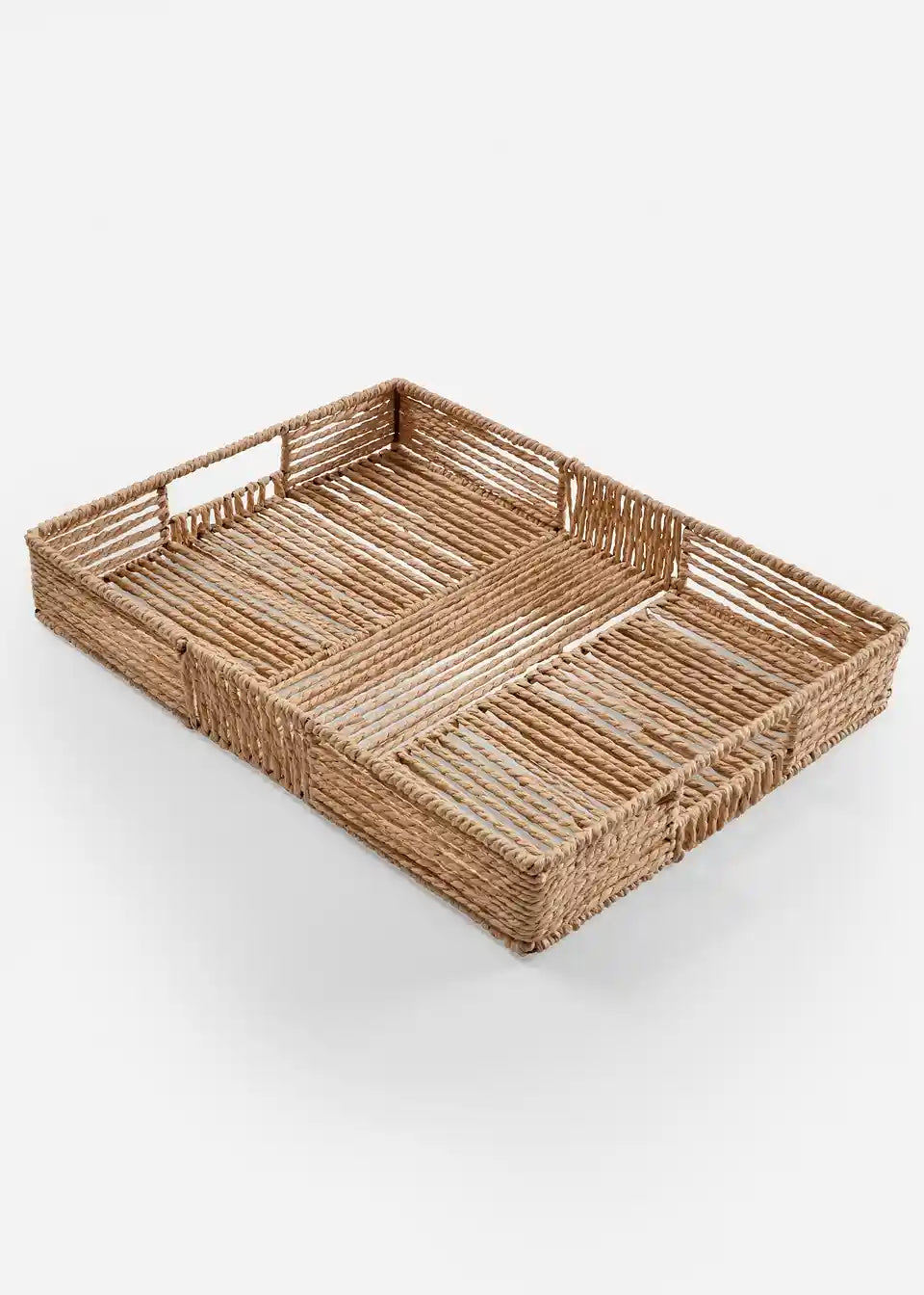 Das stilvolle Tablett vereint Funktionalität und ansprechendes Design und ist eine ideale Ergänzung für jede Einrichtung. Hergestellt aus natürlichem Material, bietet es ausreichend Platz für Snacks, Getränke oder Dekorationselemente und sorgt für eine elegante Präsentation. Die natürliche Farbgebung und die geflochtene Struktur verleihen dem Tablett einen warmen, einladenden Charakter, der sich mühelos in verschiedene Wohnstile integriert. Mit praktischen Griffen ausgestattet, lässt es sich leicht transportieren und umstellen, wodurch es vielseitig einsetzbar ist.