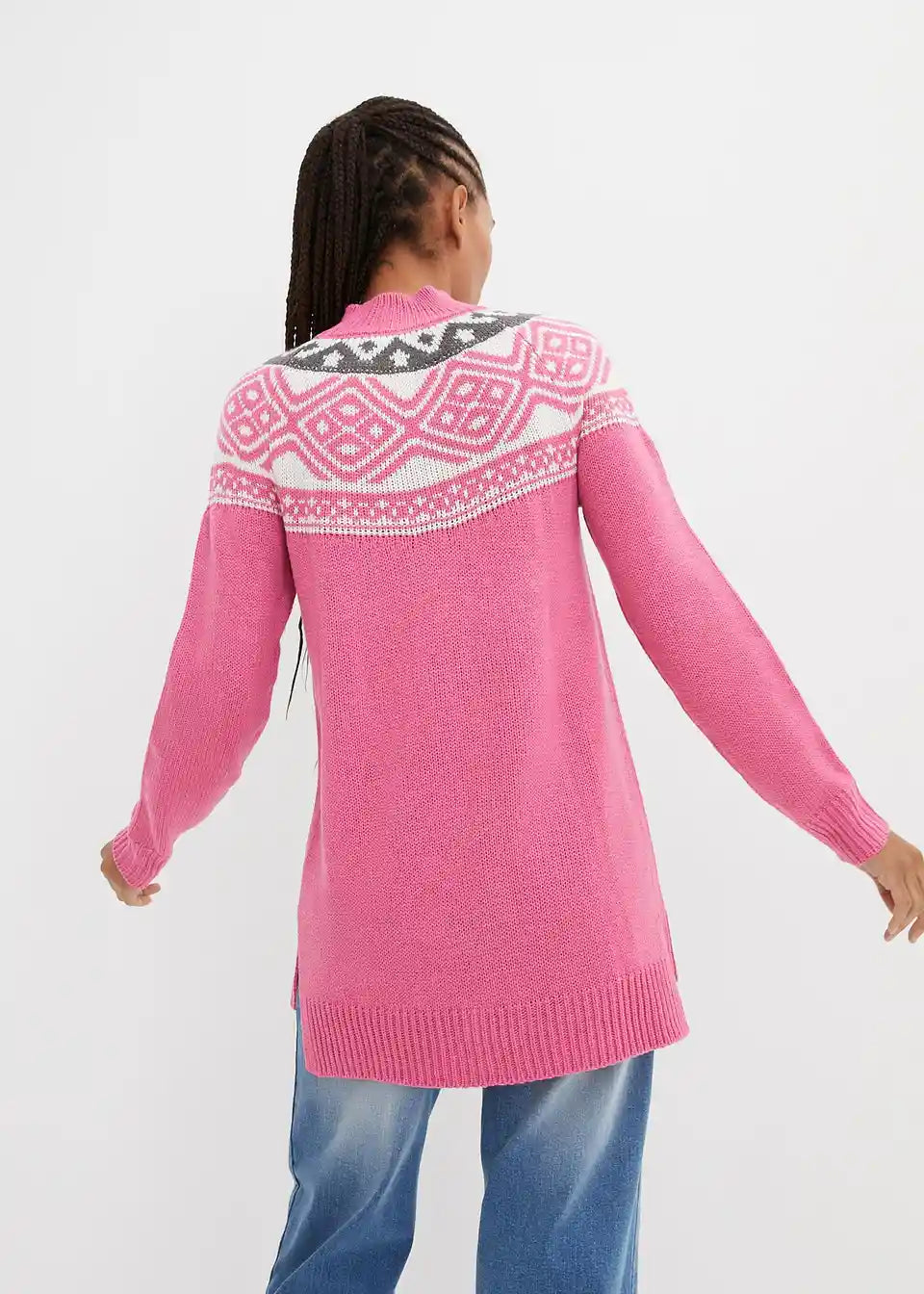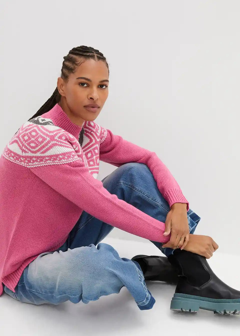 Schöner Winterpulli in frischem Pink ! Ist mal eine nette Farbkombi für einen Norweger-Pullover und auch das VoKuHiLa ist schön modern-er passt gut und das Material gefällt auch-klare Kaufempfehlung !