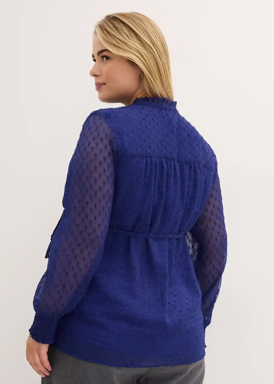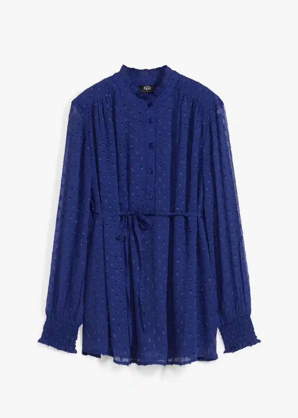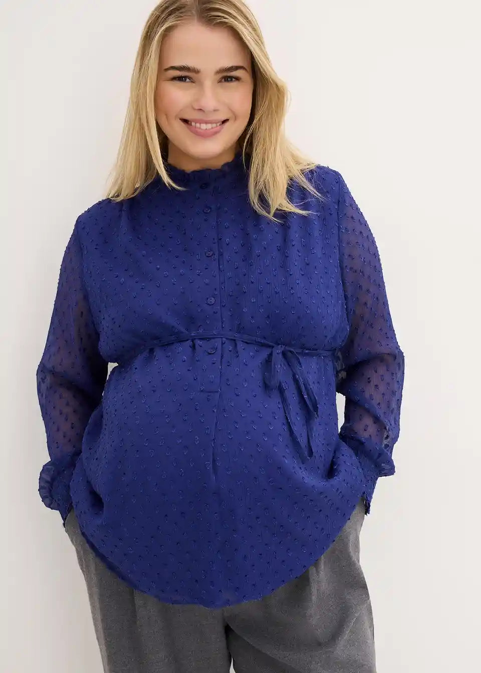 Leichte Bluse aus Chiffon mit blickdichtem Futter, mit leicht transparenten Ärmeln. Mit verziertem Stehkragen. Das abnehmbare Bindeband betont den wachsenden Baby-Bauch. Nach der Schwangerschaft ist ein einfaches Stillen durch die Knopfleiste möglich. Lange Ärmel mit Smokpartie an den Handgelenken.