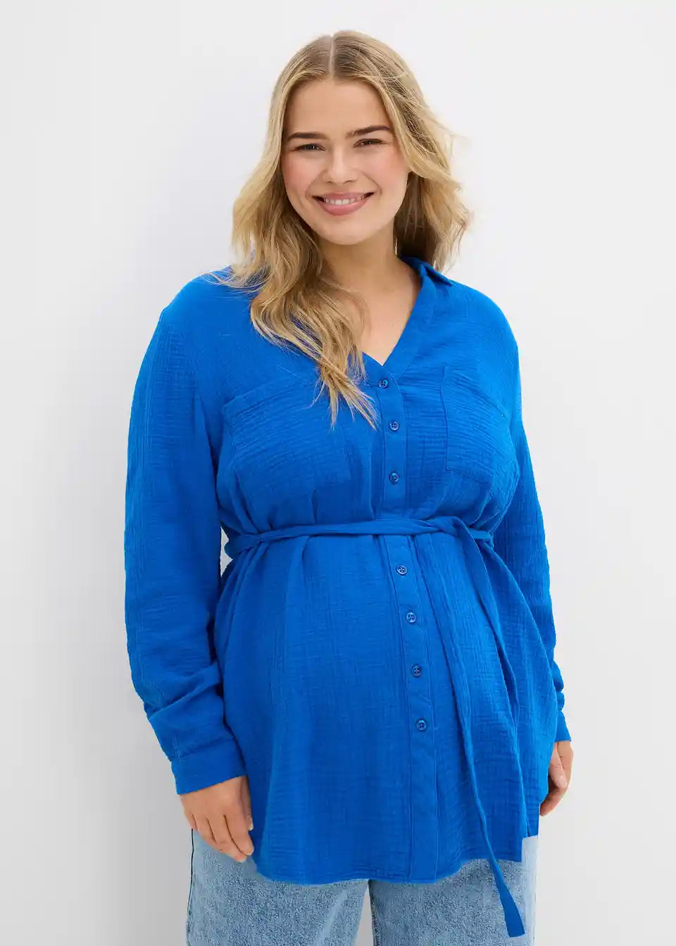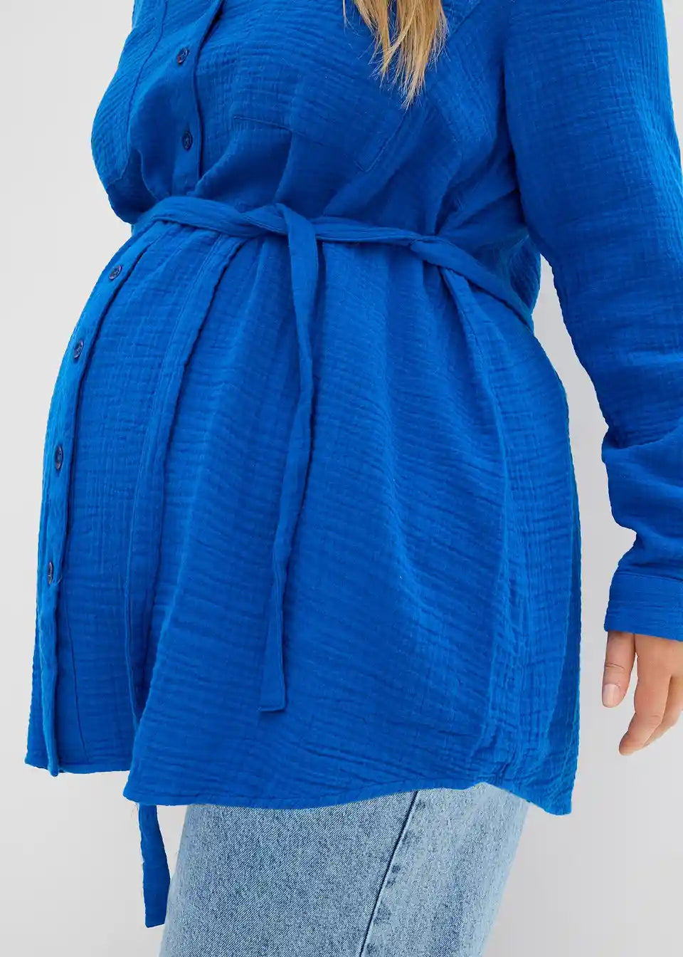 Langärmelige Umstands- und Stillbluse aus hochwertigem, dichtgewebtem Musselin mit praktischen Brusttaschen mit ausreichend Platz für den wachsenden Bauch. Die durchgehende Knopfleiste ermöglicht ein einfaches Stillen und ein bequemes An- und Ausziehen. Die Weite lässt sich durch das abnehmbare Bindeband regulieren. Somit kann die Bluse locker als auch figurbetont getragen werden.