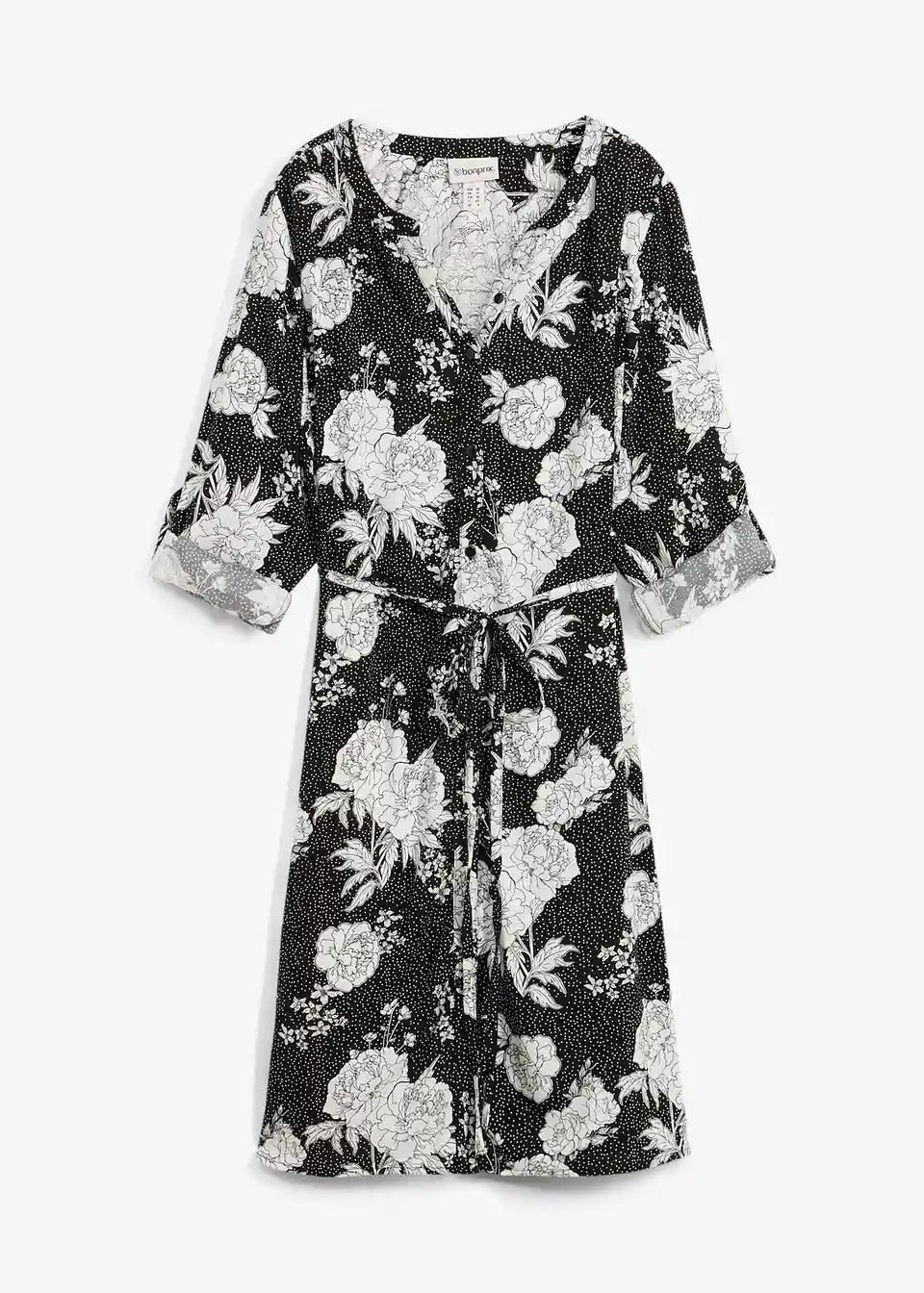 Knielanges Kleid aus Viskose mit Stehkragen, durchgehender Knopfleiste und einem schmalem abnehmbaren Bindegürtel. Leicht abgerundeter Saum. Ärmel mit Manschette und Knöpfen. Die lange Knopfleiste ermöglicht ein einfaches Stillen und ein bequemes An-und Ausziehen.