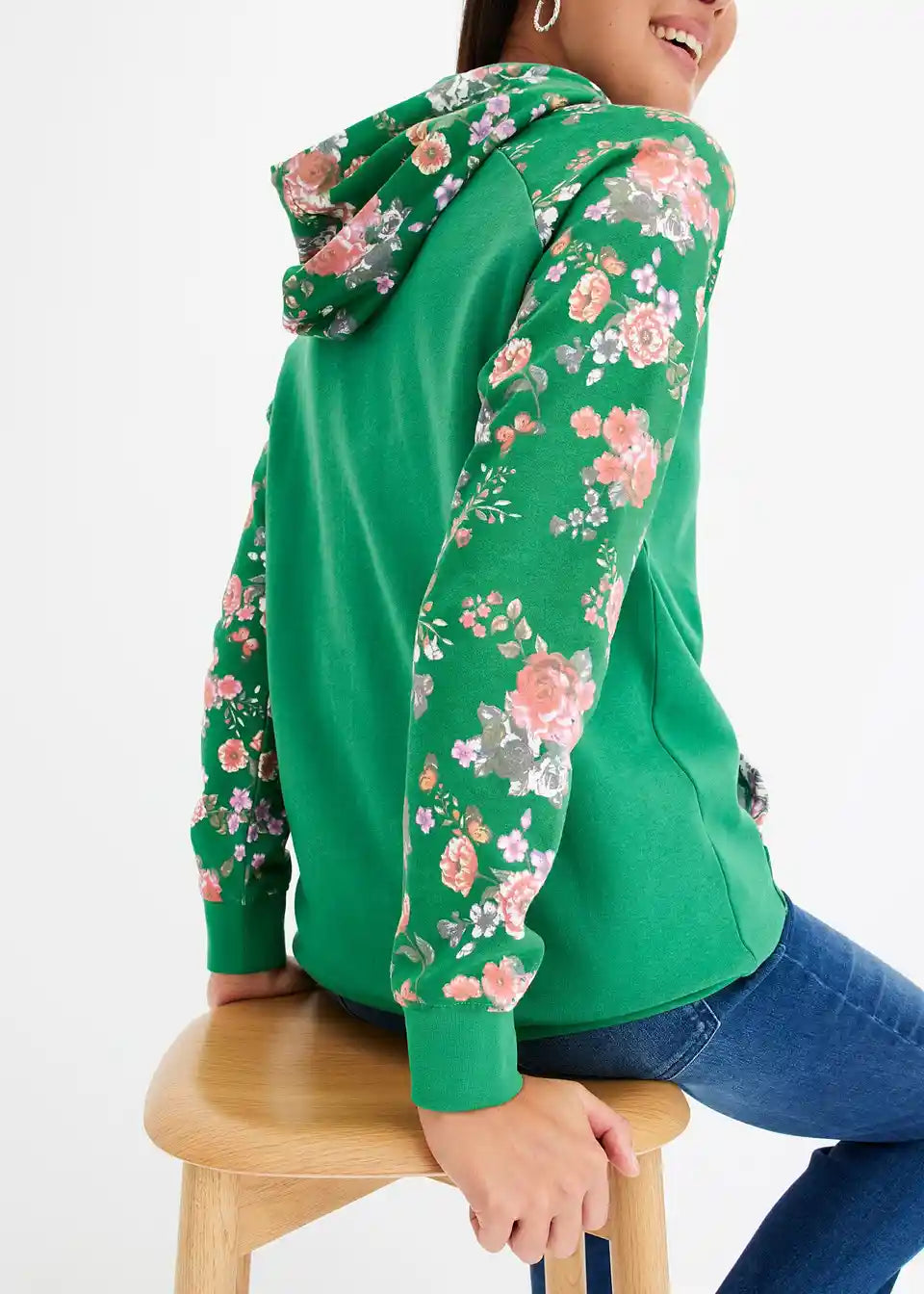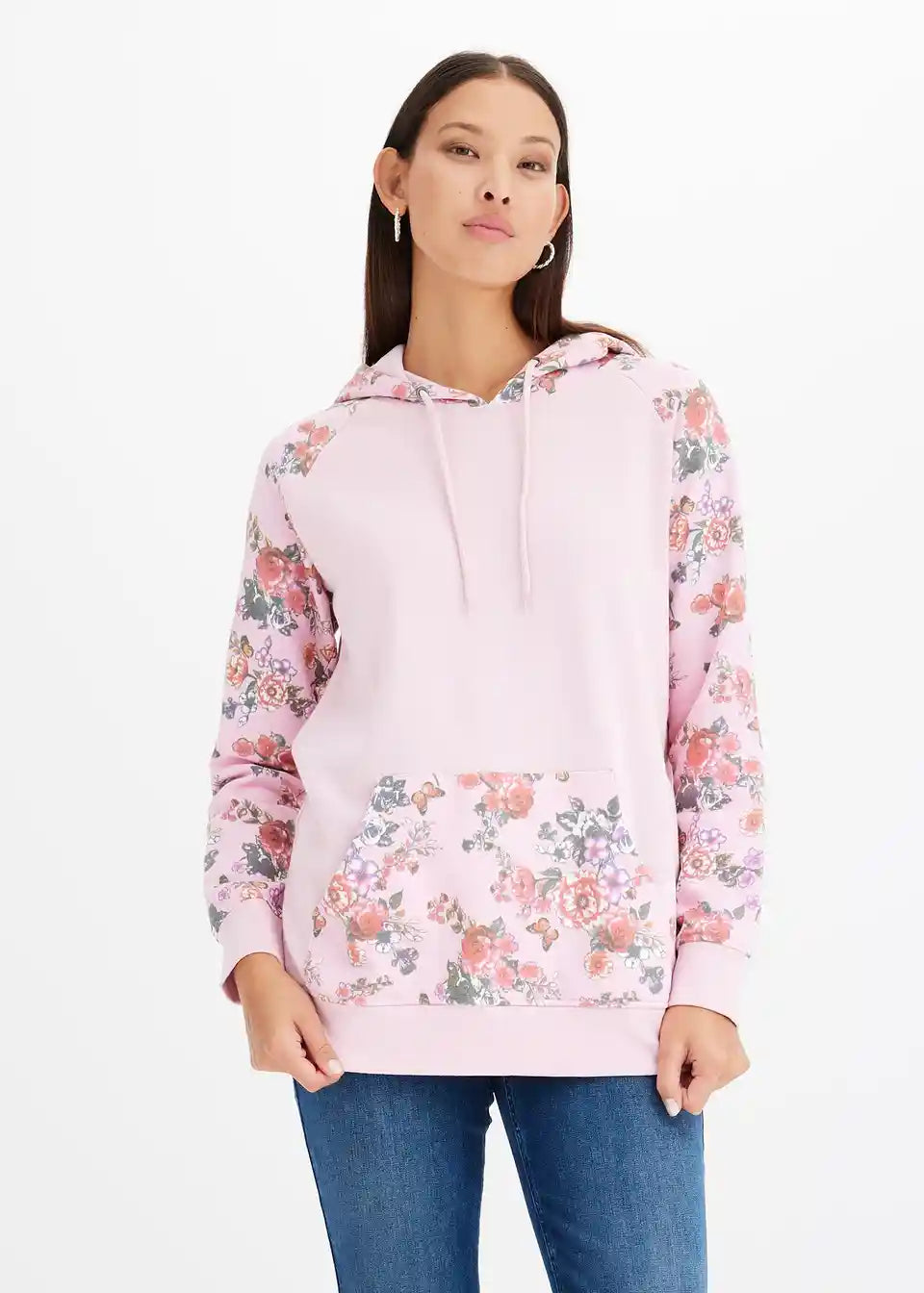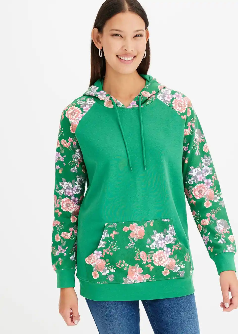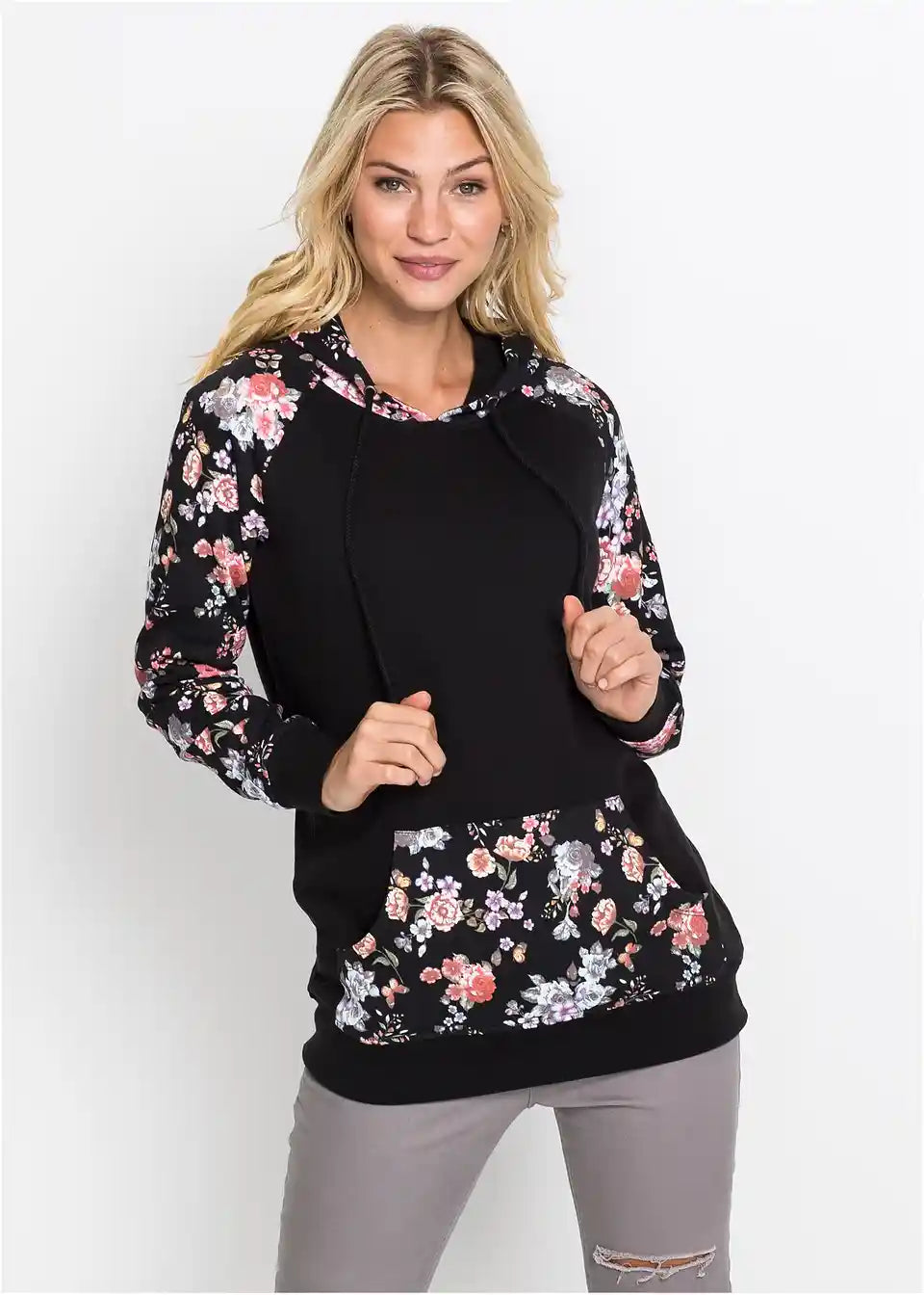 Bei diesem Hoodie fallen die Ärmel, die Kapuze und die Kängurutasche mit einem floralen Druckdesign auf. Es bildet einen angesagten Kontrast zum sportiven Charakter des Modells. Elastische Bündchen runden den Kapuzenpullover an den Enden der Raglanärmel und am Saum ab. Eine schmale Stretchhose geht mit dem Hoodie eine trendige Kombination ein. Jeans mit Destroyed-Elementen und Boots sorgen für einen lässigen Look.