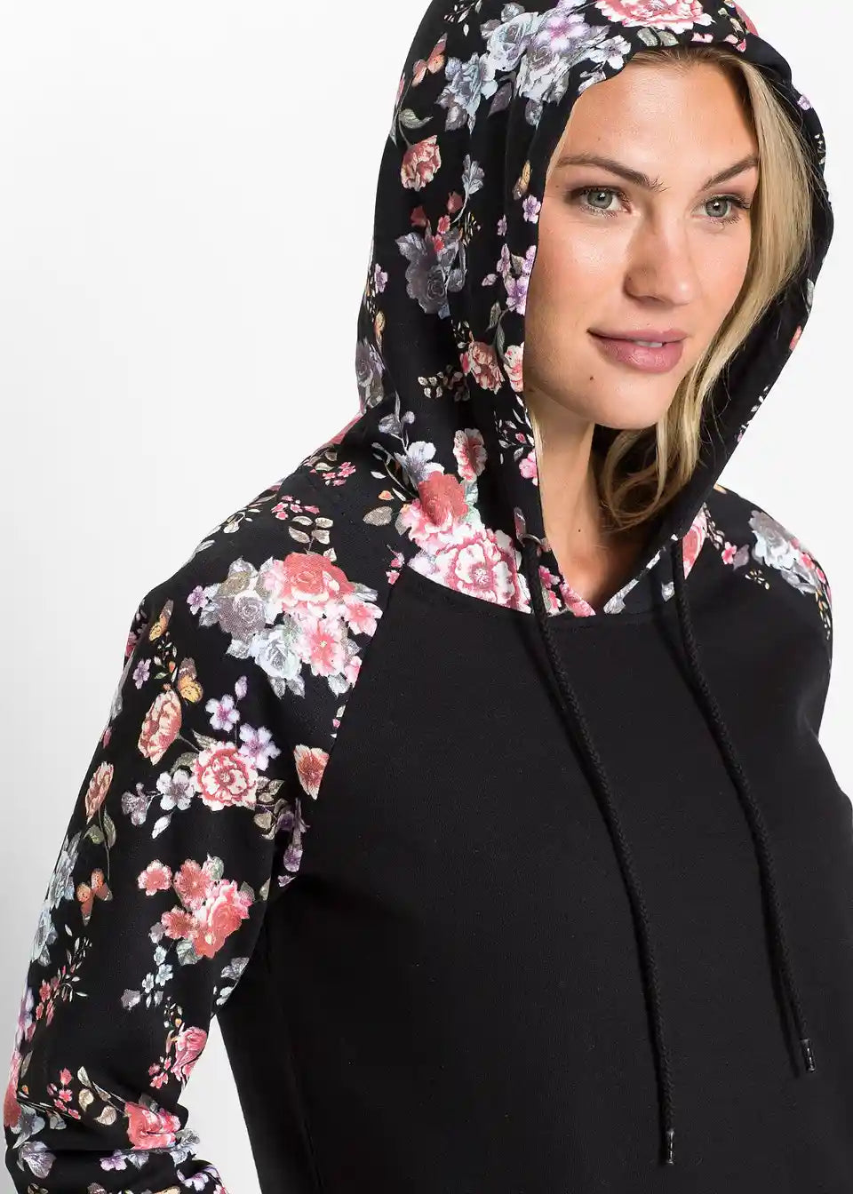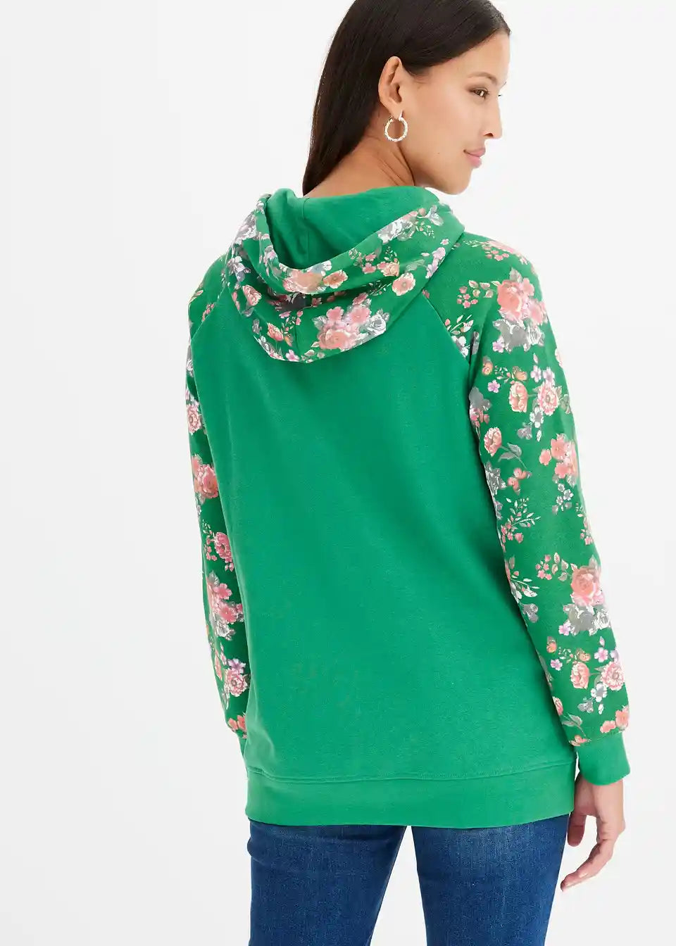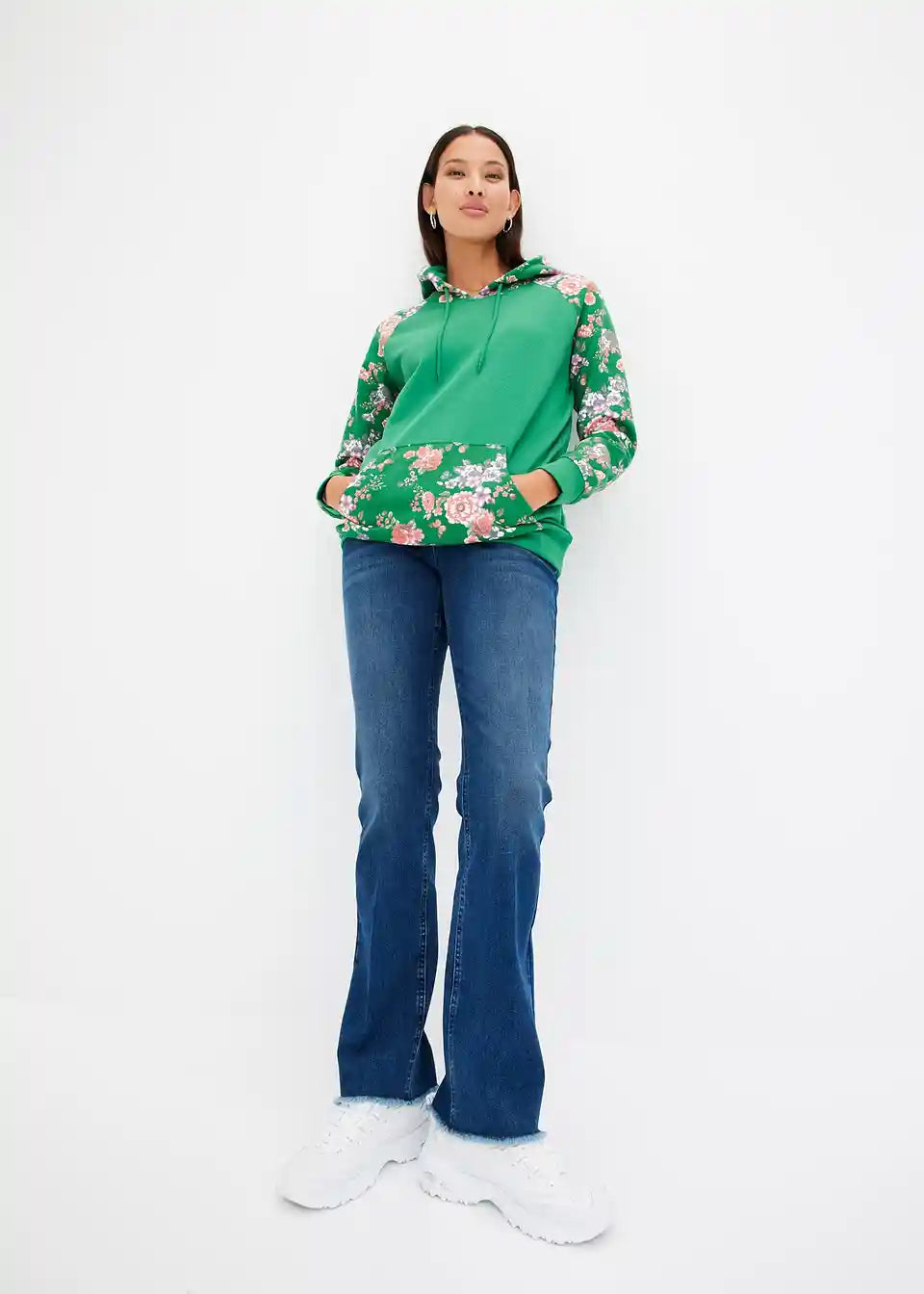 Bei diesem Hoodie fallen die Ärmel, die Kapuze und die Kängurutasche mit einem floralen Druckdesign auf. Es bildet einen angesagten Kontrast zum sportiven Charakter des Modells. Elastische Bündchen runden den Kapuzenpullover an den Enden der Raglanärmel und am Saum ab. Eine schmale Stretchhose geht mit dem Hoodie eine trendige Kombination ein. Jeans mit Destroyed-Elementen und Boots sorgen für einen lässigen Look.