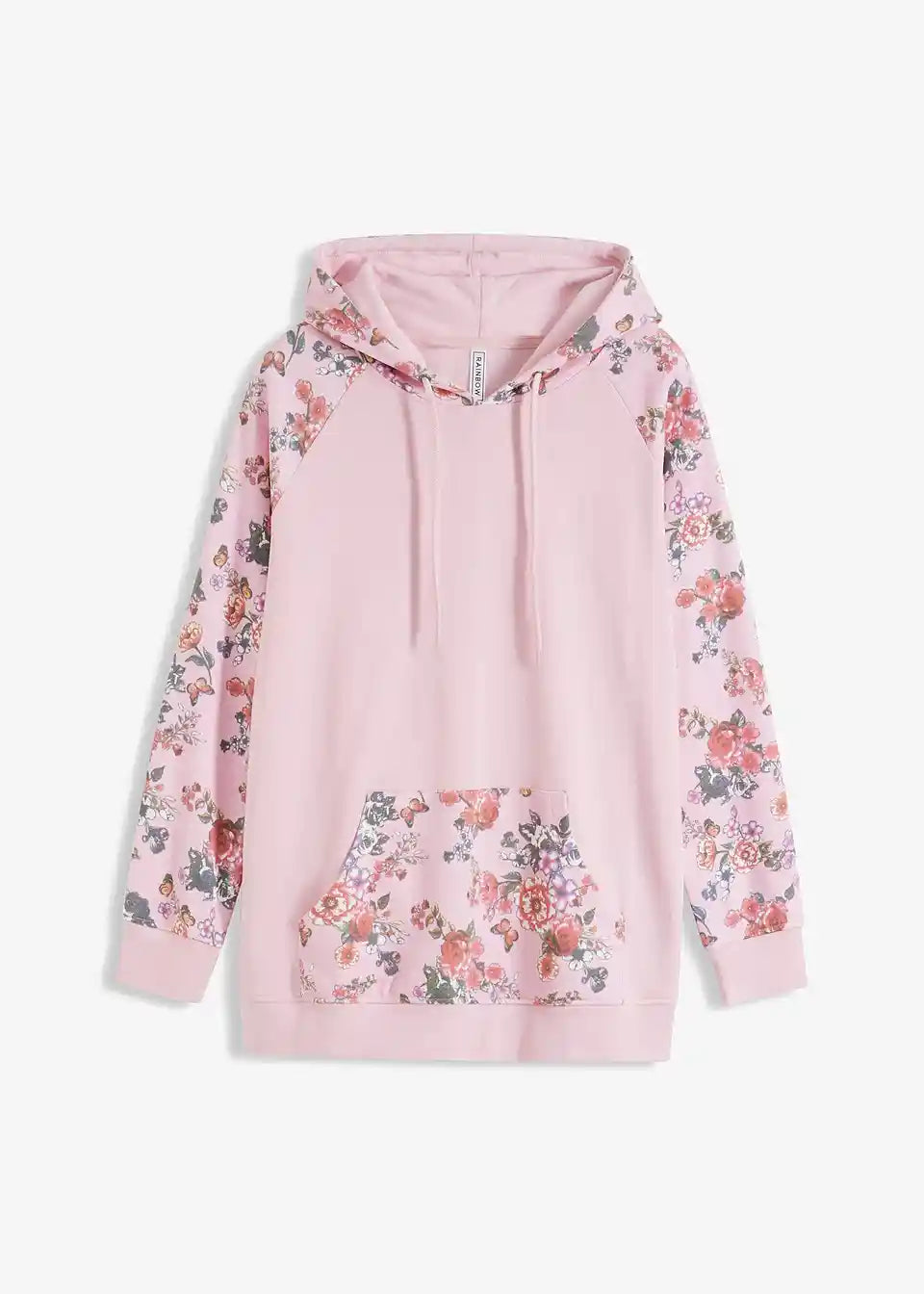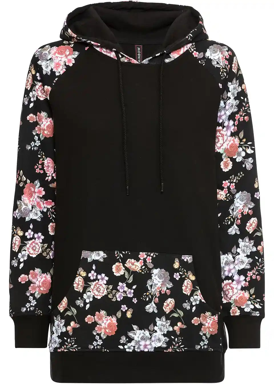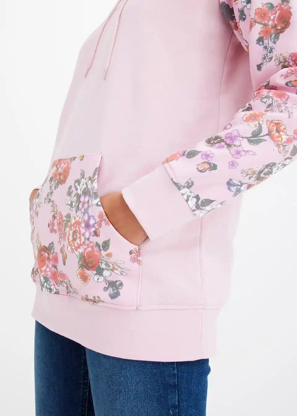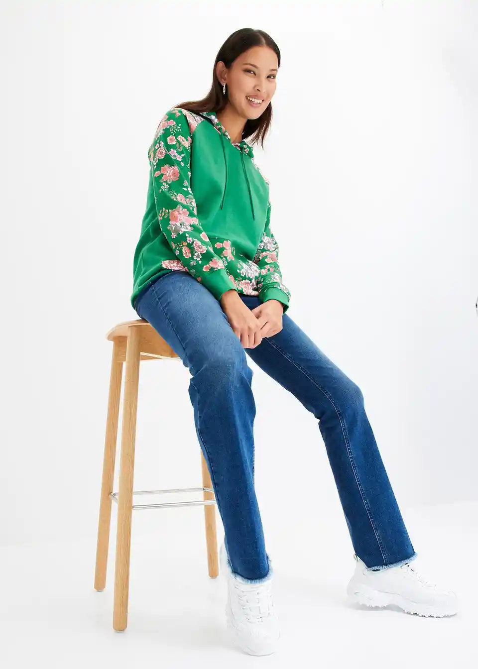 Bei diesem Hoodie fallen die Ärmel, die Kapuze und die Kängurutasche mit einem floralen Druckdesign auf. Es bildet einen angesagten Kontrast zum sportiven Charakter des Modells. Elastische Bündchen runden den Kapuzenpullover an den Enden der Raglanärmel und am Saum ab. Eine schmale Stretchhose geht mit dem Hoodie eine trendige Kombination ein. Jeans mit Destroyed-Elementen und Boots sorgen für einen lässigen Look.