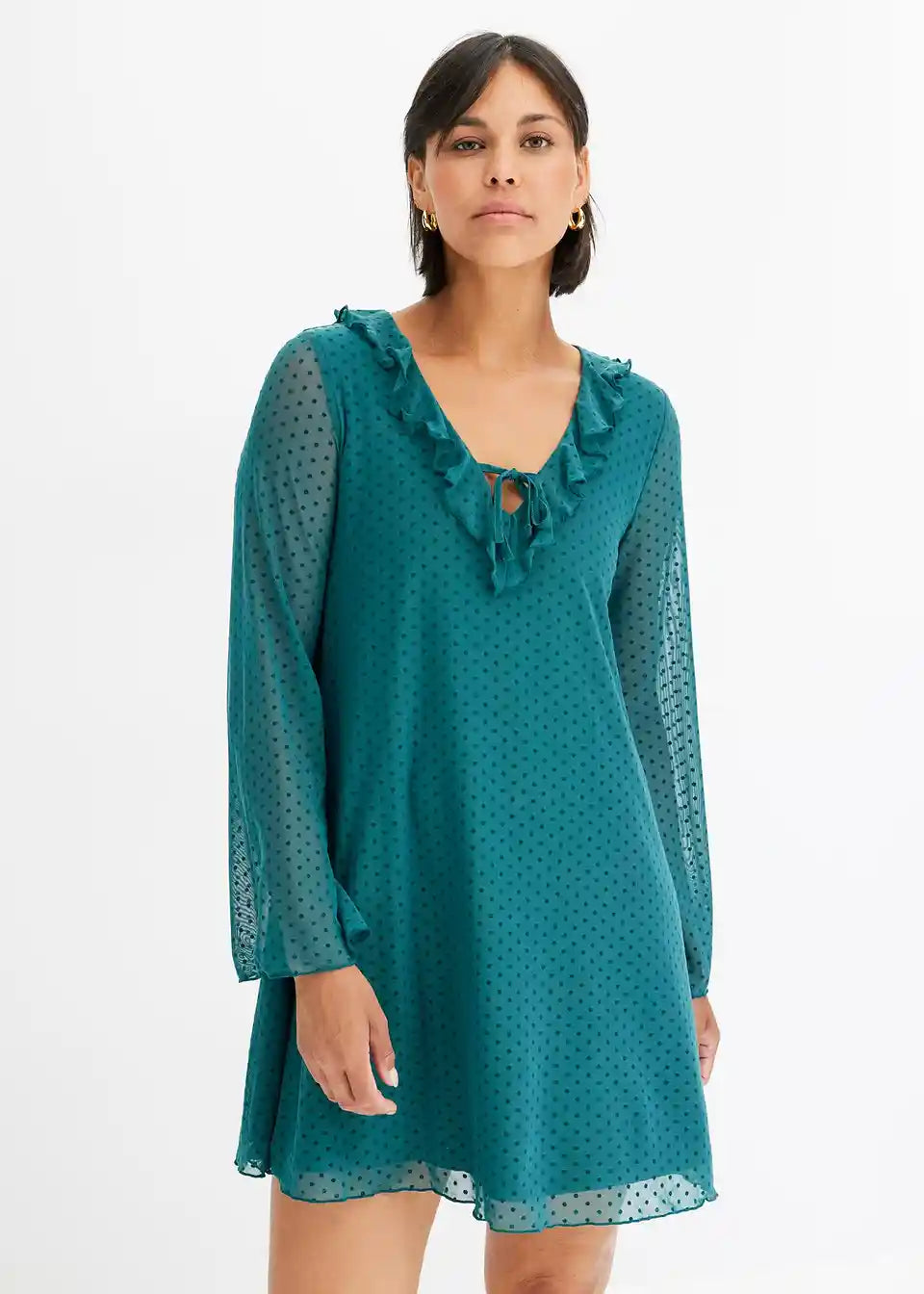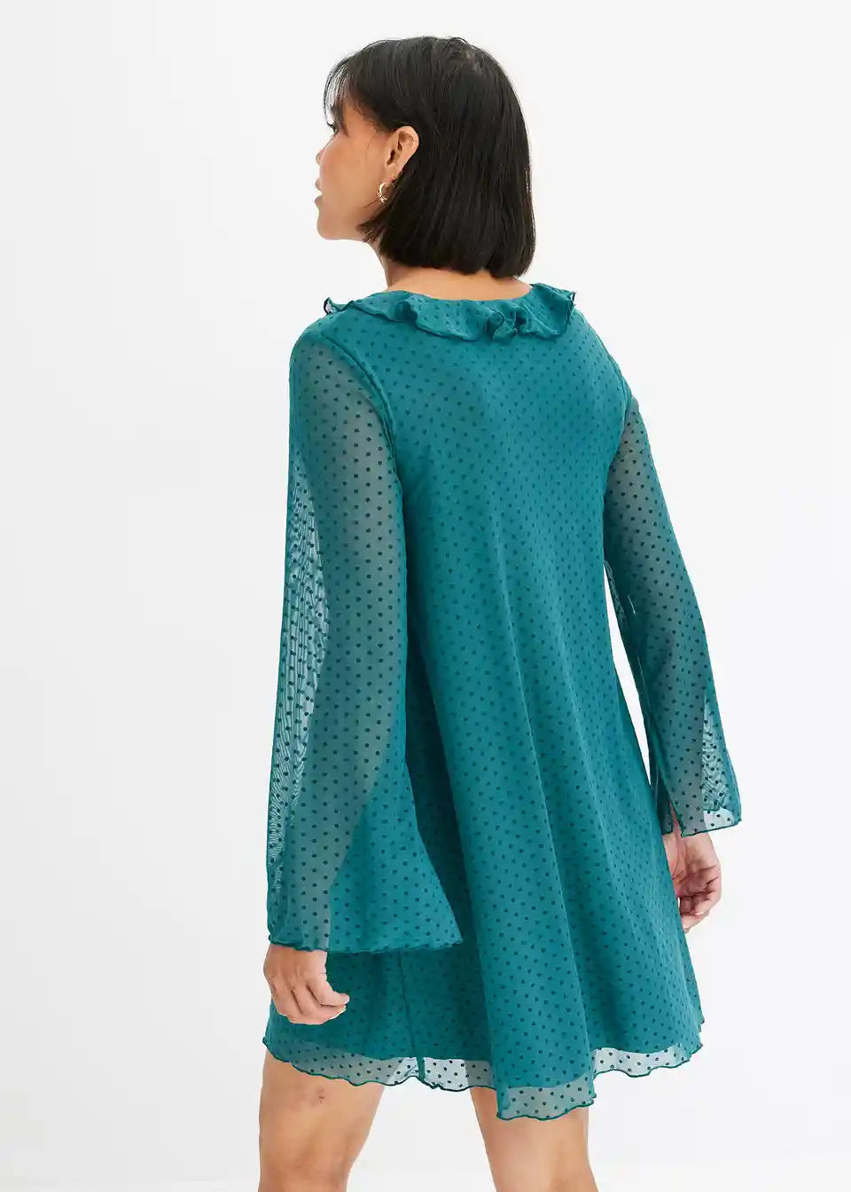 Modernes, gefüttertes Minikleid aus Mesh und Volants am Ausschnitt