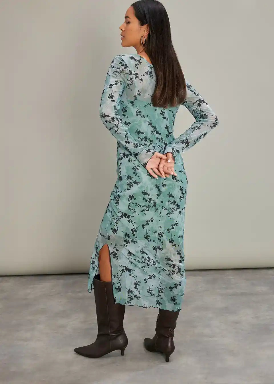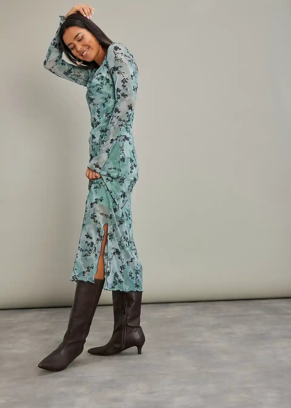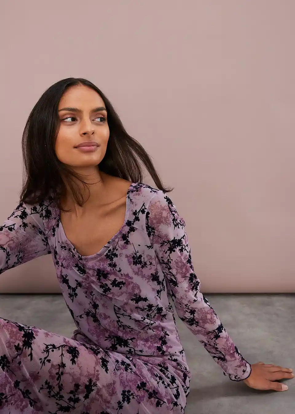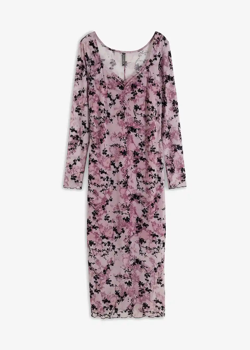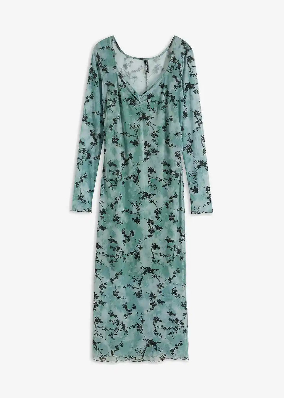 Maxikleid aus Mesh mir Flockprint und Raffungen