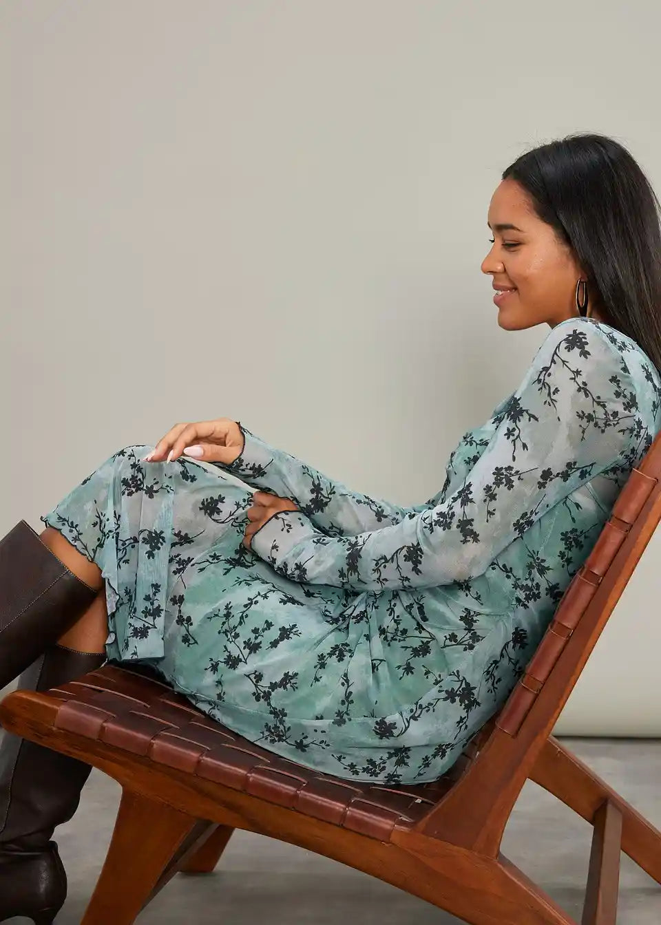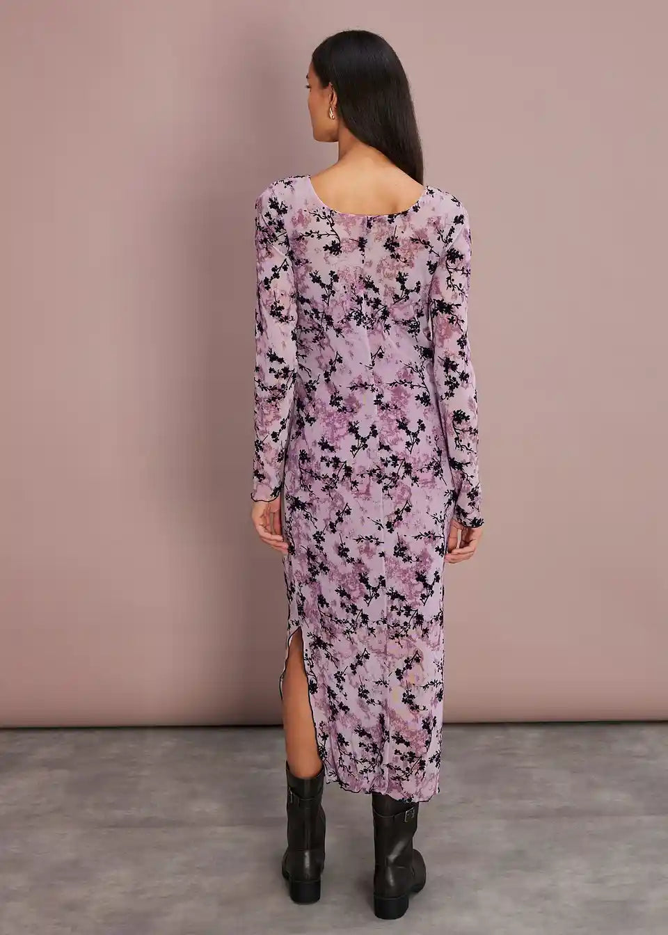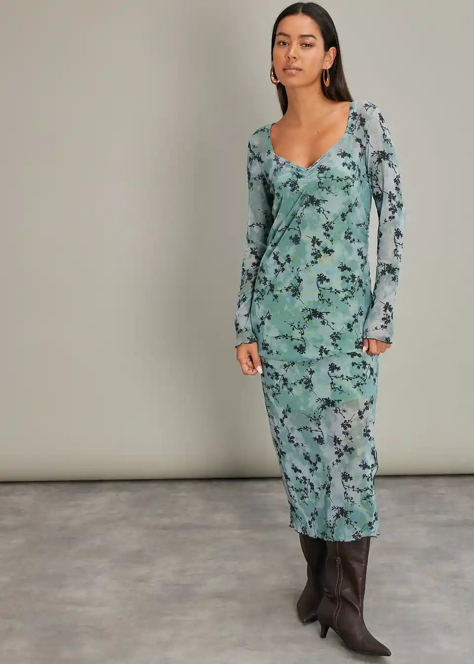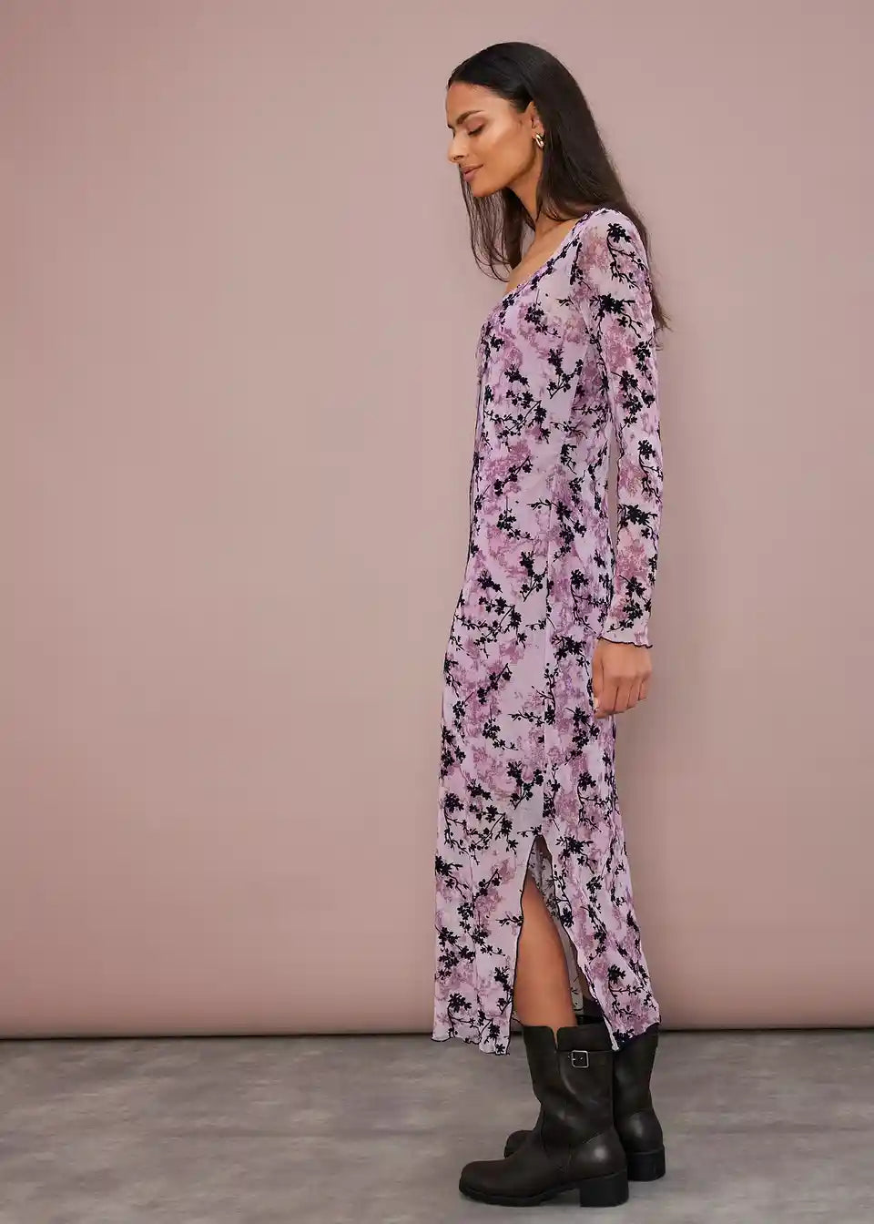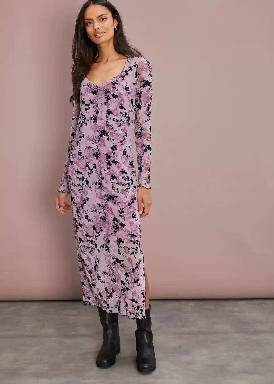 Maxikleid aus Mesh mir Flockprint und Raffungen