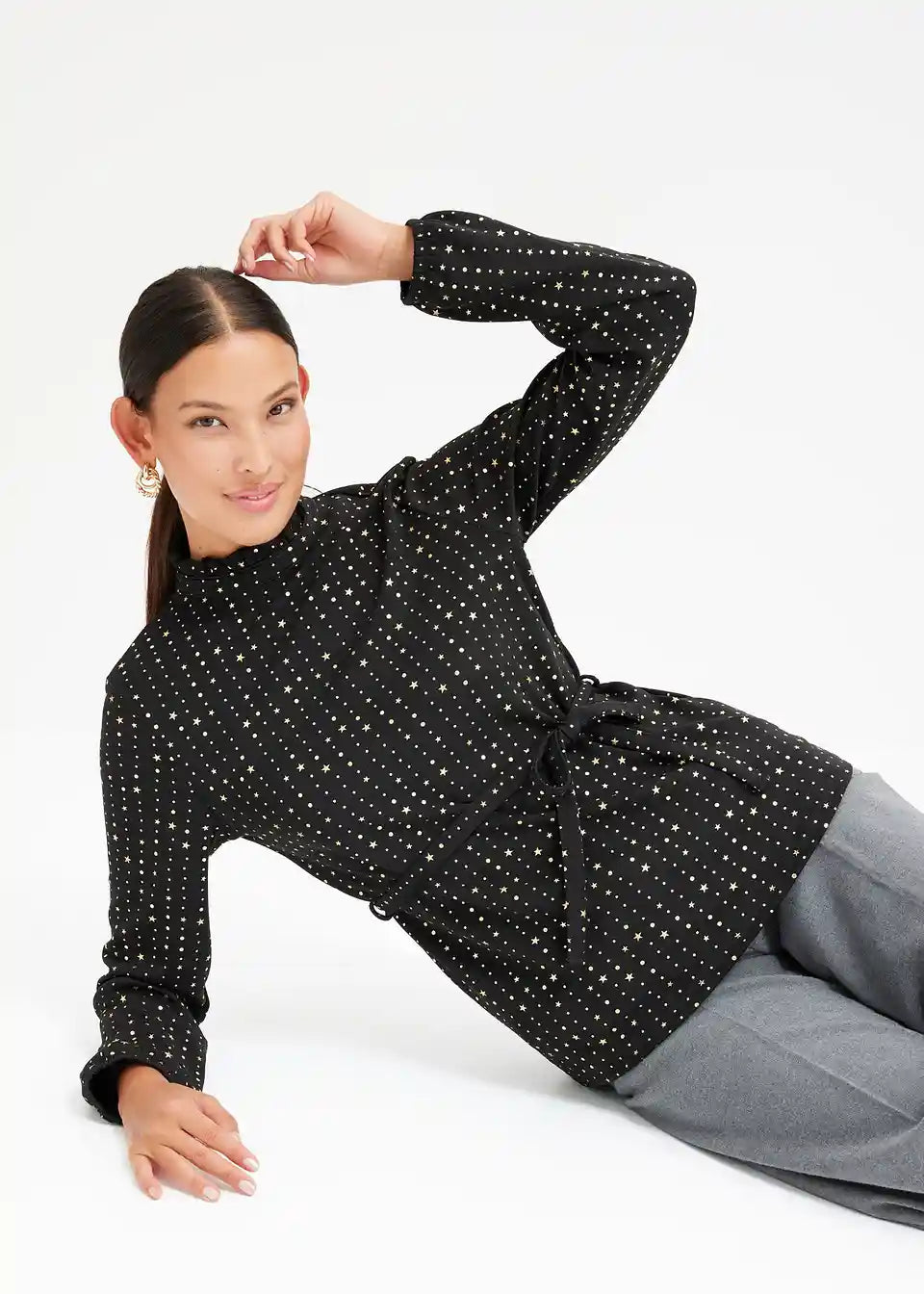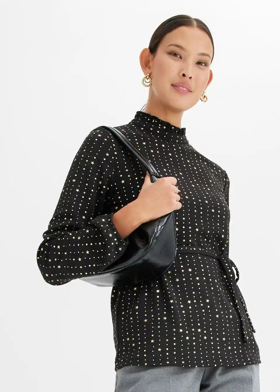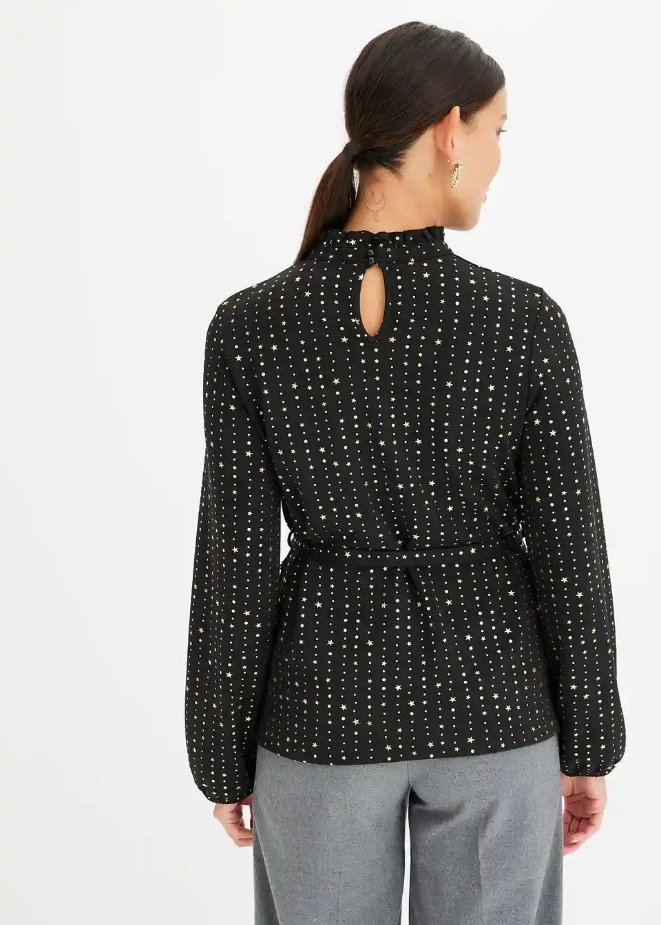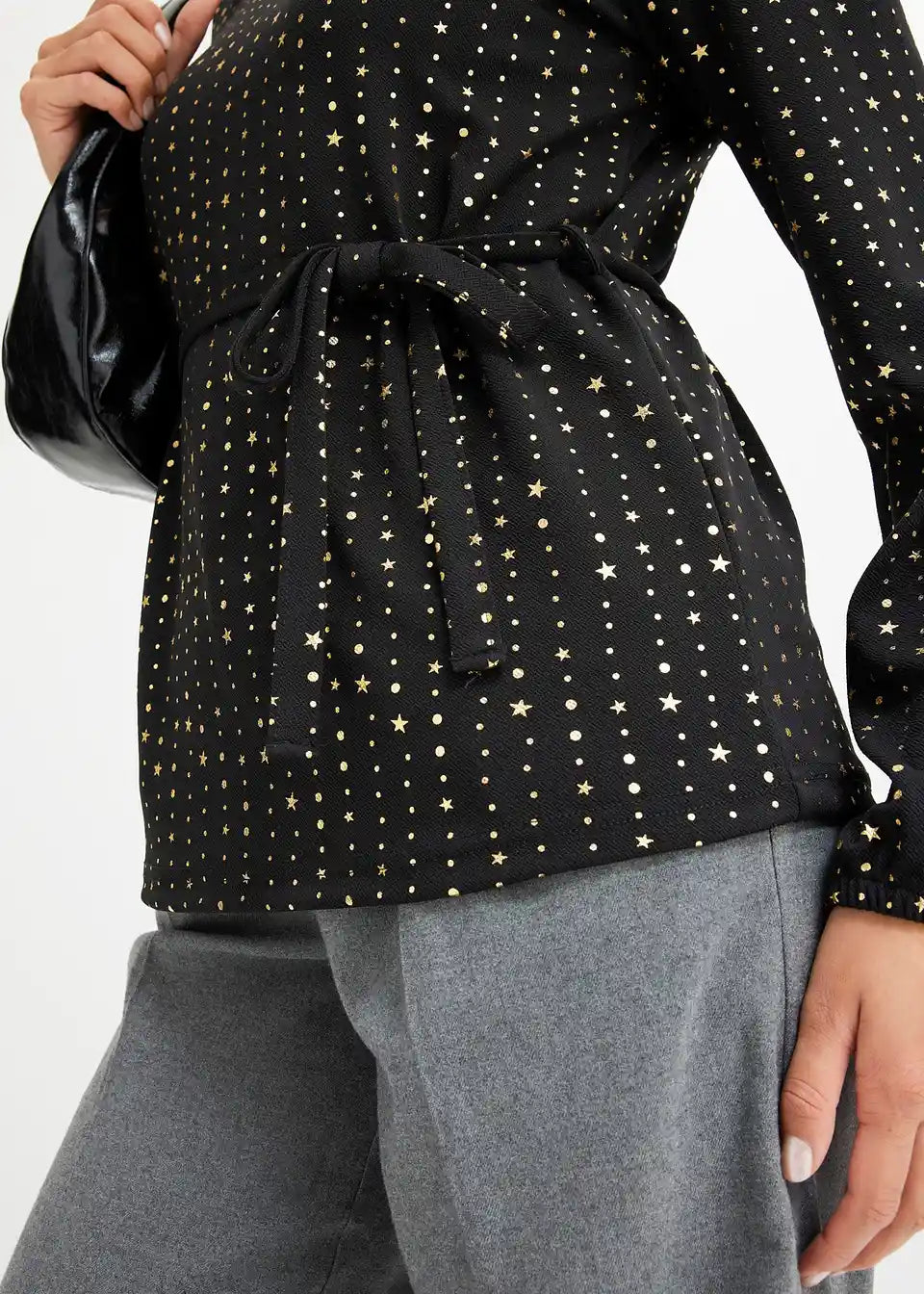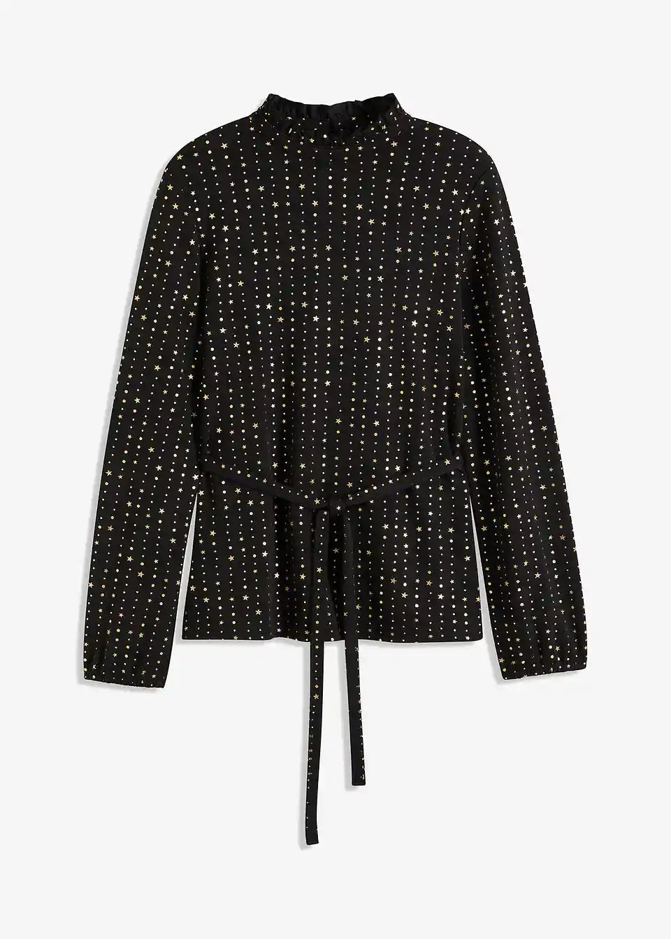Modisches Langarmshirt aus Crepe mit Foilprint und Bindedetail