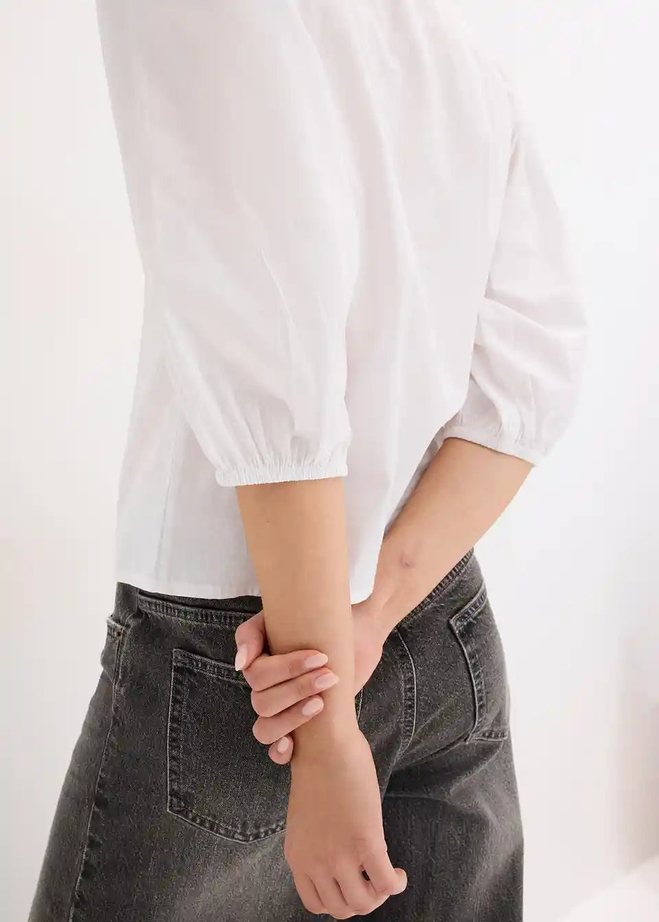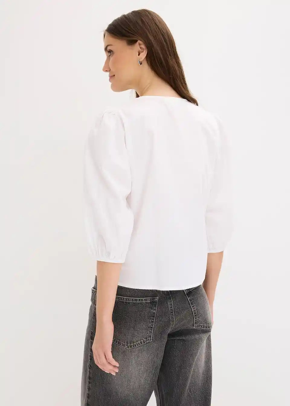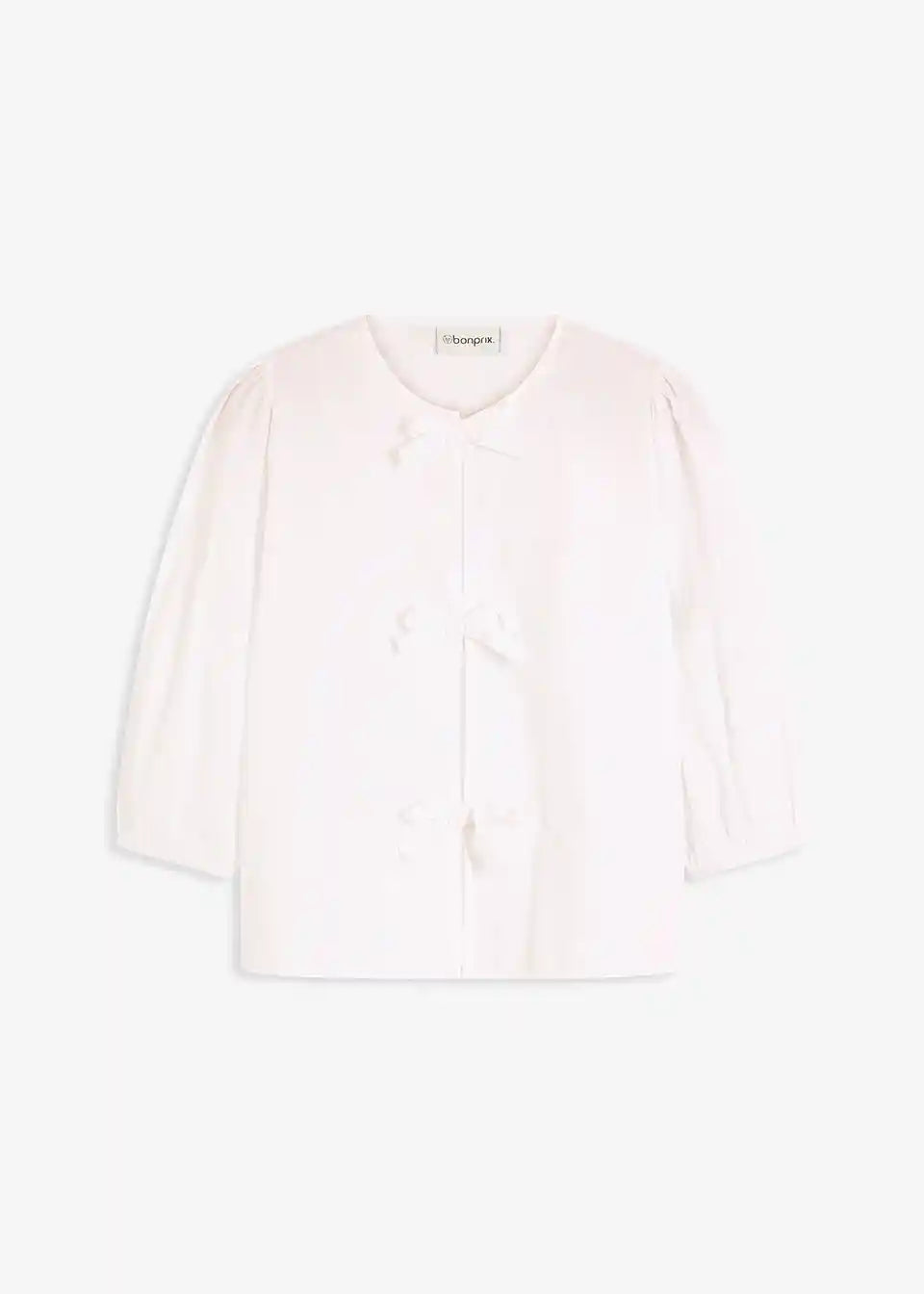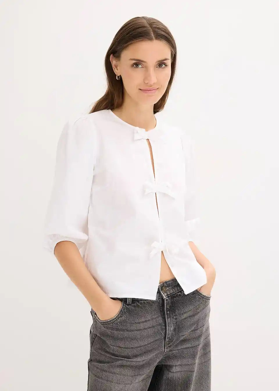 modische Bluse mit dekorativen Schleifen vorne und Puffärmeln, Verschluss mit Druckknöpfen