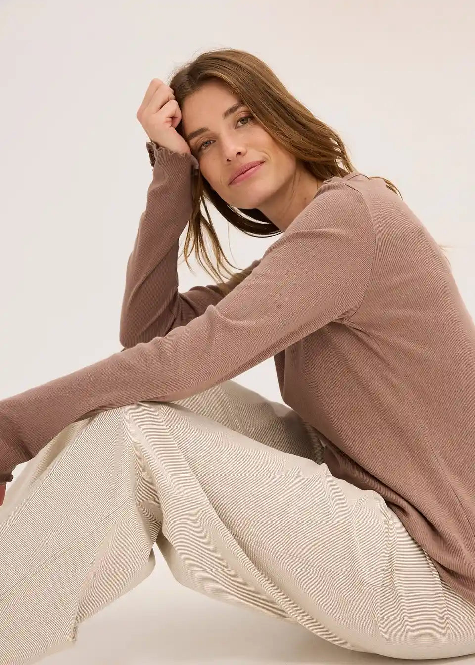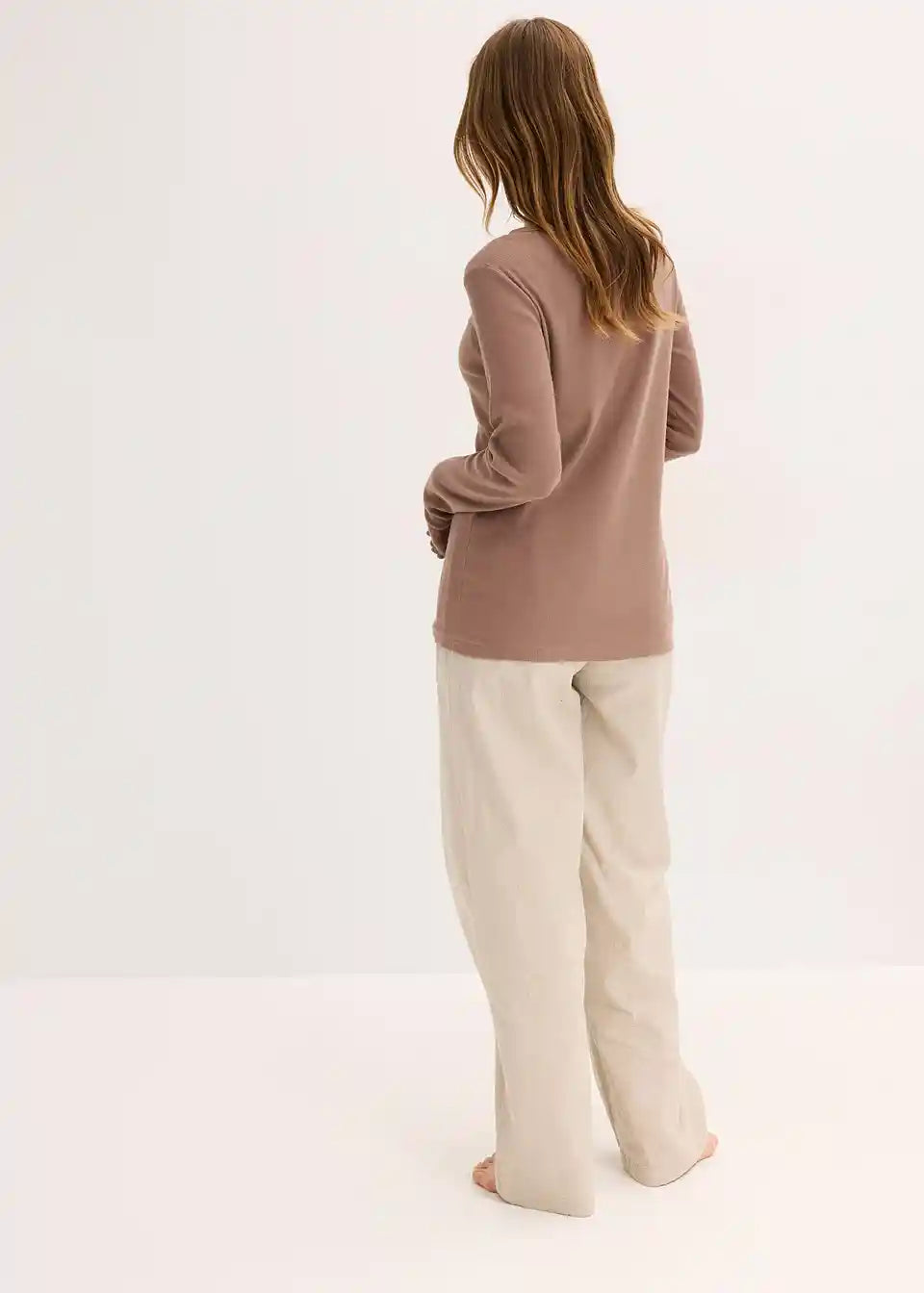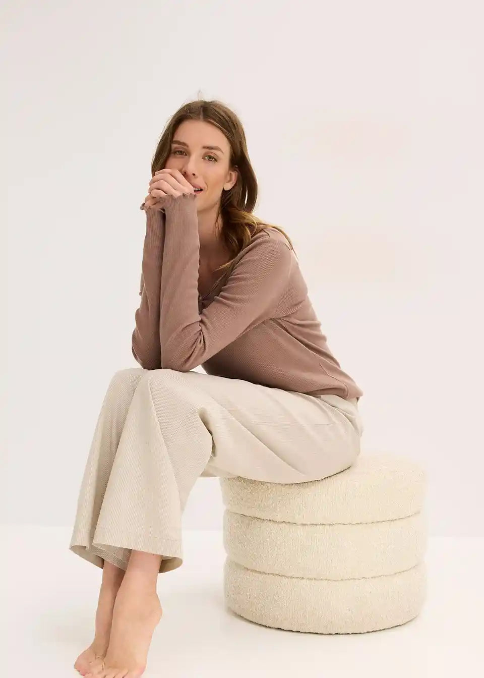 Modisches Loungewear-Set mit gemütlichen Rippshirt und gewebter Hose mit feinen Streifen und Bindeband