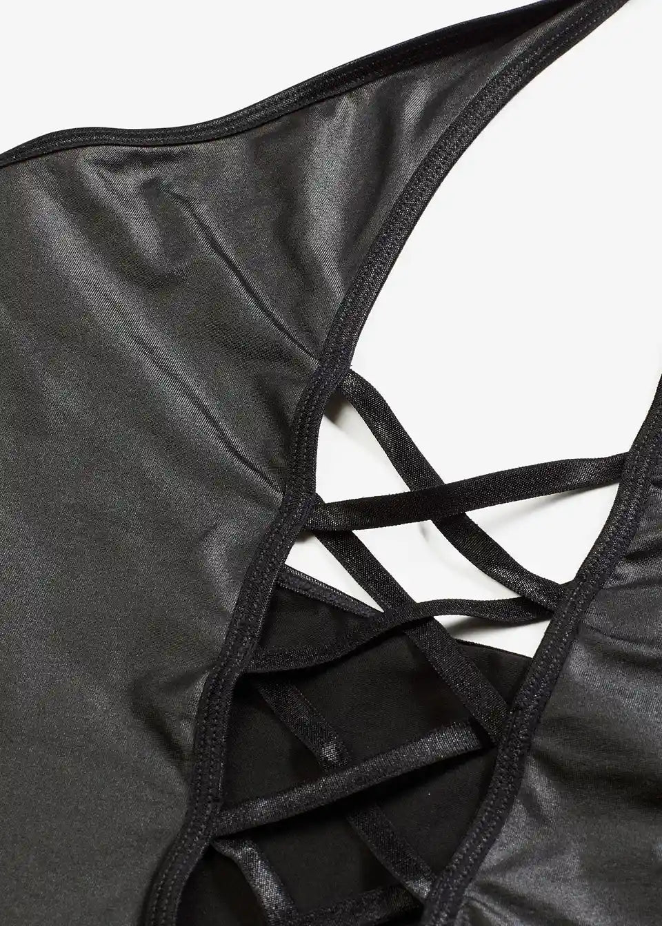 Neckholderkleid aus Wetlook mit dekorativen Bändern.