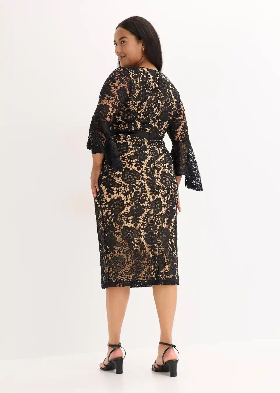 Modern und feminin: Abendkleid in aus bezaubernder Spitze in Midi-Länge mit Satin-Einsatz in der Taille und Volant-Ärmel
