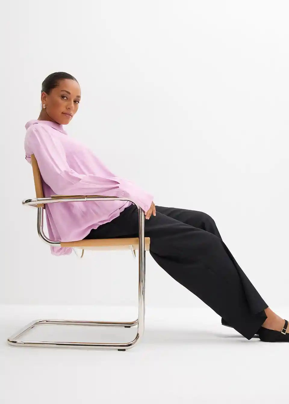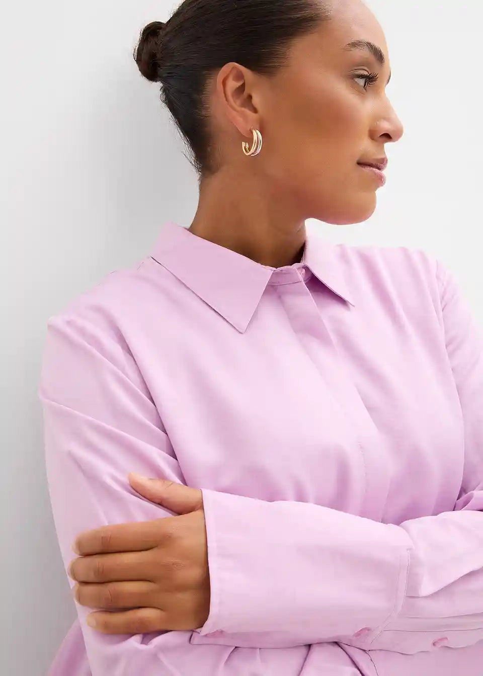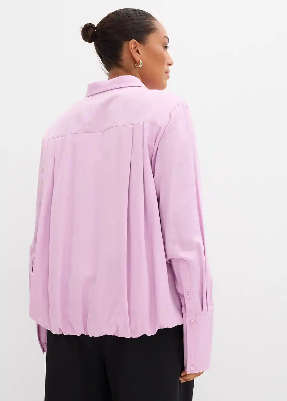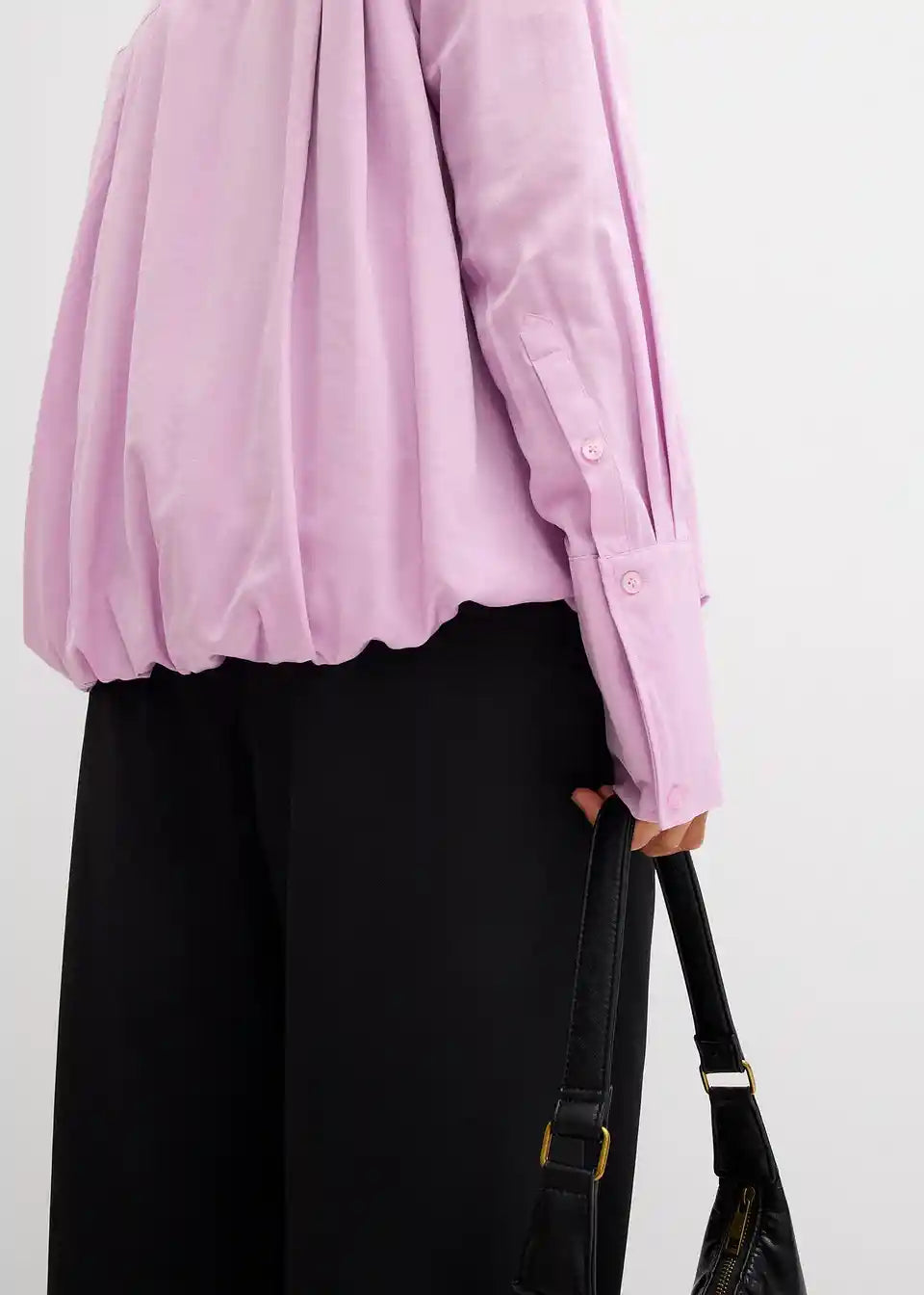 Langarmbluse mit verdeckter Knopfleiste und Ballonsaum. Der Ballonsaum ist geschlossen verarbeitet und kann nicht geöffnet werden.