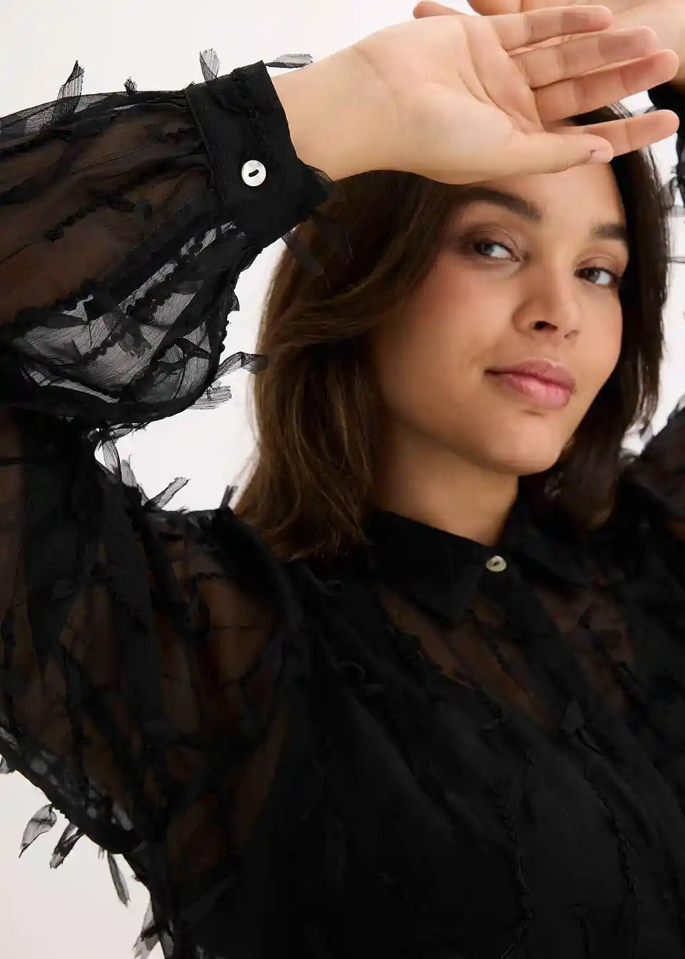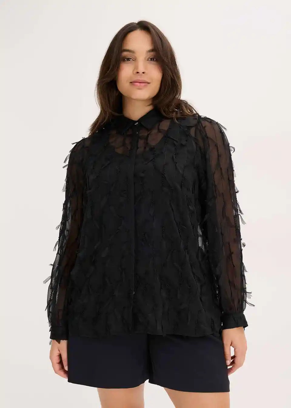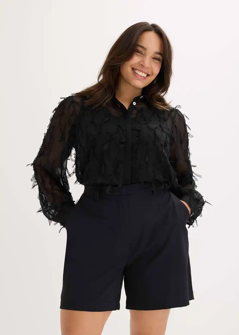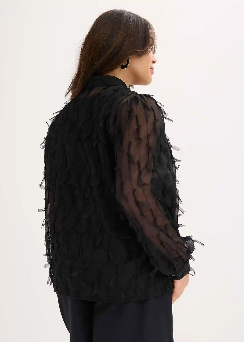 Leicht transparente modische Bluse aus strukturiertem Material mit Besatz aus Fransen.