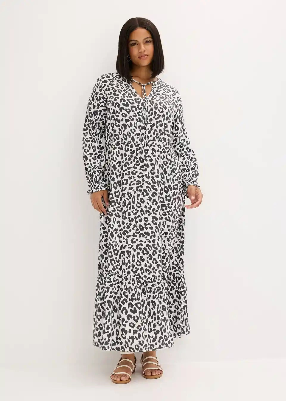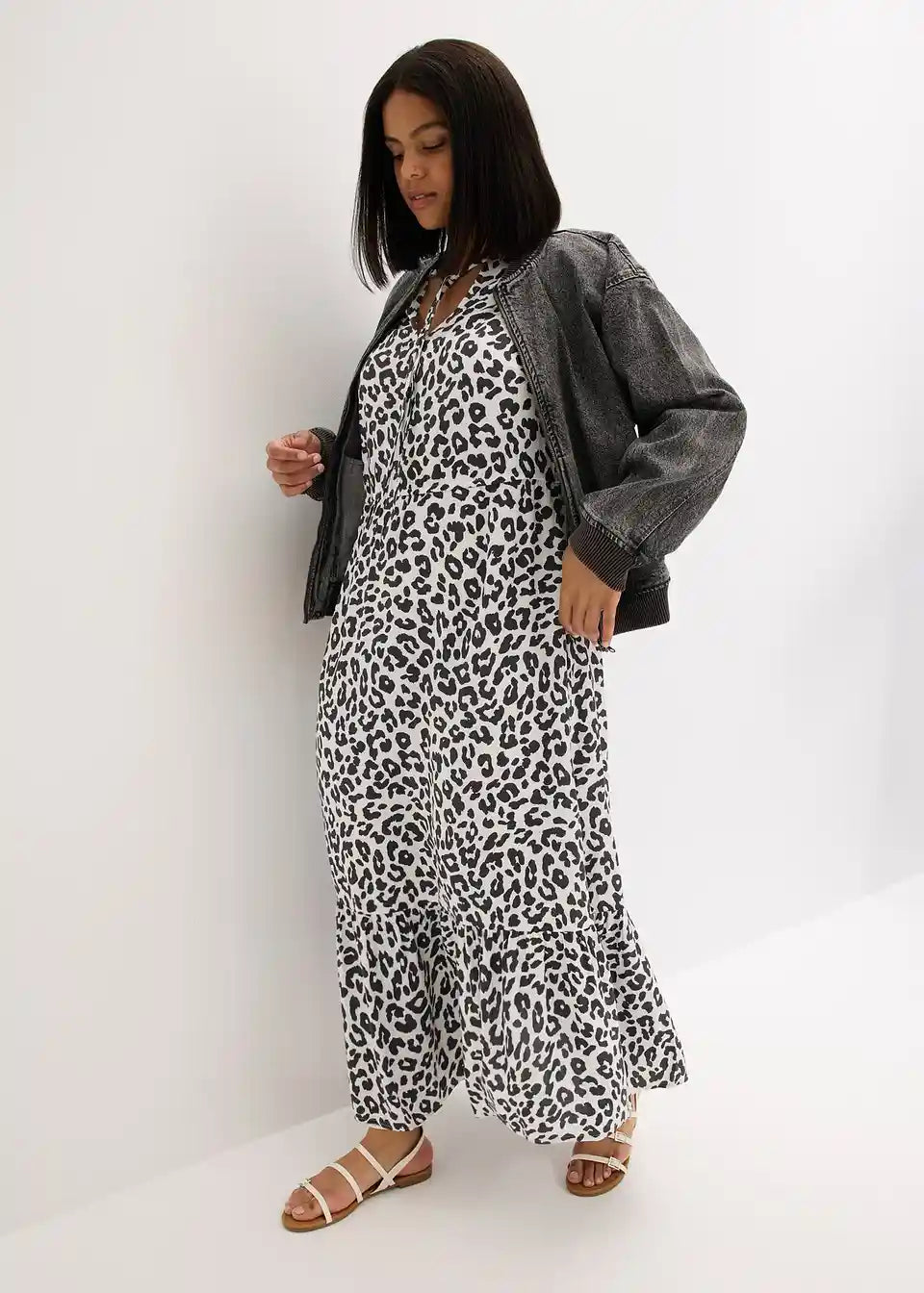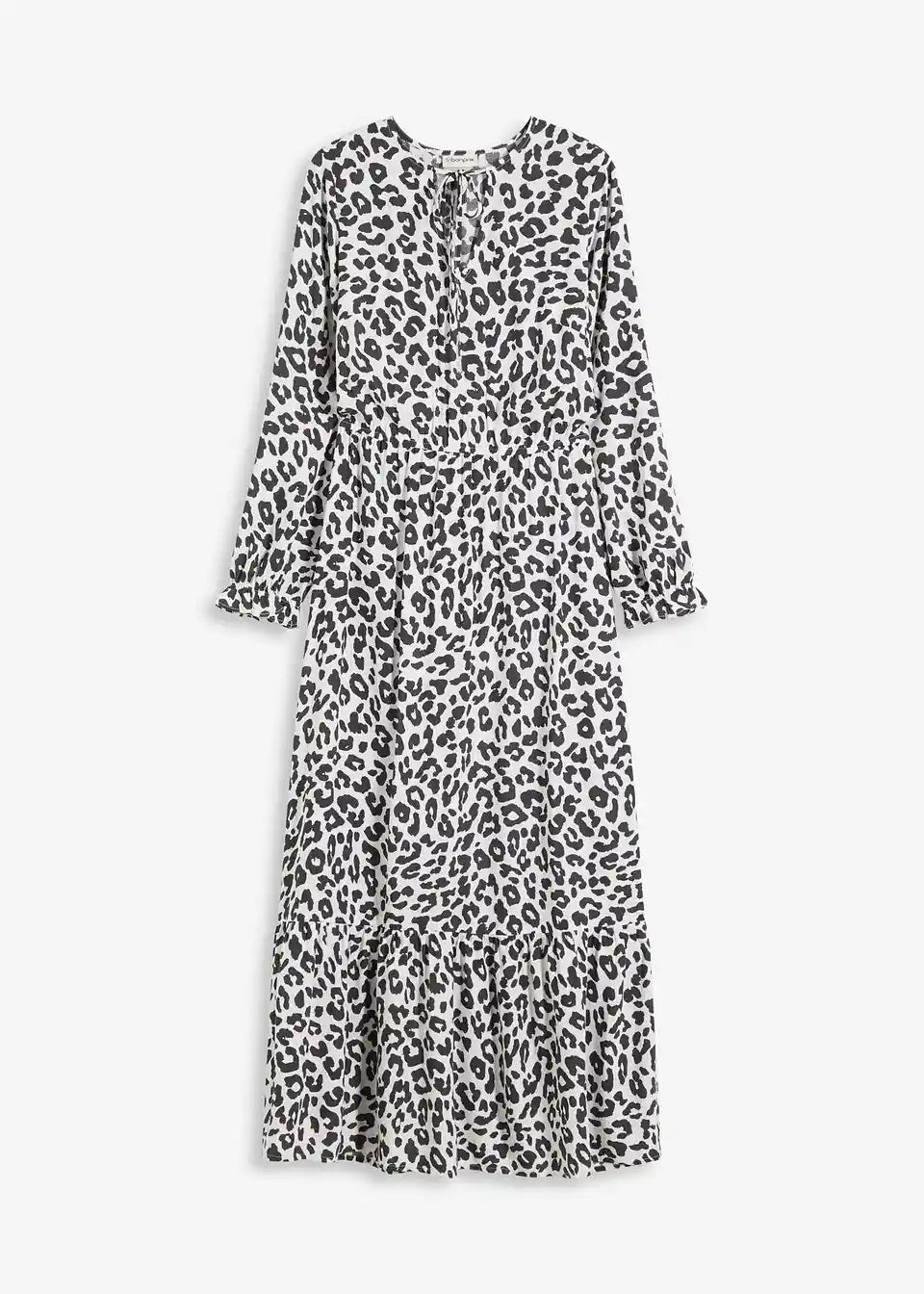 Langes Kleid mit Volants und Bindeband am Ausschnitt
