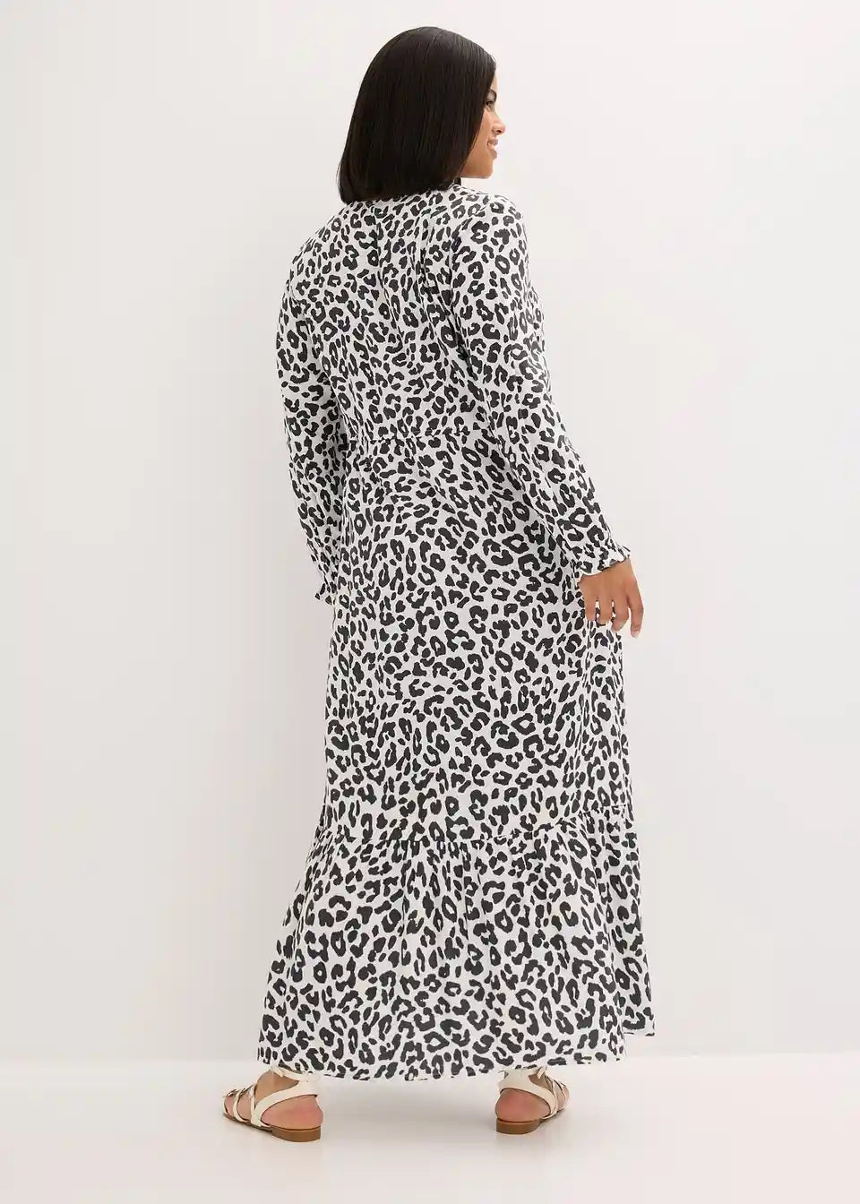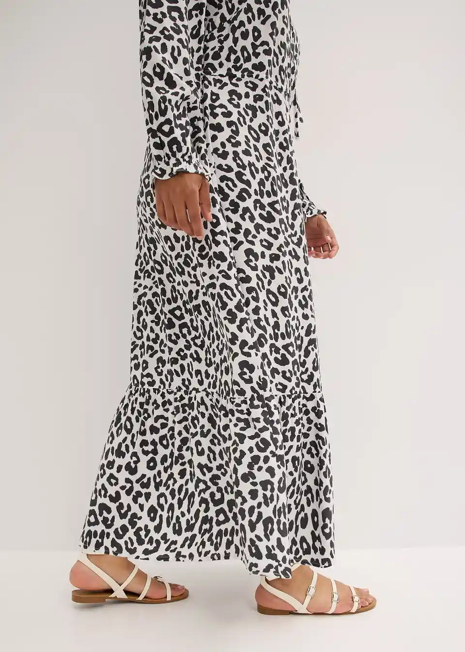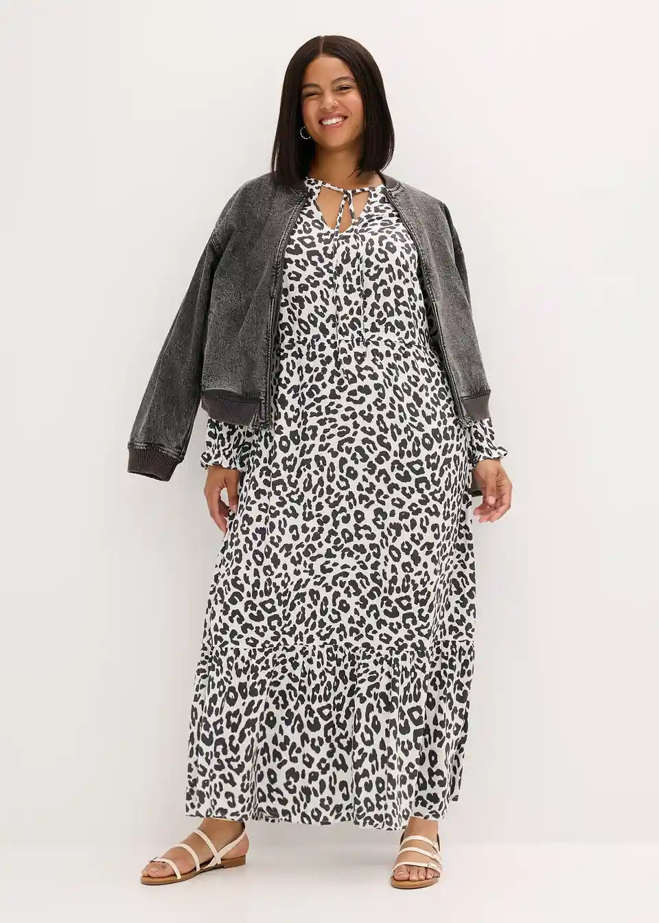 Langes Kleid mit Volants und Bindeband am Ausschnitt