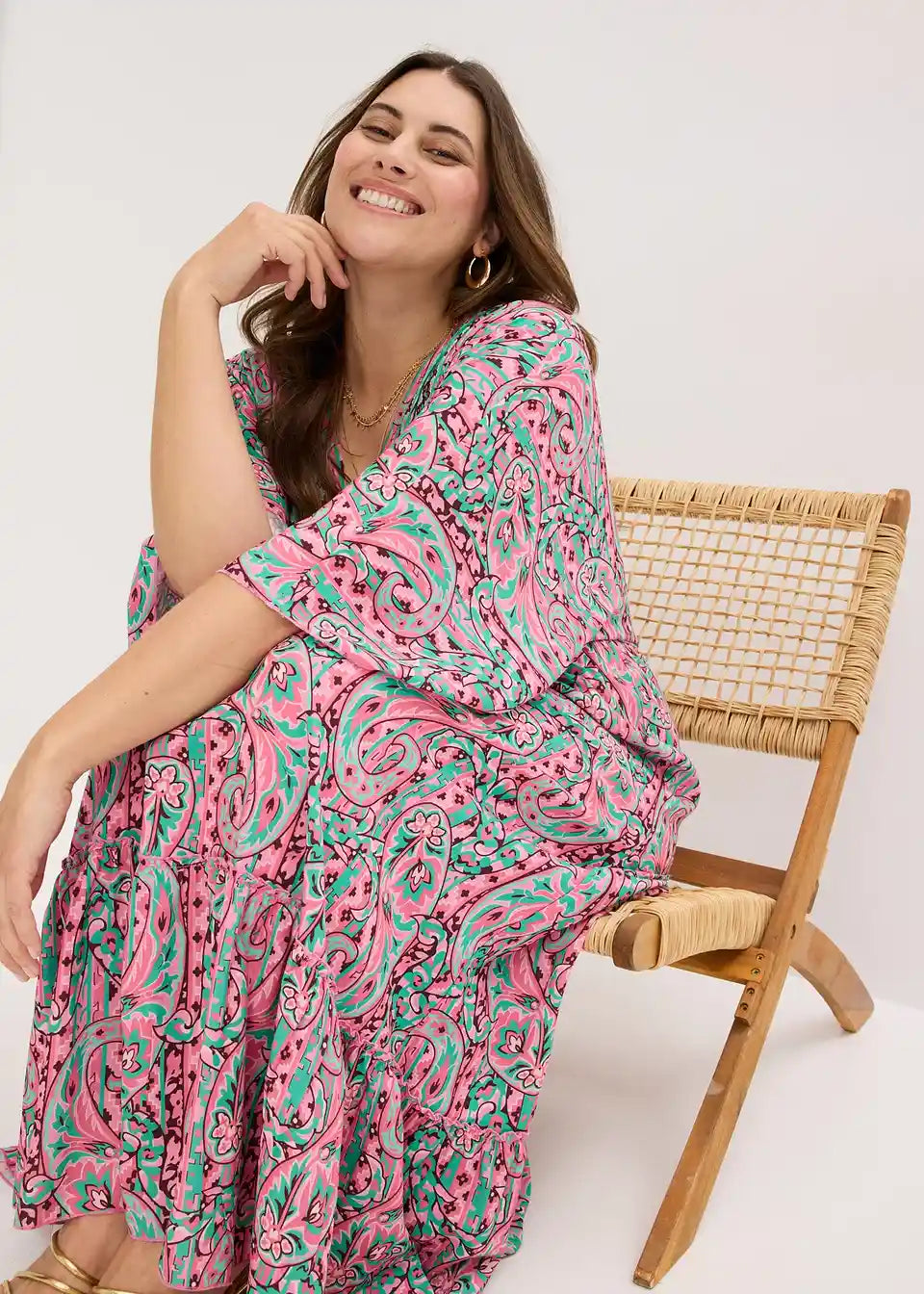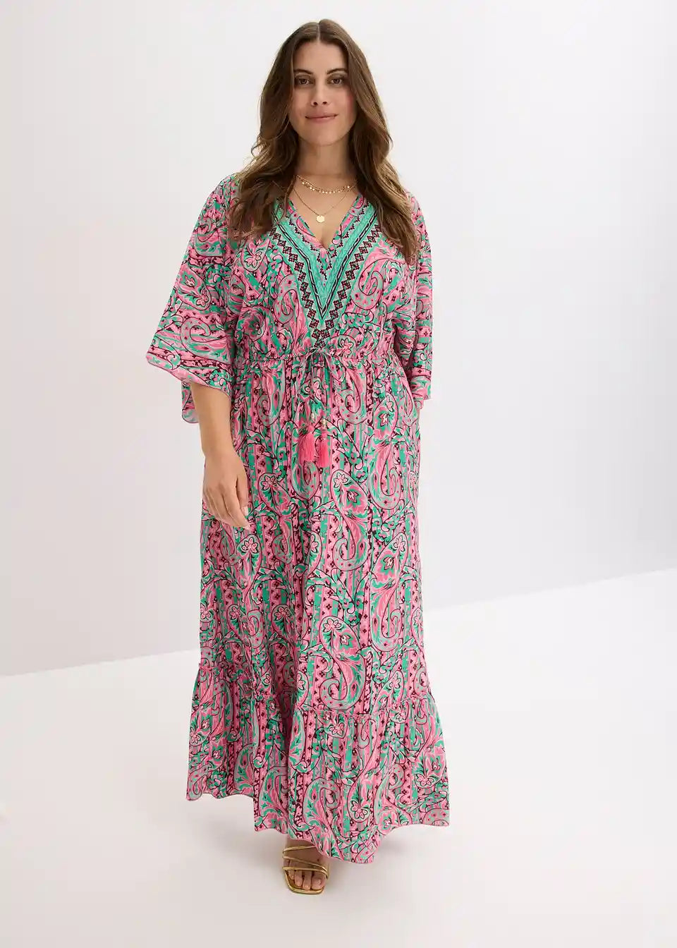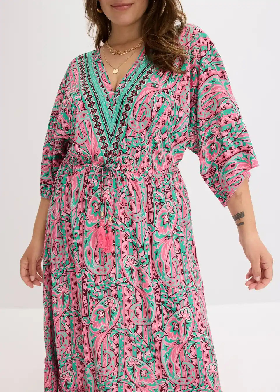bedrucktes Maxikleid aus fließender Viskose mit dekorativen Bindebändern mit Quasten vorne in der Taille und weitem Rock