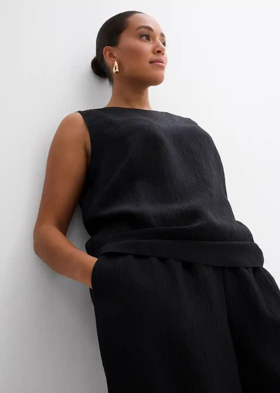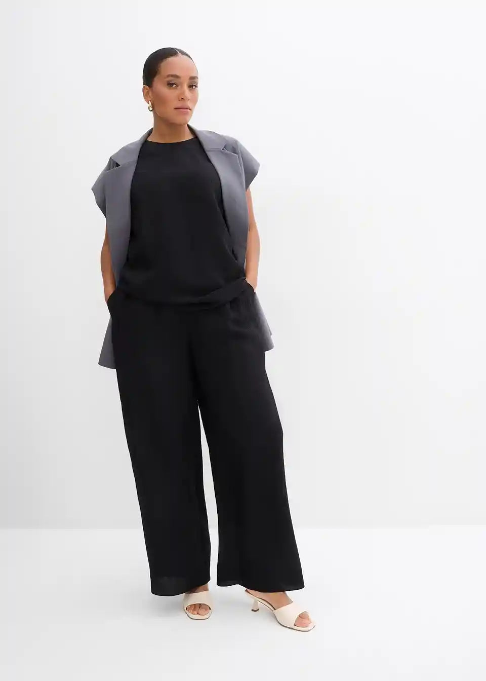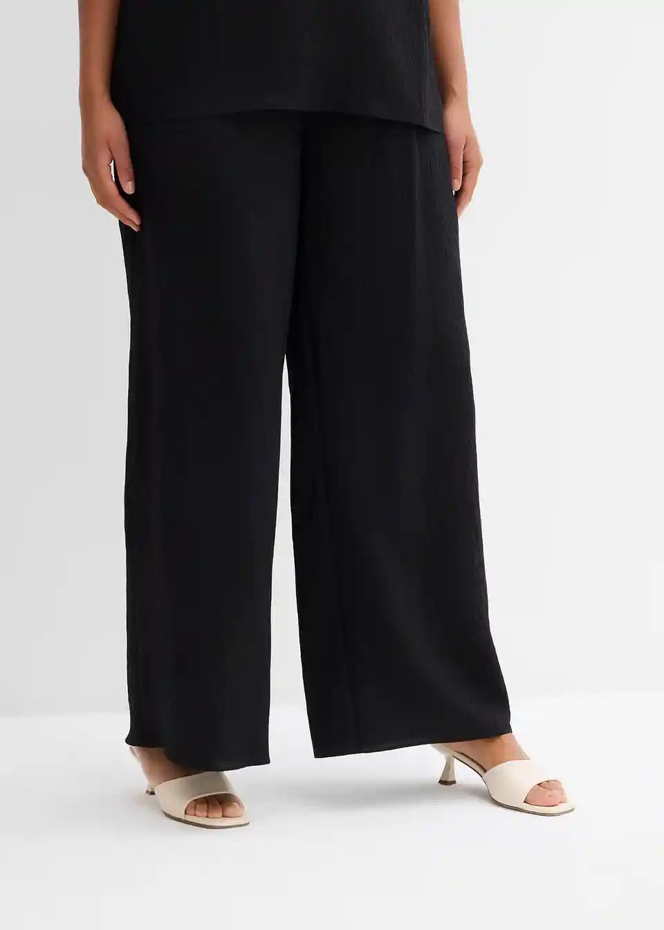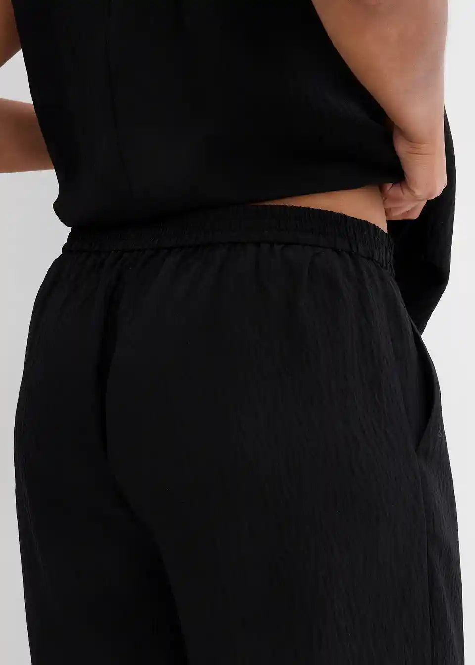 High-waist Hose mit elastischem Bund, seitlichen Taschen und weitem Bein aus strukturiertem Crinkle