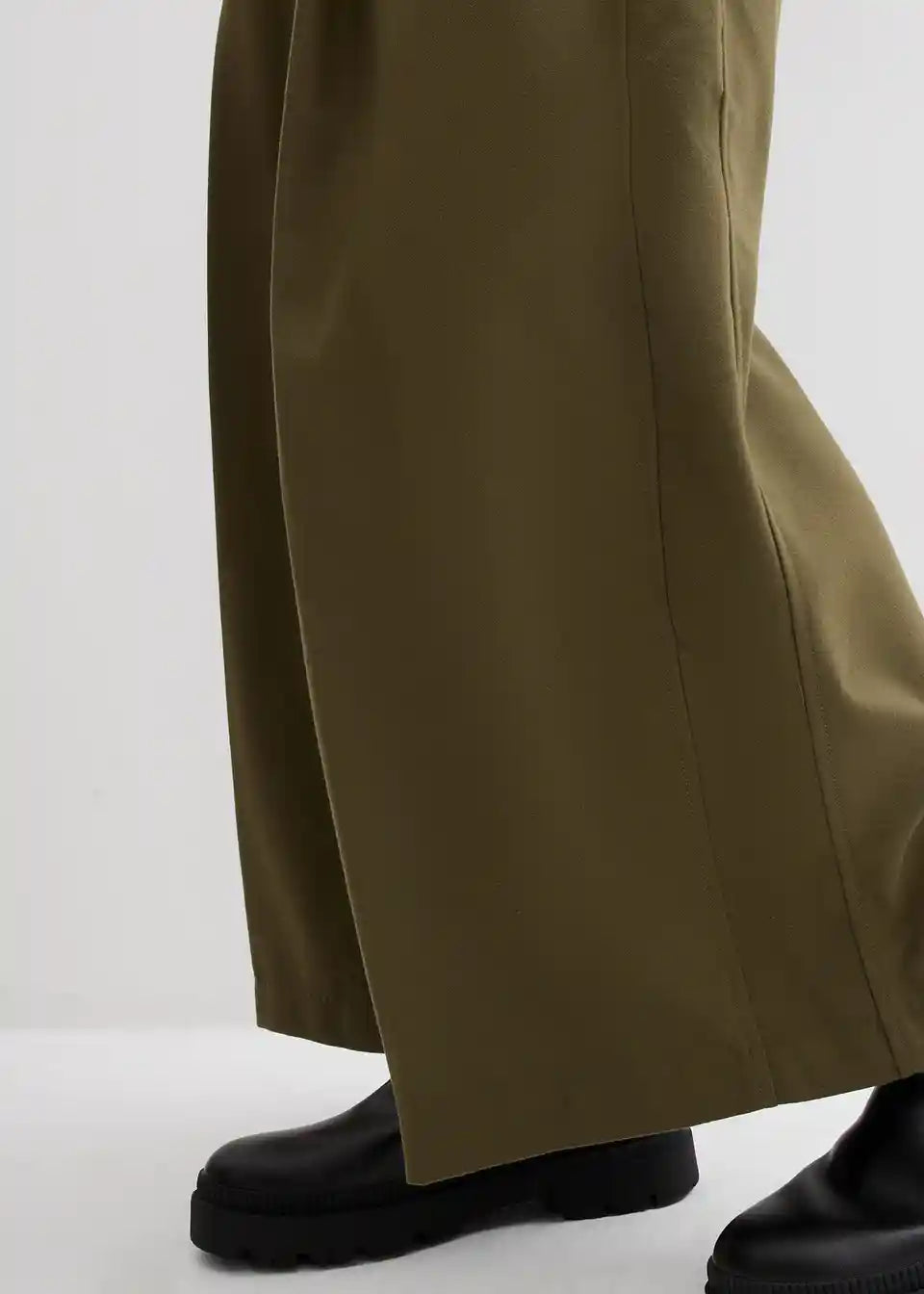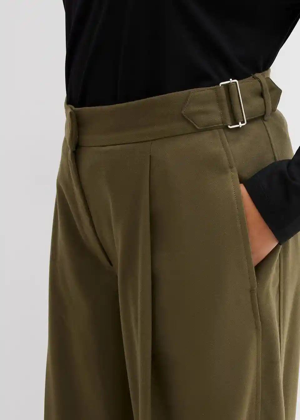 Locker geschnittene Hose mit Bundfalten und Bügelfalte vorne und hinten. Dezente Seitentaschen und ein verstellbarer Riegel mit Metallschnalle an beiden Seiten des Bunds.