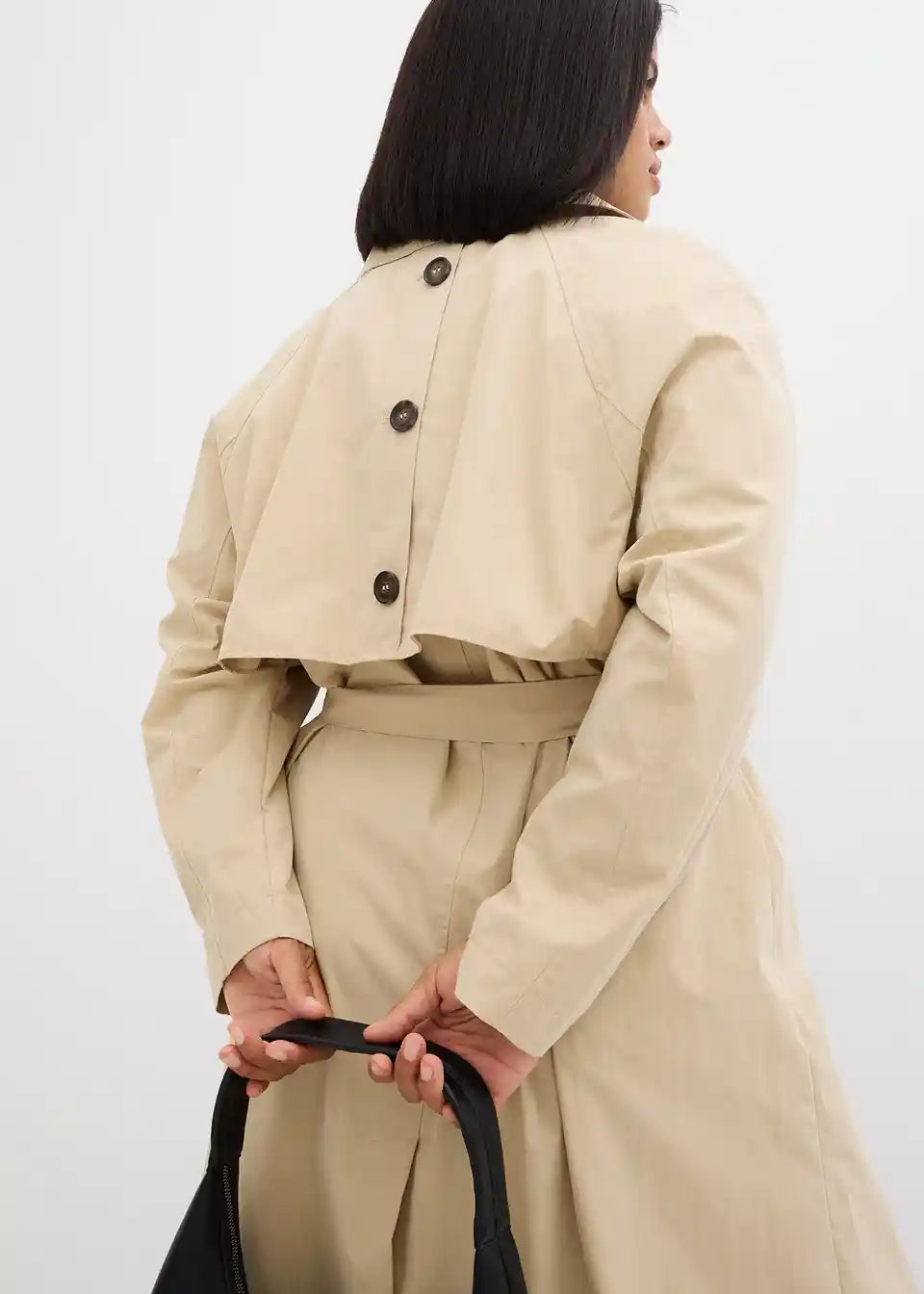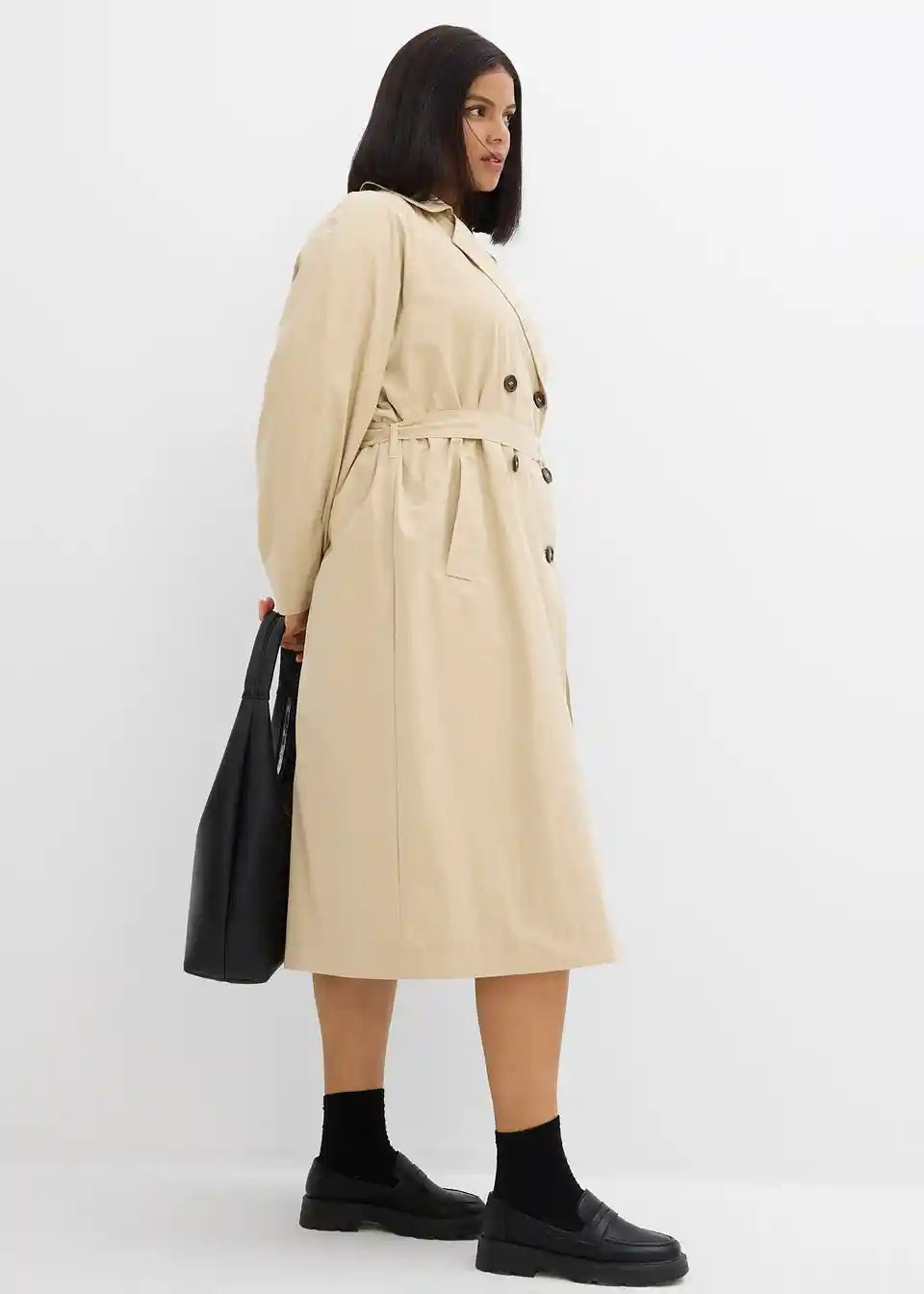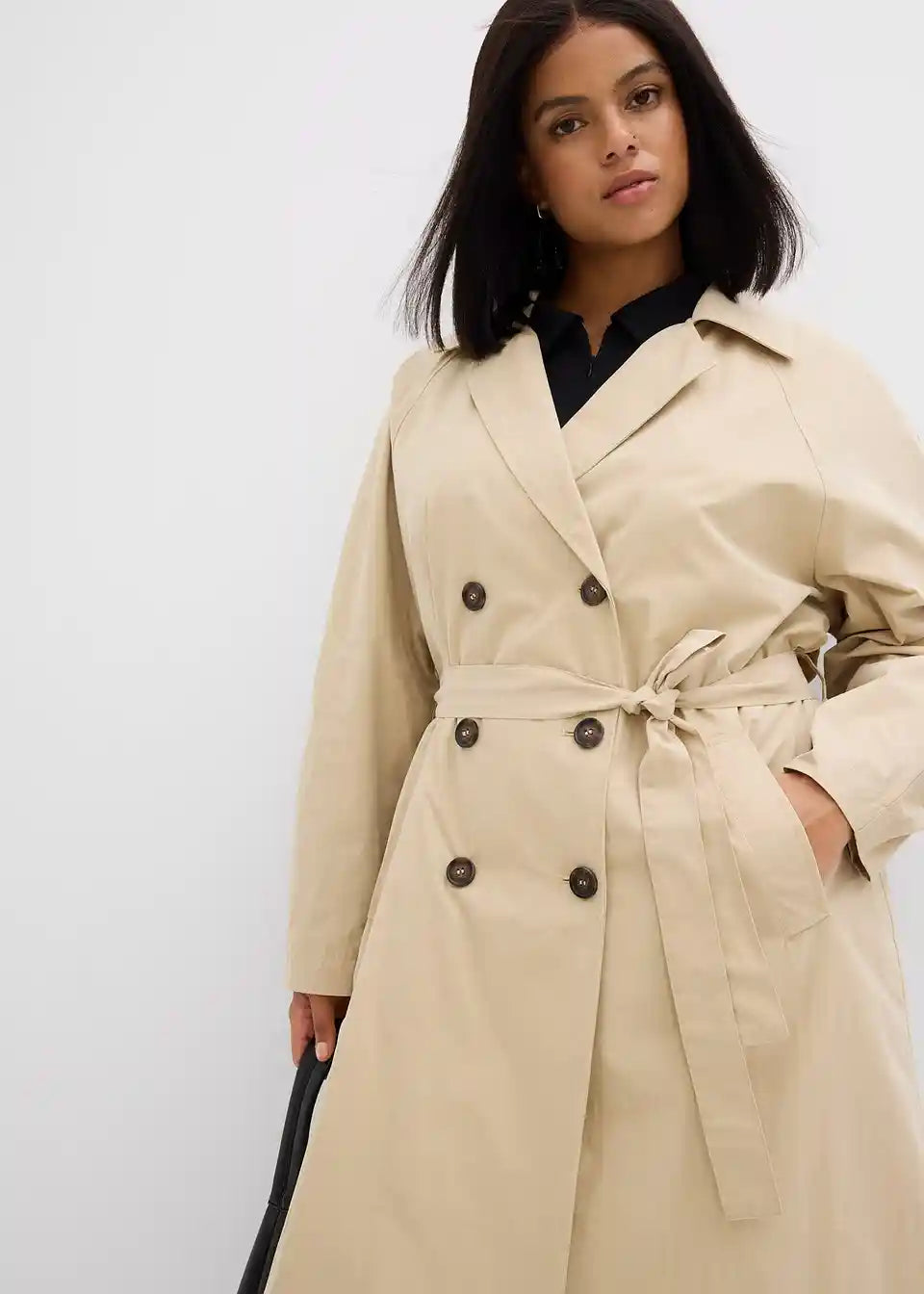 Zweireihiger Trenchcoat mit Bindegürtel in der Taille sowie schrägen Leistentaschen