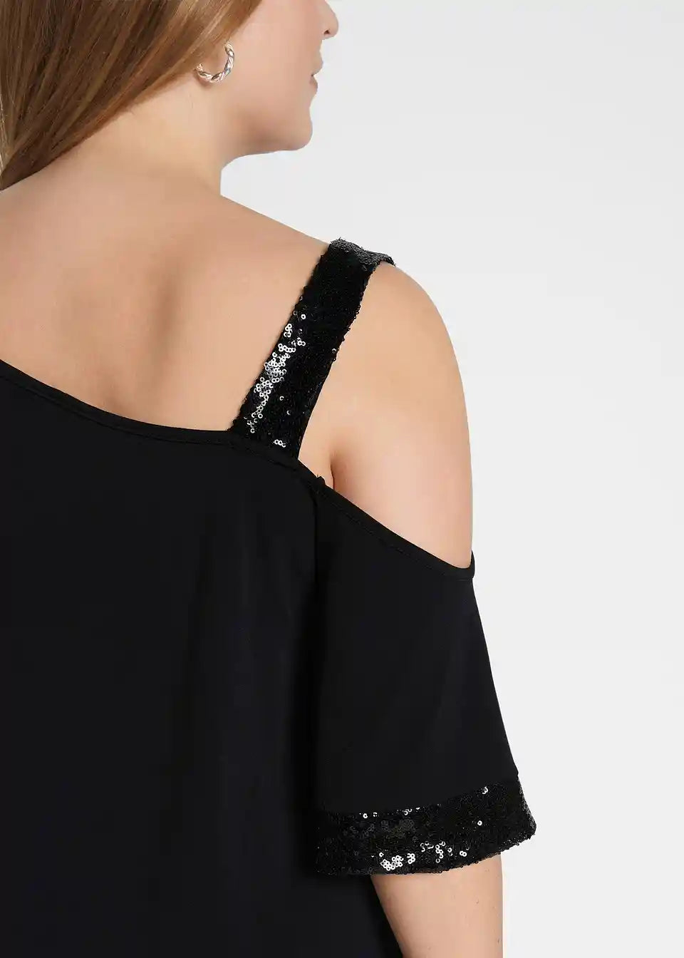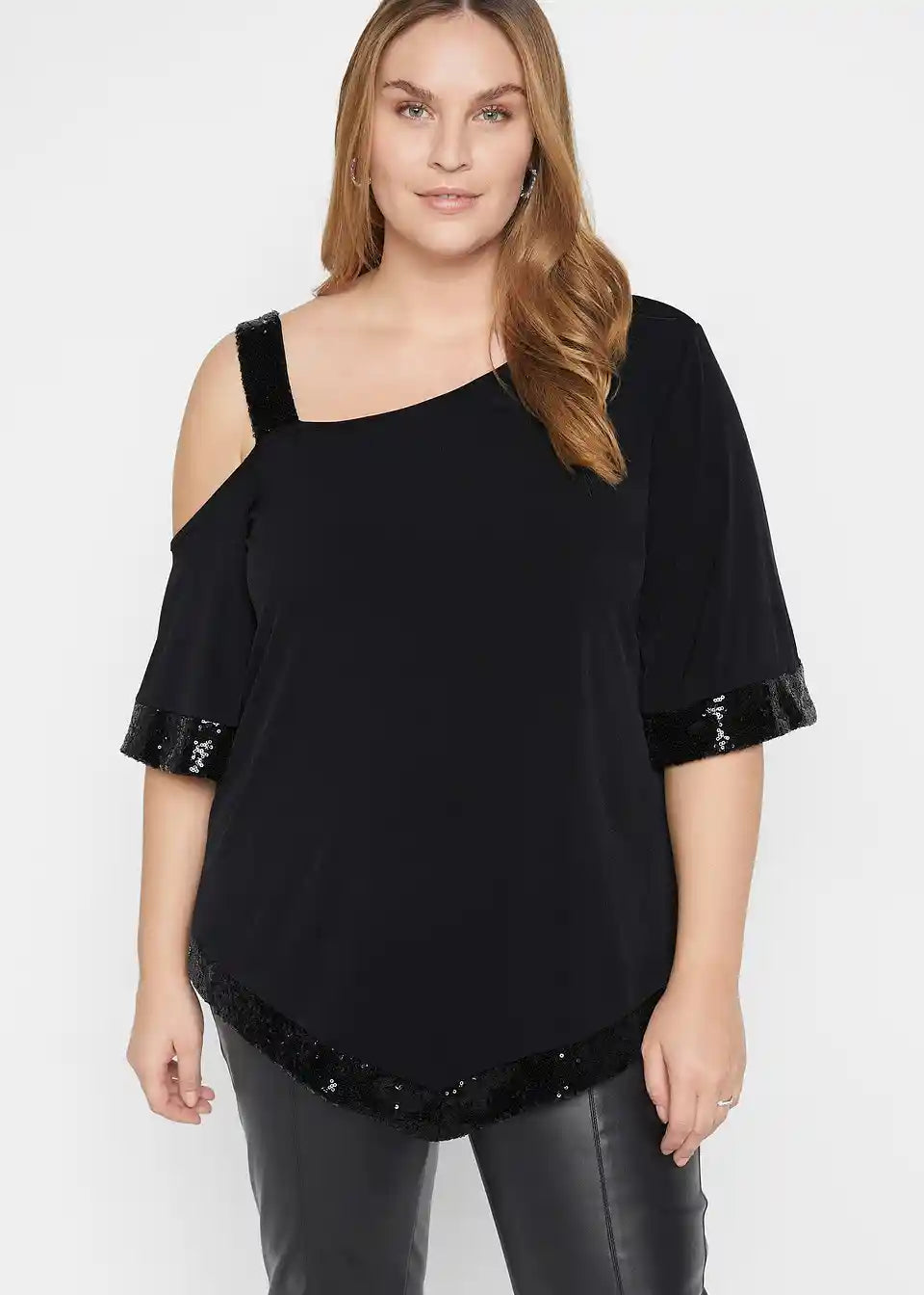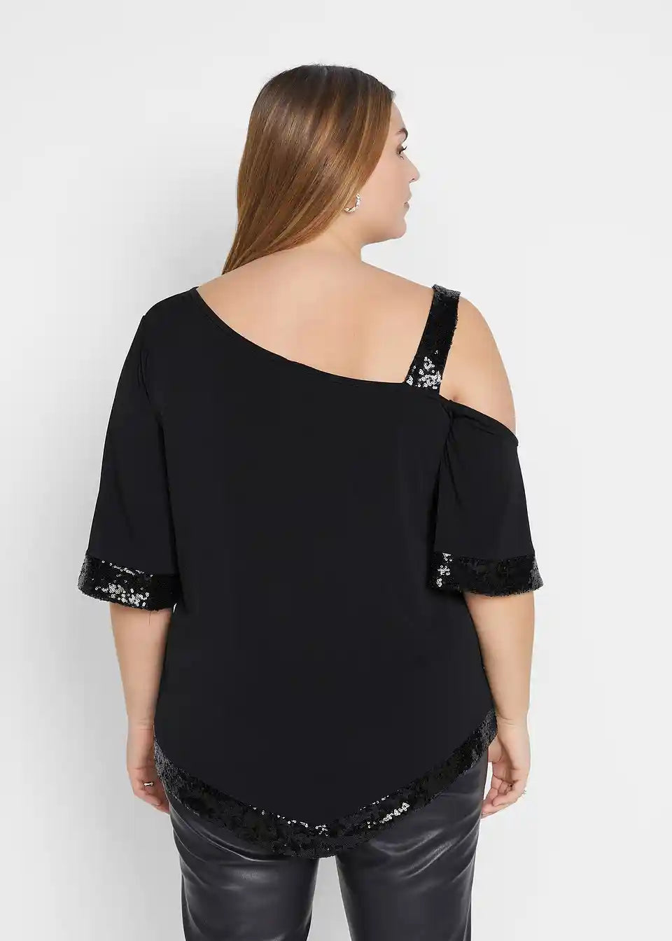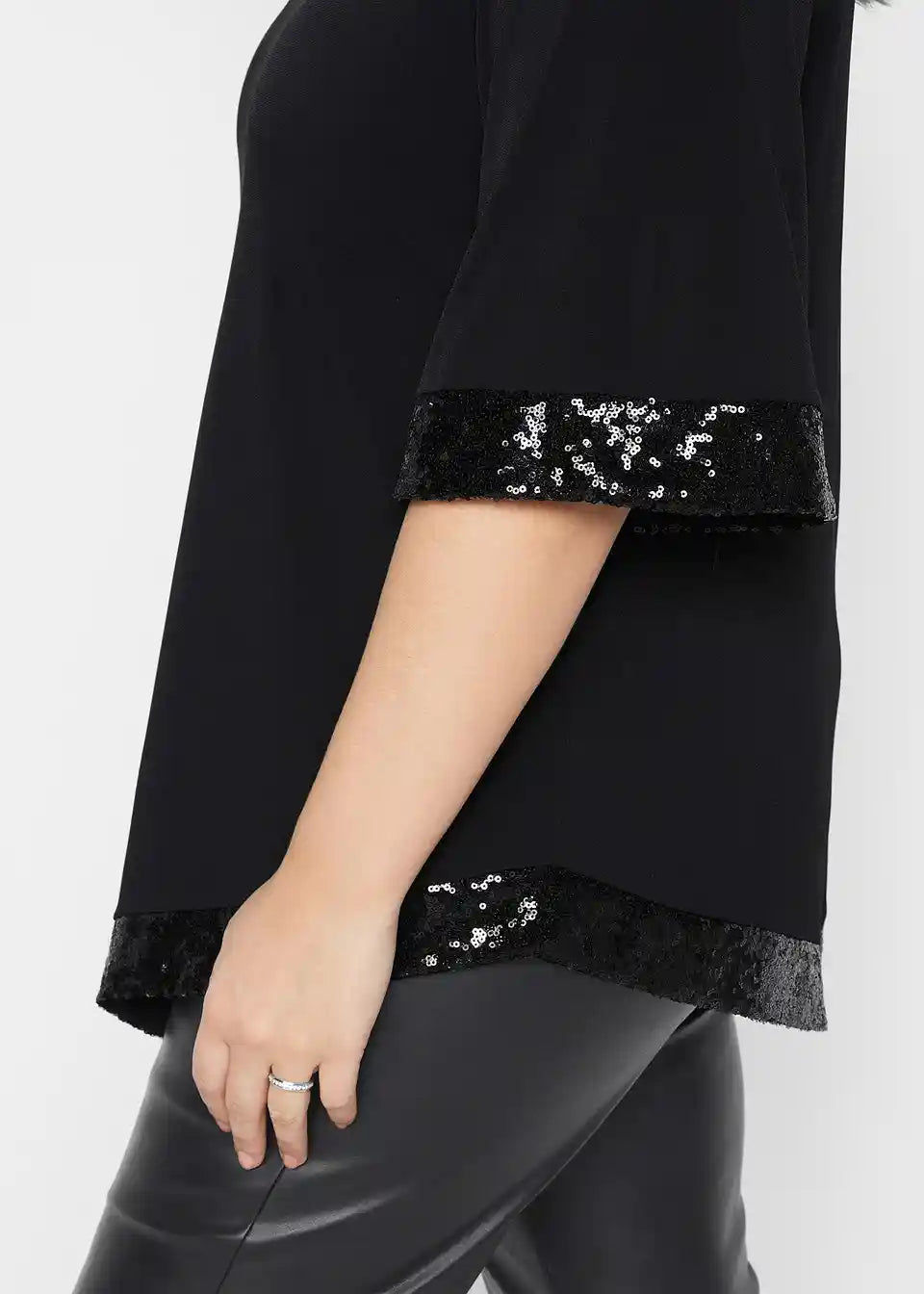 Tunika-Shirt mit asymmetrischen Schnitt, weiter geschnittenem Ärmel und Spitz zulaufendem Saum. Pailletten Details.