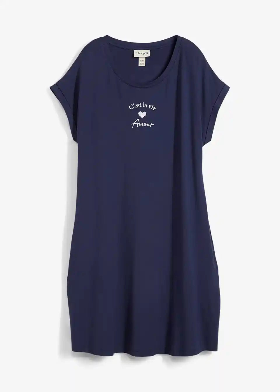 Jersey-Kleid mit Stickerei. Das Das Kleid hat einen Rundhalsausschnitt, eine lockere und bequeme Passform und einen runden Saum