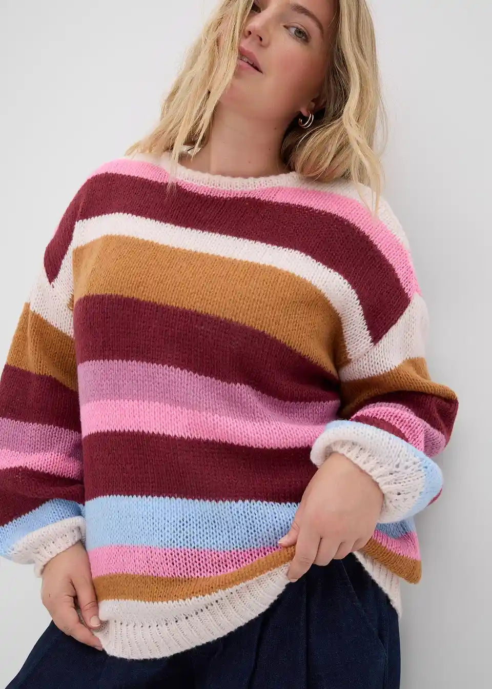 Hüftbedeckender Strickpullover mit überschnittener Schulter und Rundhalsausschnitt. Weite Passform.