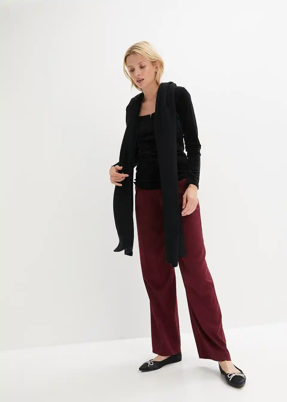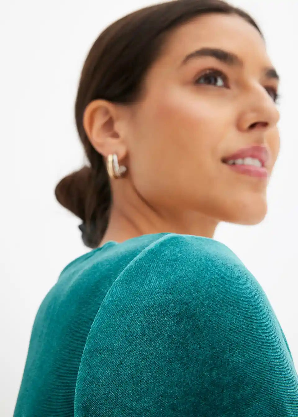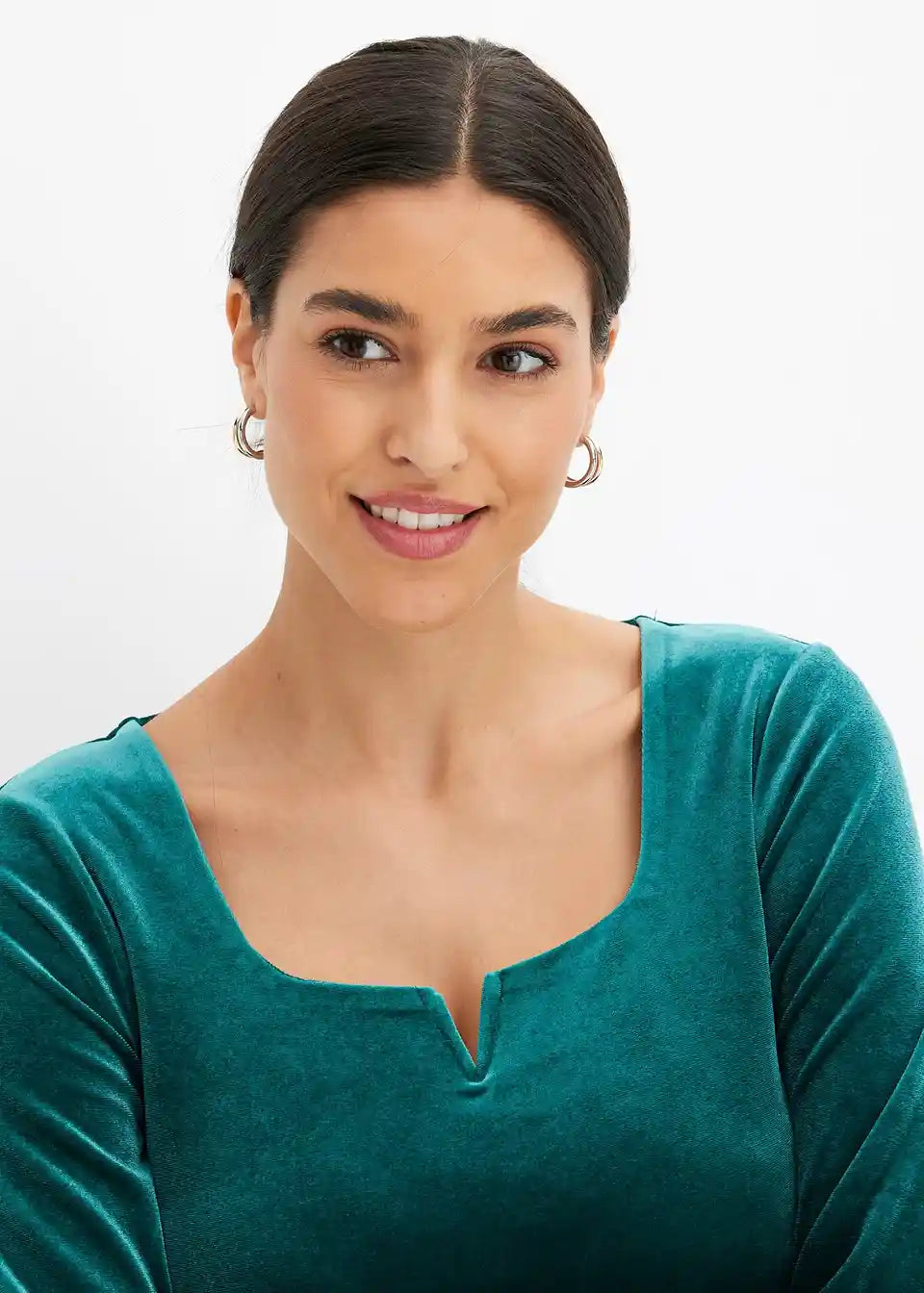 Feminines Shirt in Samtoptik mit tiefem Carré-Ausschnitt sowie Schlitz