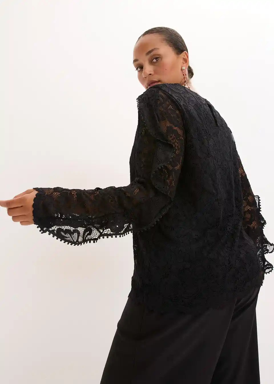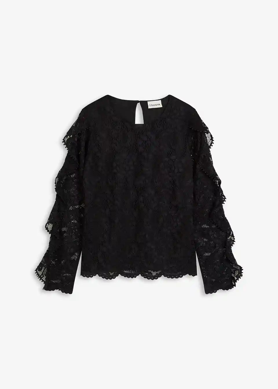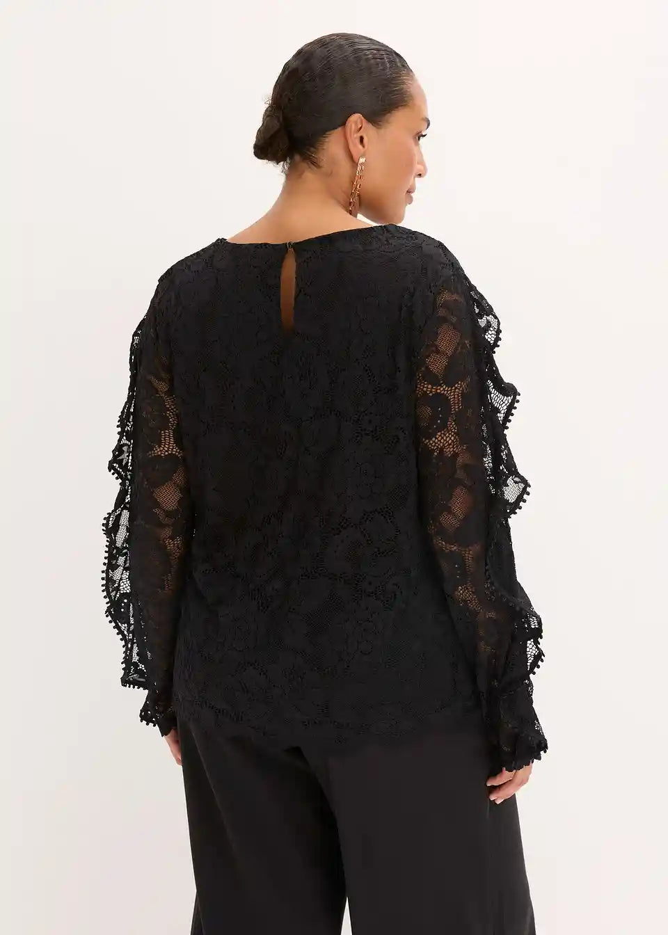 feminine Spitzen-Shirtbluse mit dekorativen Spitzen-Volants am Ärmel und Knopf-Verschluss hinten am Ausschnitt