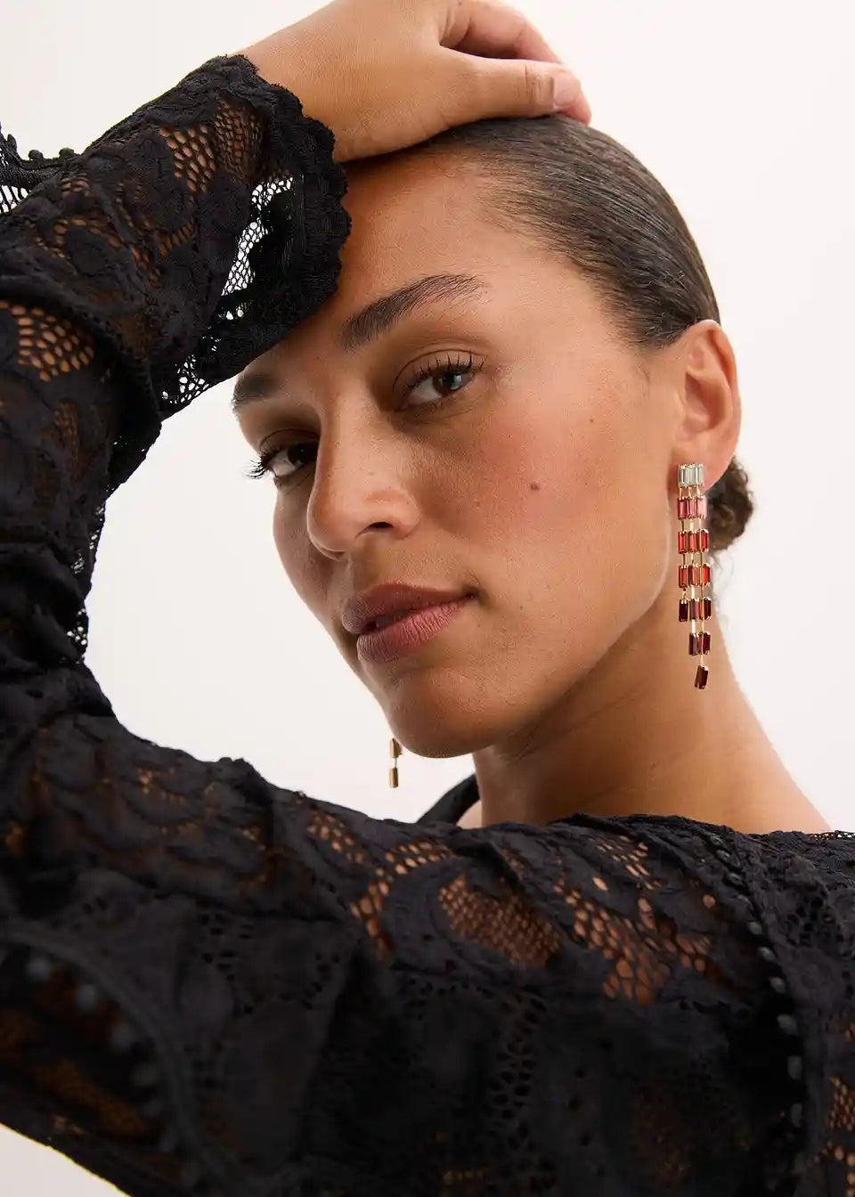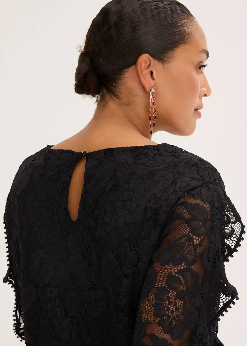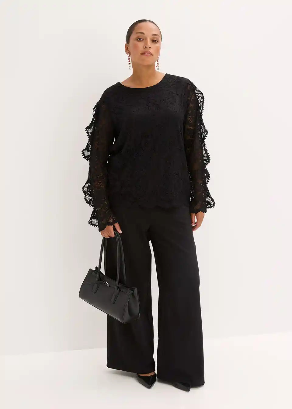 feminine Spitzen-Shirtbluse mit dekorativen Spitzen-Volants am Ärmel und Knopf-Verschluss hinten am Ausschnitt