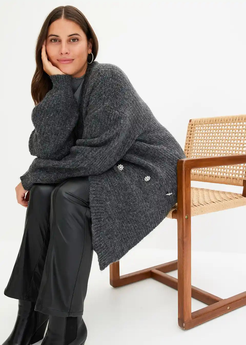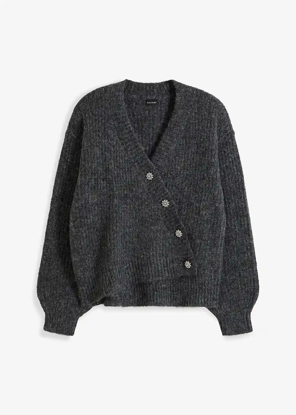 feminine Strickjacke mit asymmetrischem Verschluss vorne und dekorativen Strass-Knöpfen