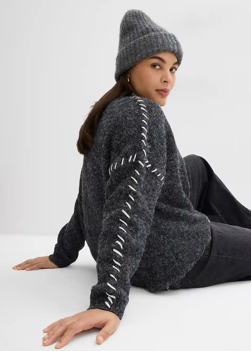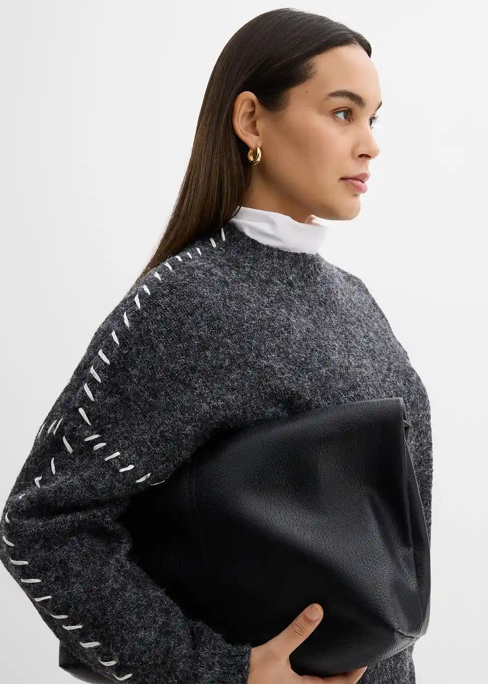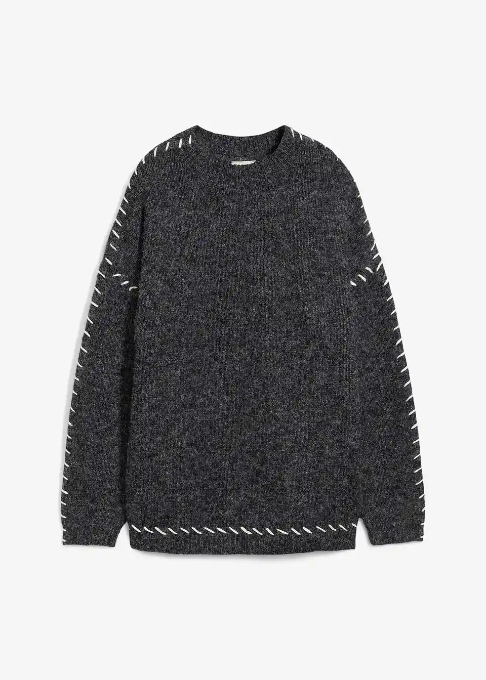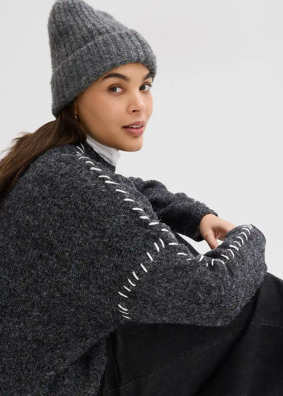 Strickpullover in hüftbedeckender Länge. Ein Rundhalsmodell mit überschnittener Schulter und Kontrastnahtdetail.