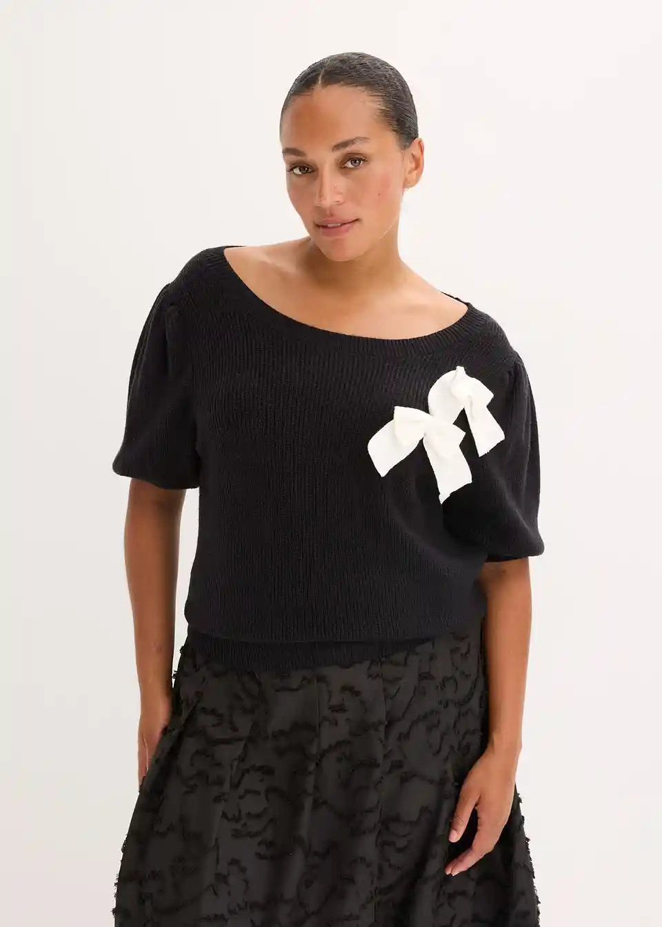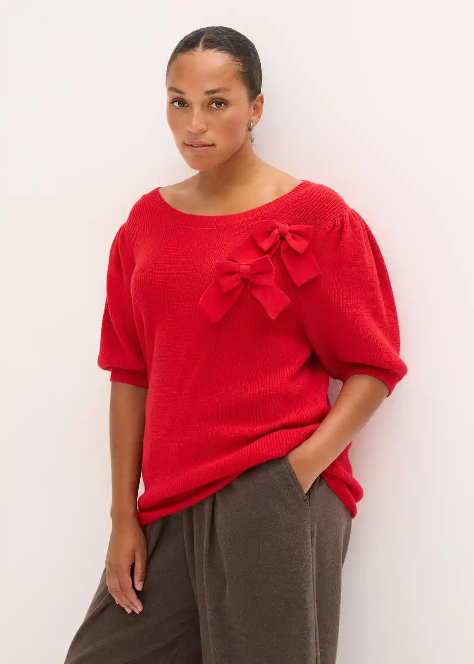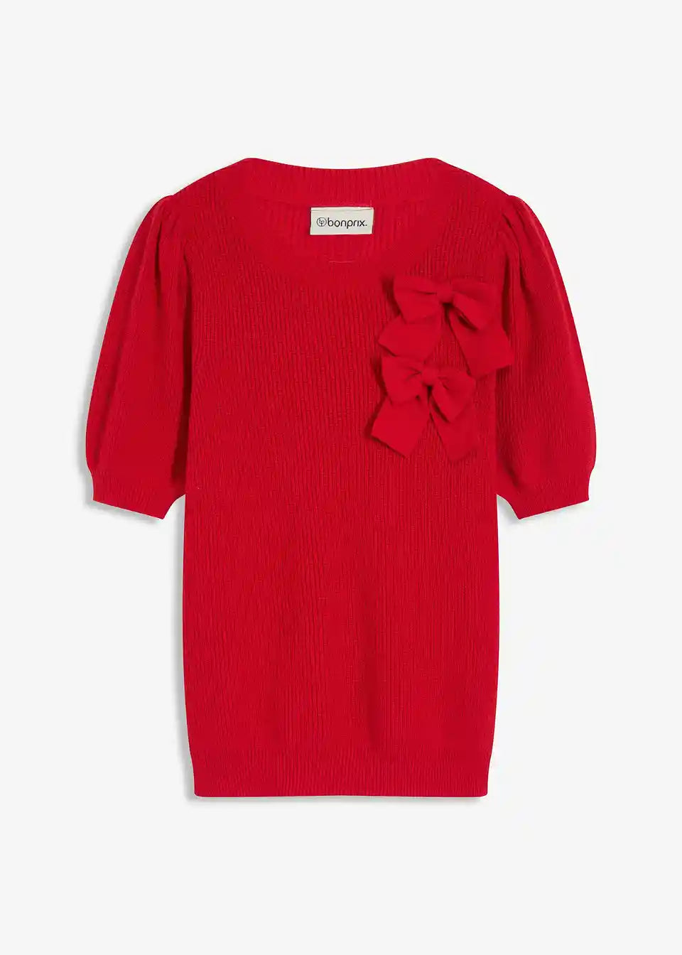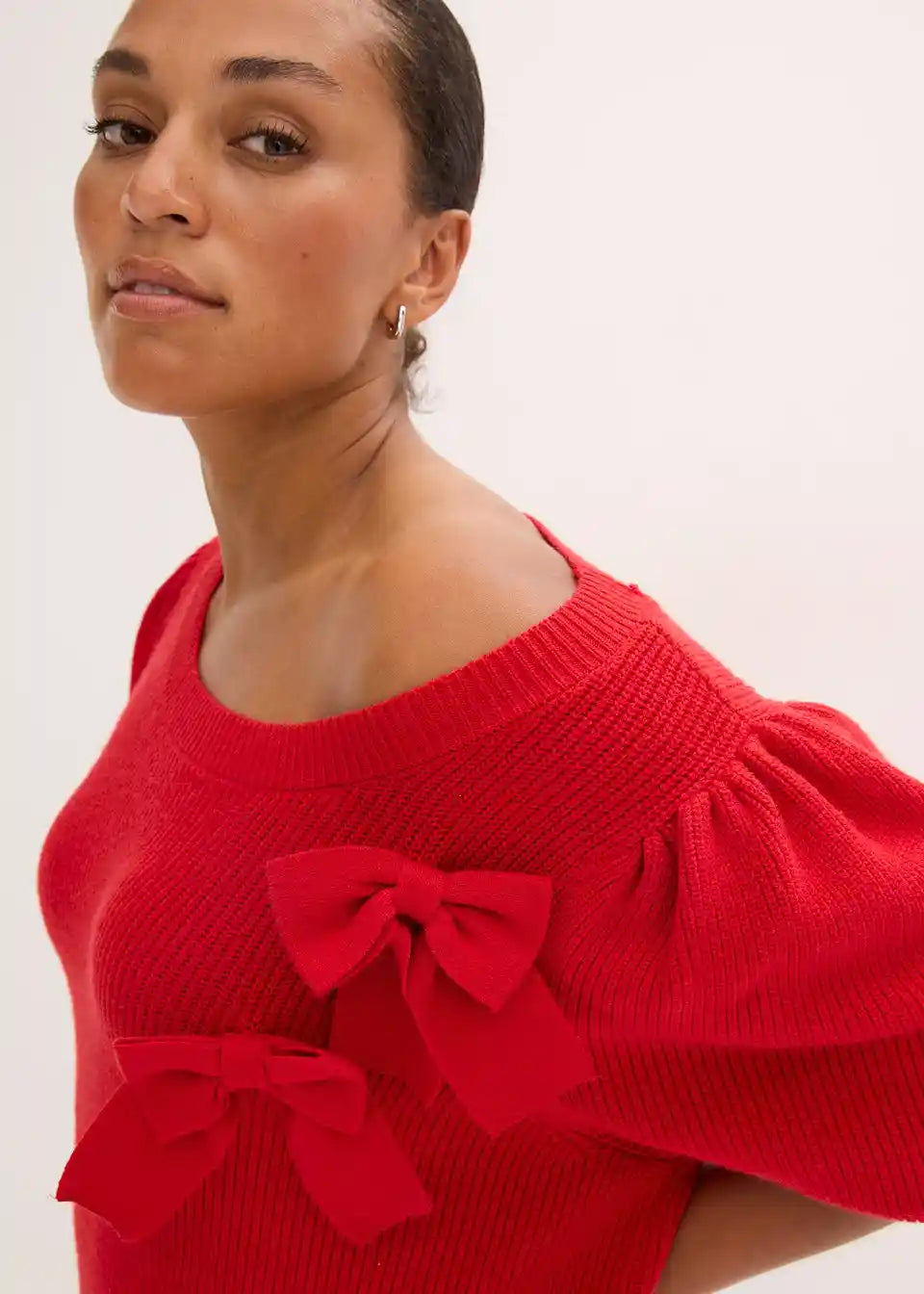modischer Pullover mit Puffärmeln und dekorativer Schleifen-Applikation vorne