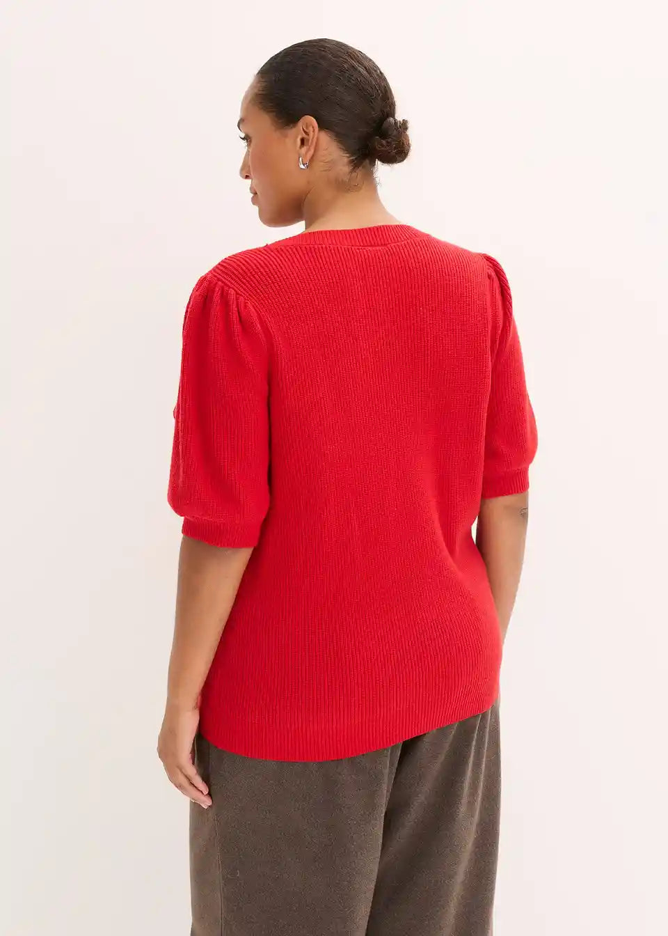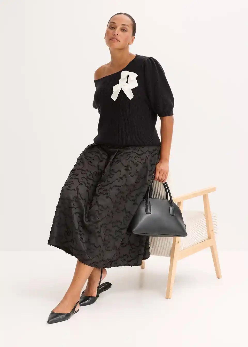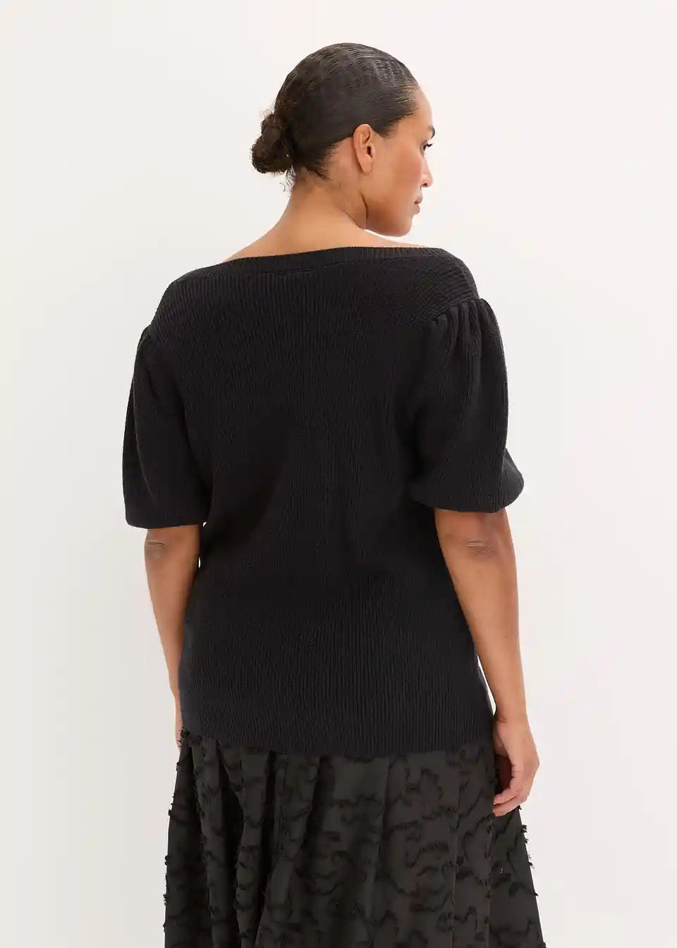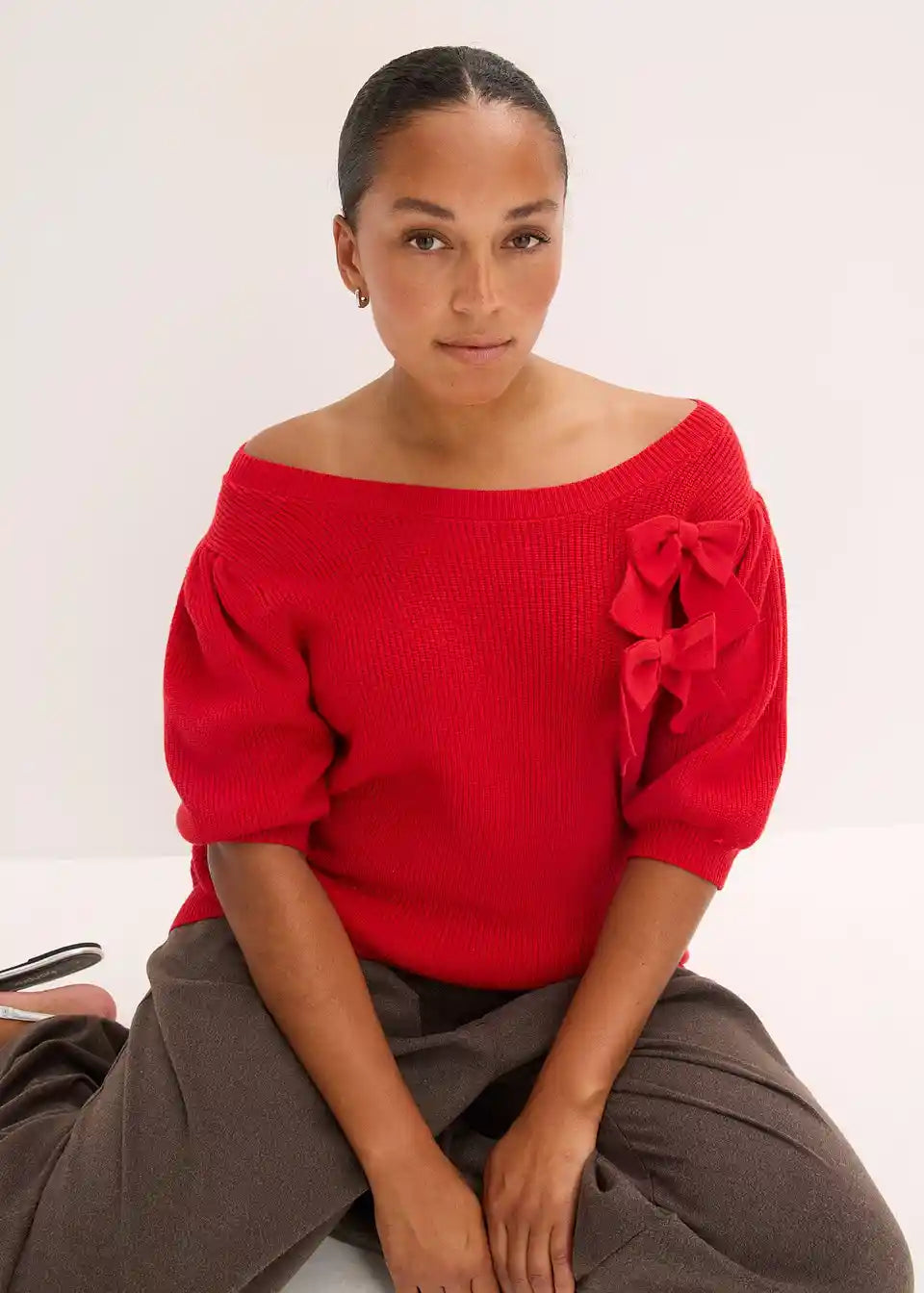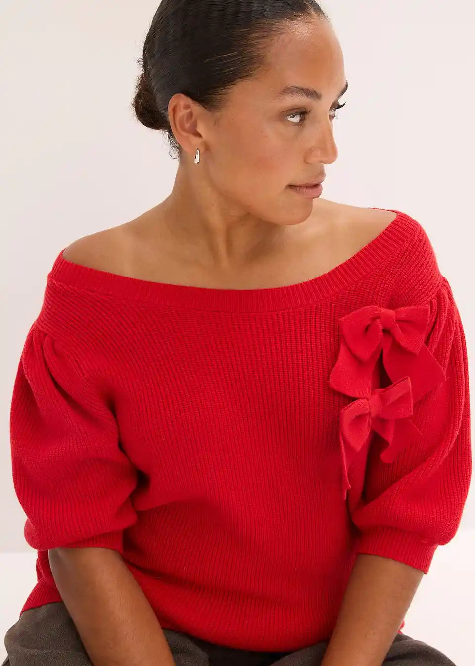 modischer Pullover mit Puffärmeln und dekorativer Schleifen-Applikation vorne