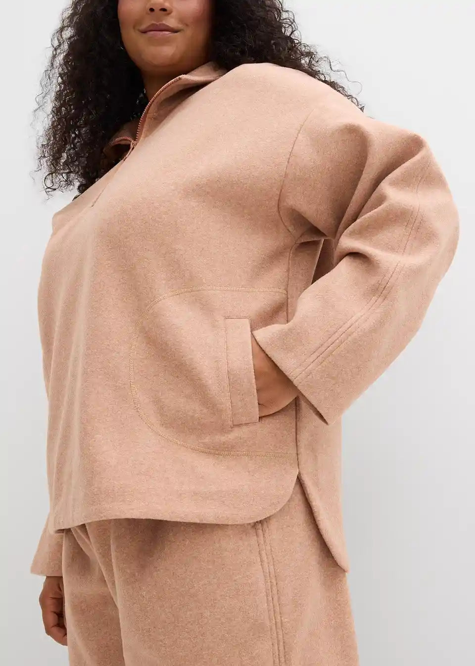 Oversize-Pullover mit hohem Stehkragen und Kurzreißverschluss. Überschnitten Schultern und seitliche Eingriffstaschen.