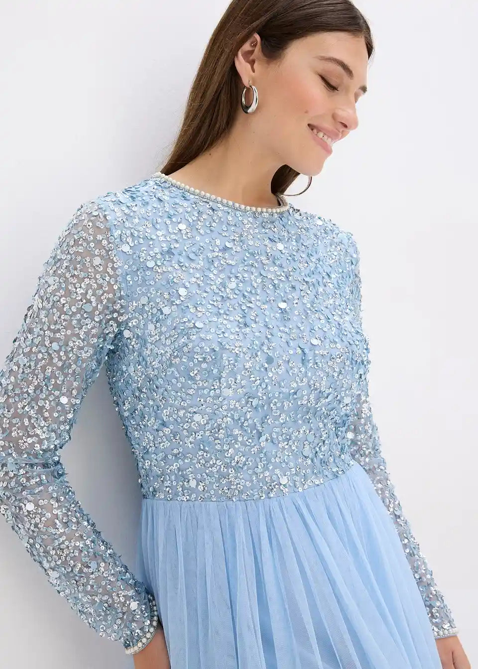 Modern und feminin: Abendkleid mit Paillettenstickerei und Perlenbesatz an den Ärmel sowie am Ausschnitt.