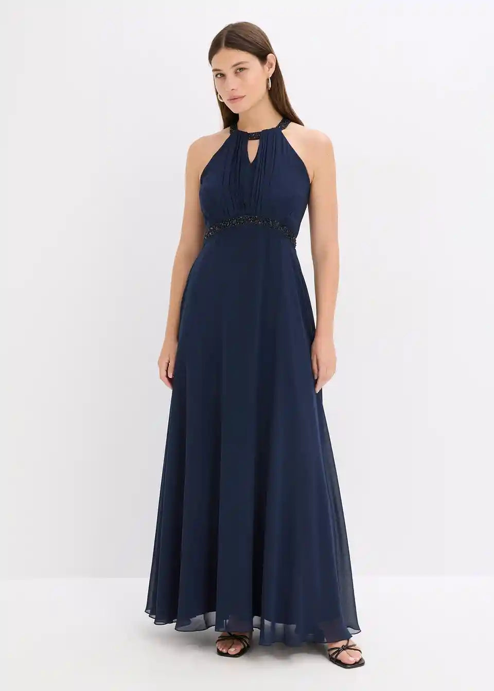 Modern und feminin: Abendkleid in Maxi-Länge mit Perlen-Applikation am Ausschnitt und Unterbrust-Einsatz.