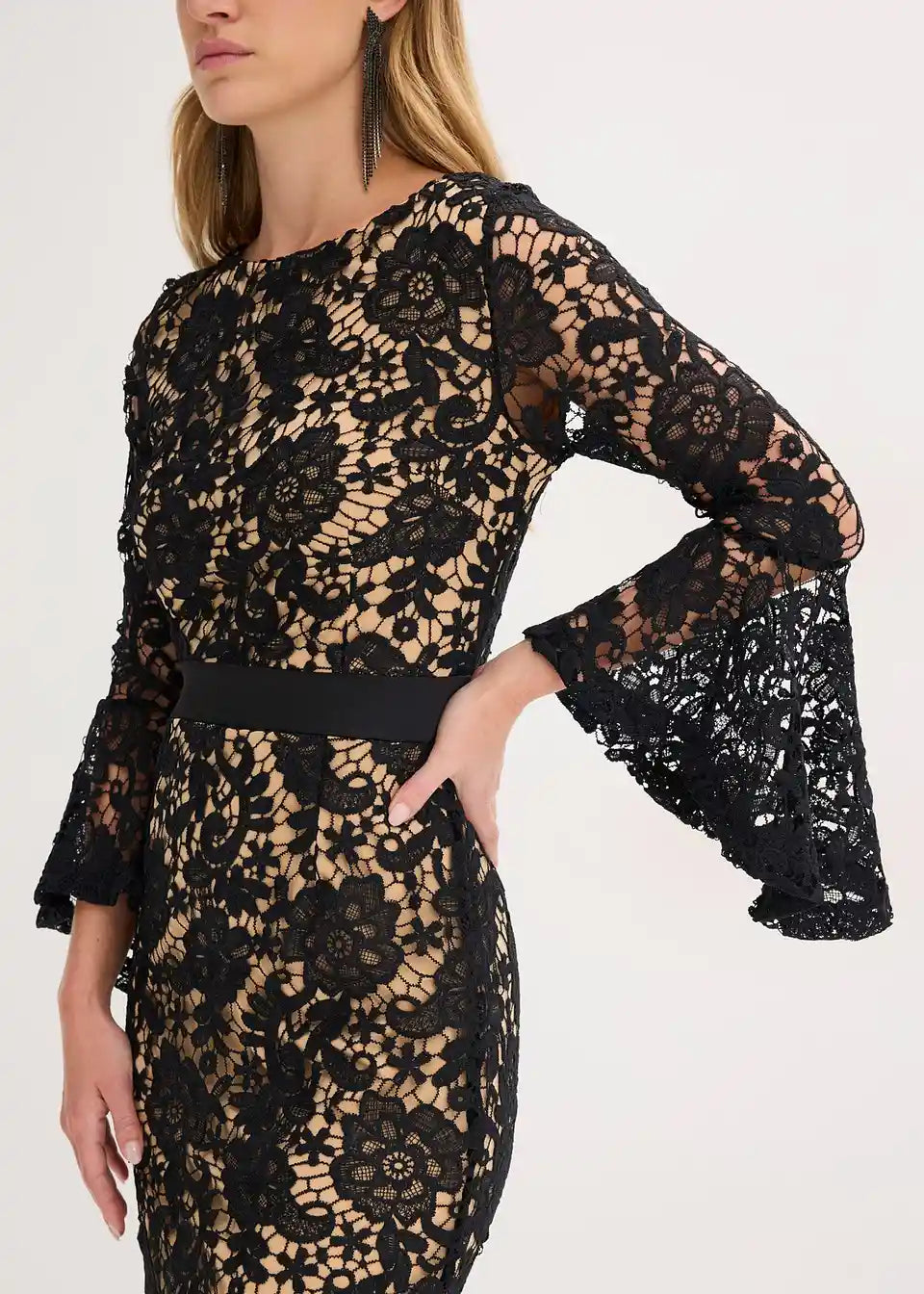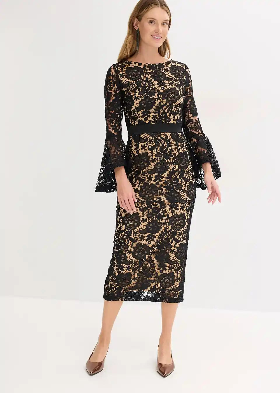 Modern und feminin: Abendkleid in aus bezaubernder Spitze in Midi-Länge mit Satin-Einsatz in der Taille und Volant-Ärmel