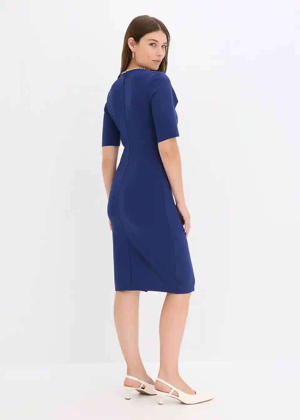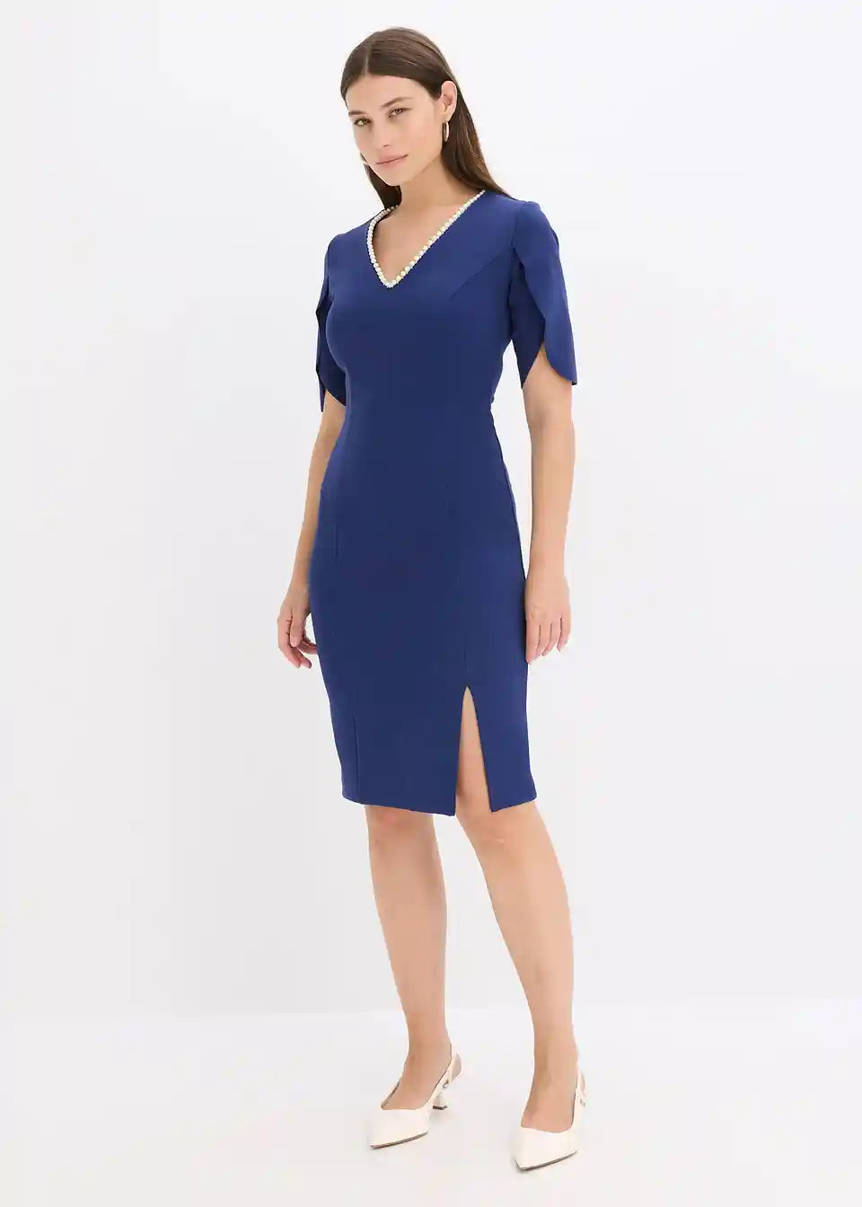 Klassisch und feminin: Etui-Kleid in knieumspielender Länge mit Perlenbesatz am Ausschnitt